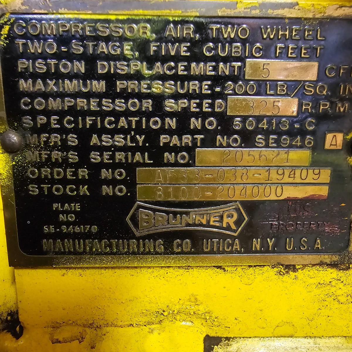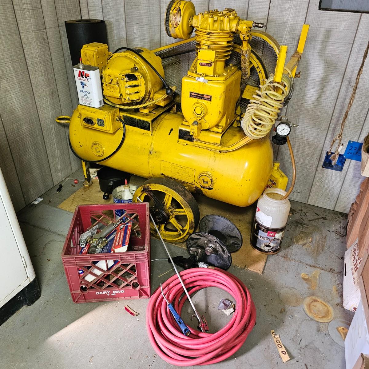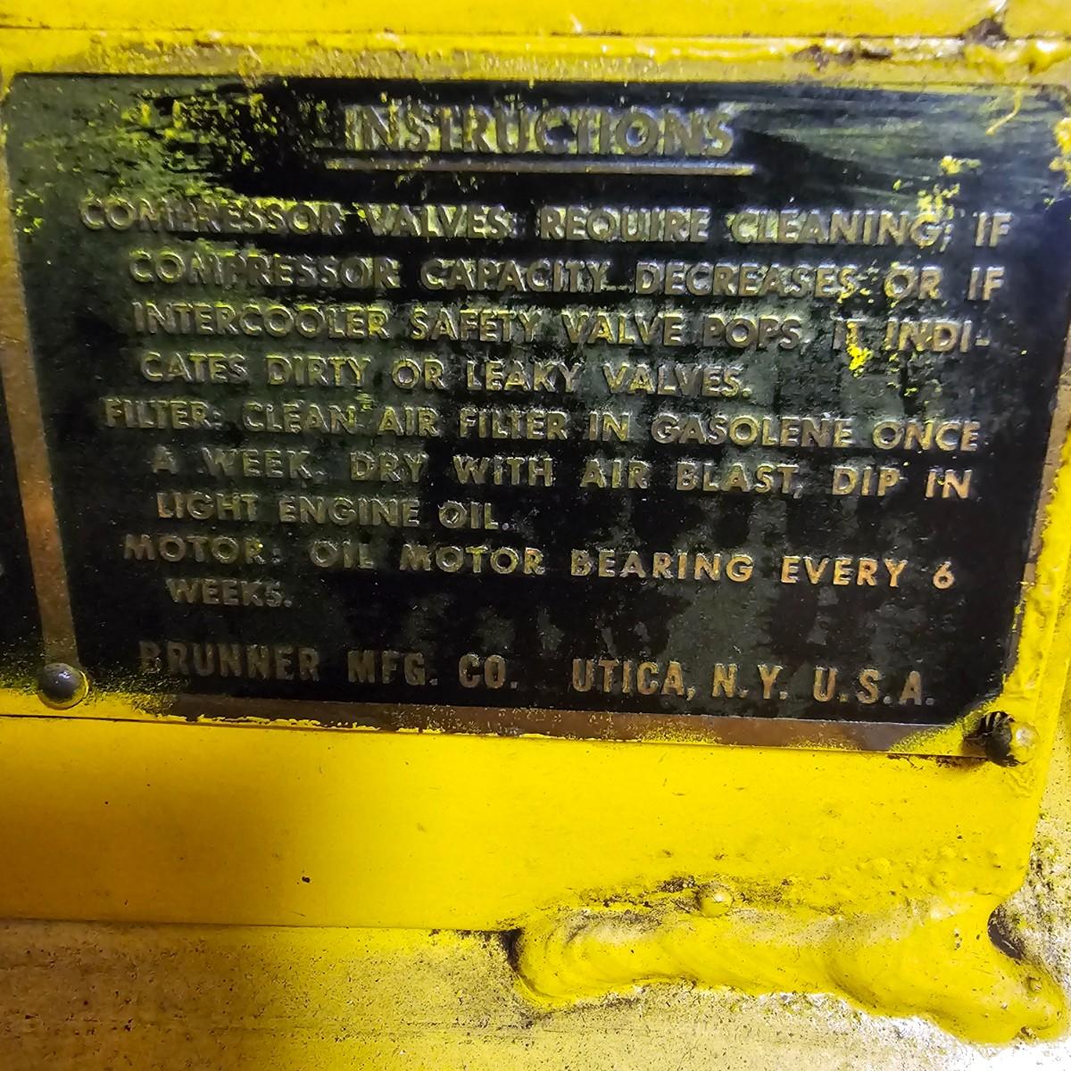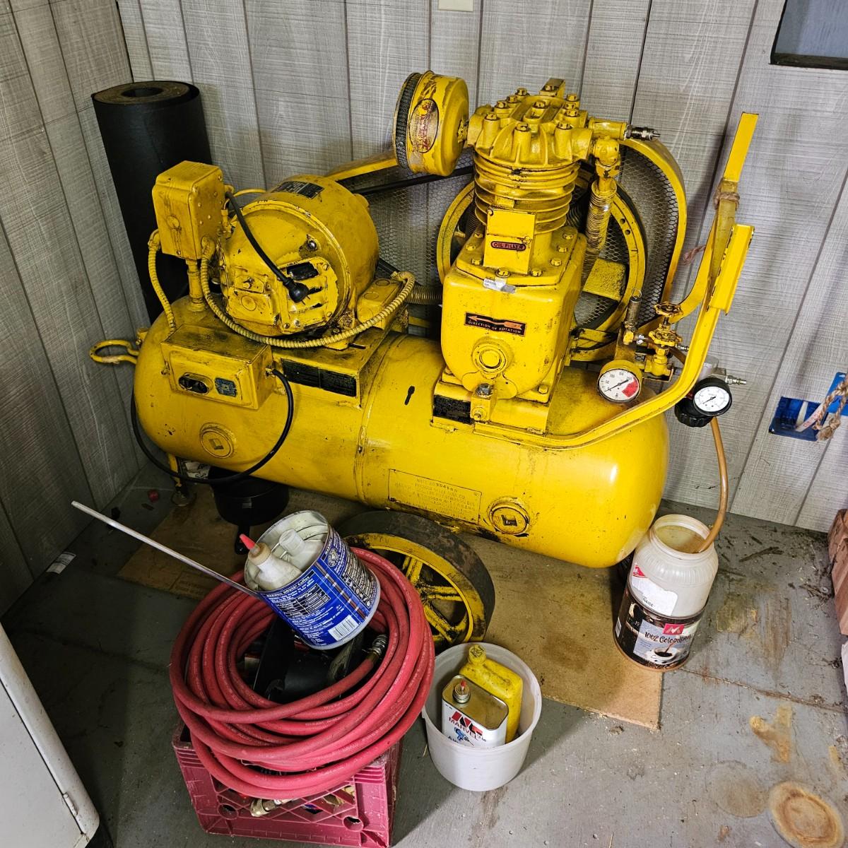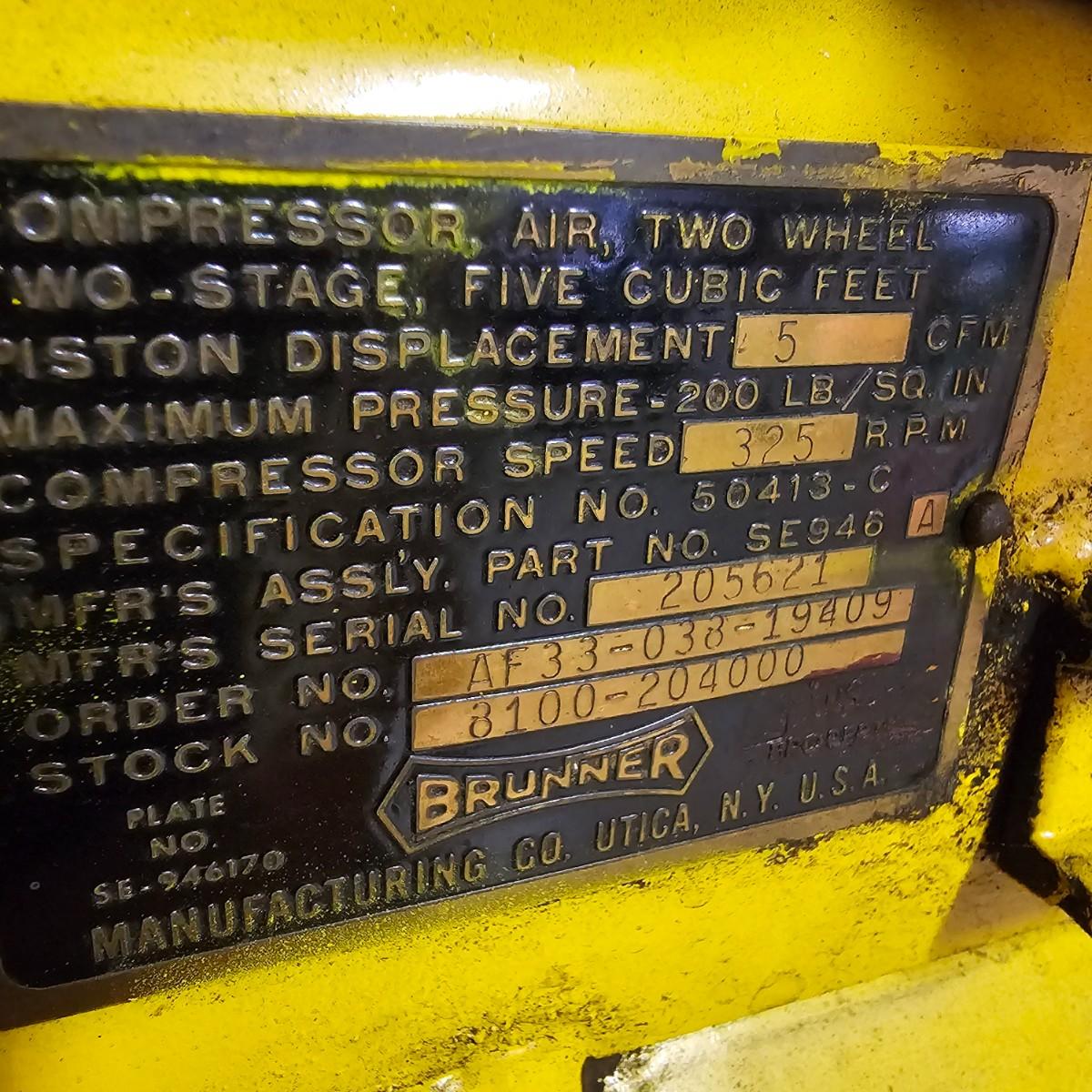 Vintage Brunner 200 psi air compressor and lots of accessories. Built in 1951, this machine has cast-iron wheels, two-stage compressor, cast iron frame and more. Powered by a Peerless Electric 1hp motor with a double belt drive flywheel. It appears to have at least a 40 gallon tank, and the builders plate indicates 5CFM. Currently wired for 120 volts, can also be used on 220. Measures 53 " x 26" x 44"H, painted in bright yellow. Includes a 50 foot hose, three air nozzles, a 1/2" impact wrench, a 3/8" ratchet, a drill and a grinder unit, as well as several coupling connectors. None of the small tools have been tested, but the compressor started and ran when plugged in. Also some tool oil and other lubricants (we cannot guarantee the contents). See photos for details.