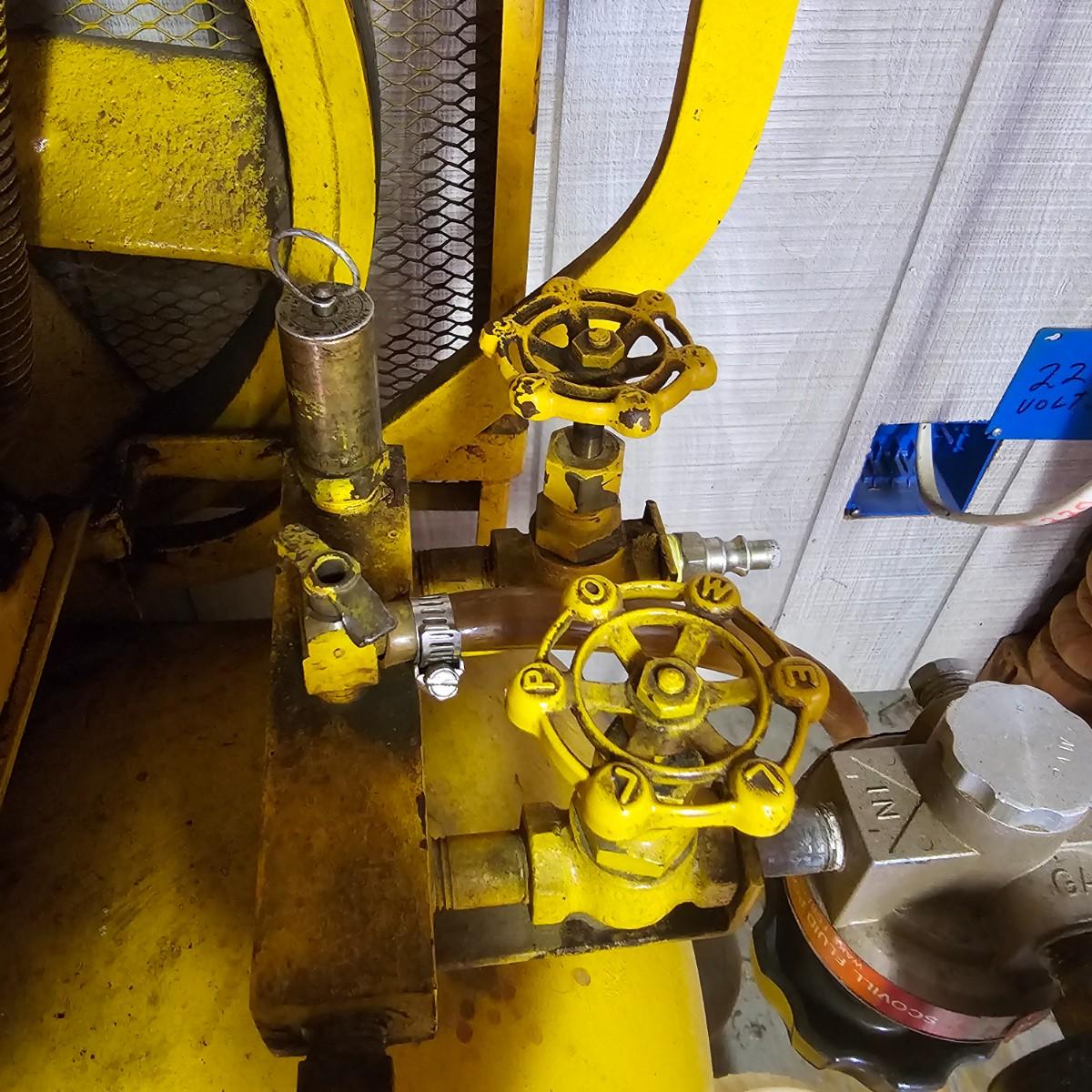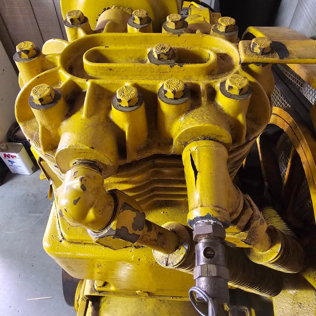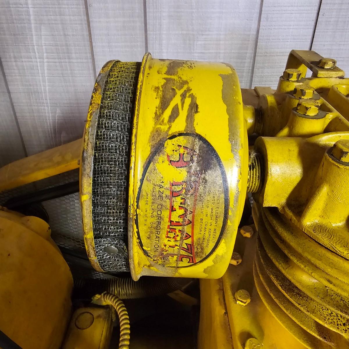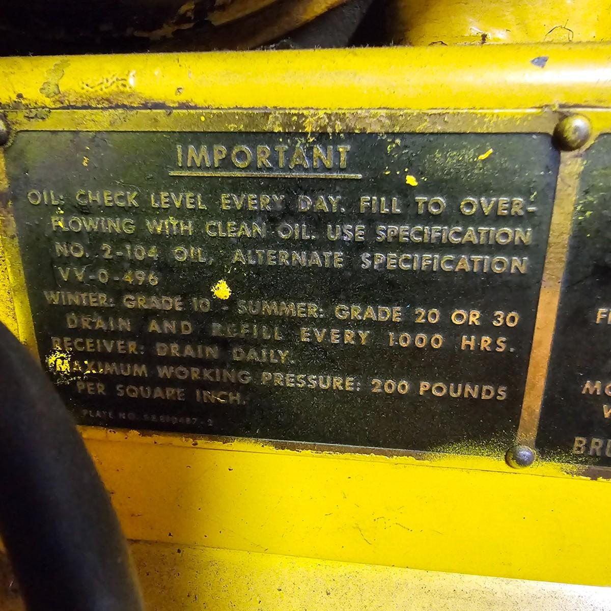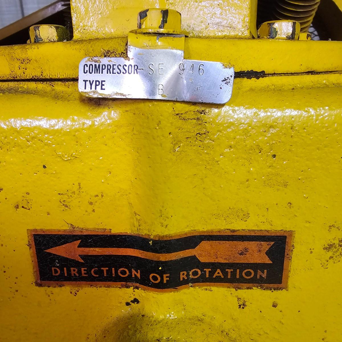 Vintage Brunner 200 psi air compressor and lots of accessories. Built in 1951, this machine has cast-iron wheels, two-stage compressor, cast iron frame and more. Powered by a Peerless Electric 1hp motor with a double belt drive flywheel. It appears to have at least a 40 gallon tank, and the builders plate indicates 5CFM. Currently wired for 120 volts, can also be used on 220. Measures 53 " x 26" x 44"H, painted in bright yellow. Includes a 50 foot hose, three air nozzles, a 1/2" impact wrench, a 3/8" ratchet, a drill and a grinder unit, as well as several coupling connectors. None of the small tools have been tested, but the compressor started and ran when plugged in. Also some tool oil and other lubricants (we cannot guarantee the contents). See photos for details.