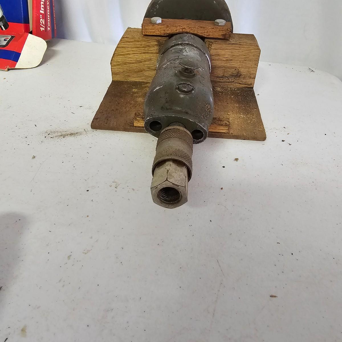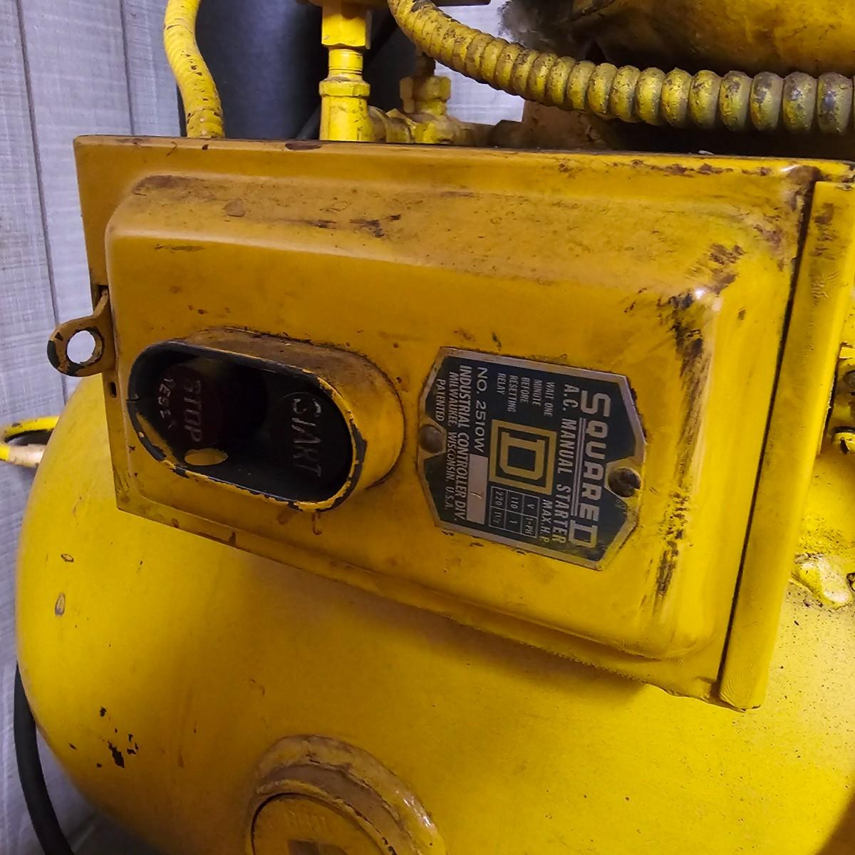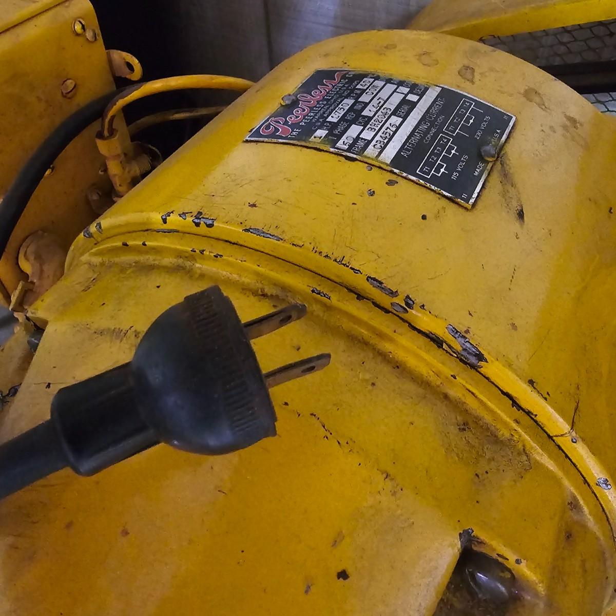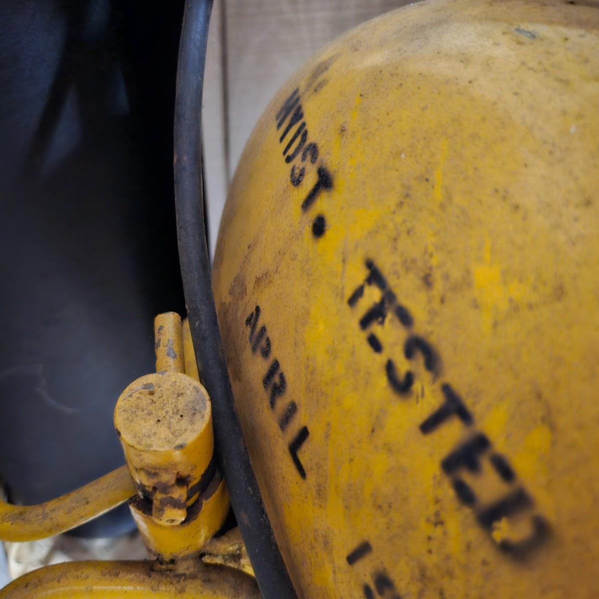 Vintage Brunner 200 psi air compressor and lots of accessories. Built in 1951, this machine has cast-iron wheels, two-stage compressor, cast iron frame and more. Powered by a Peerless Electric 1hp motor with a double belt drive flywheel. It appears to have at least a 40 gallon tank, and the builders plate indicates 5CFM. Currently wired for 120 volts, can also be used on 220. Measures 53 " x 26" x 44"H, painted in bright yellow. Includes a 50 foot hose, three air nozzles, a 1/2" impact wrench, a 3/8" ratchet, a drill and a grinder unit, as well as several coupling connectors. None of the small tools have been tested, but the compressor started and ran when plugged in. Also some tool oil and other lubricants (we cannot guarantee the contents). See photos for details.