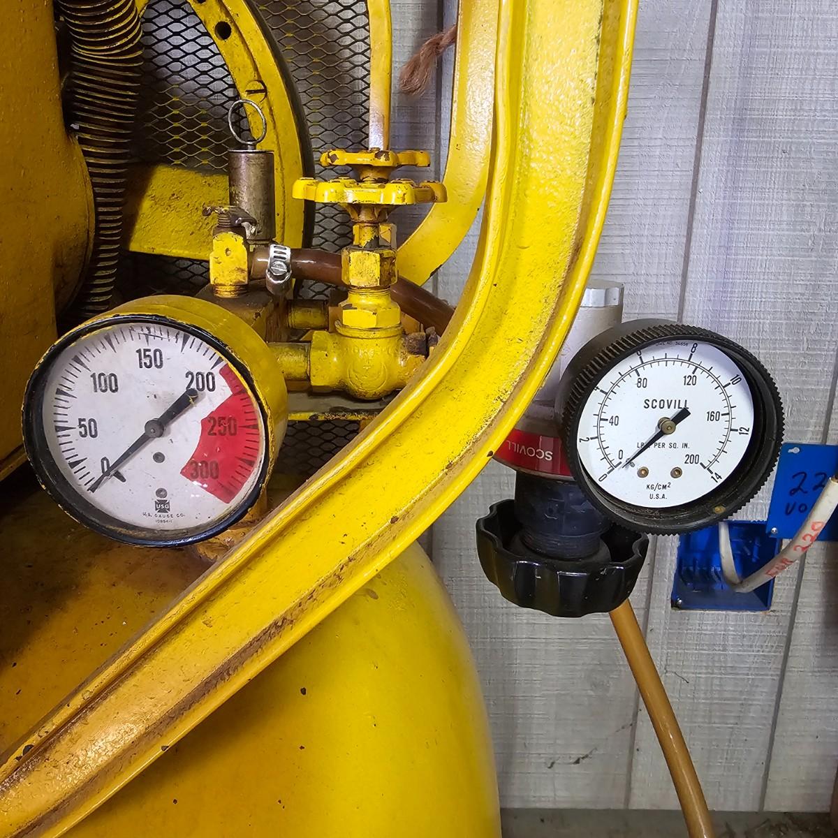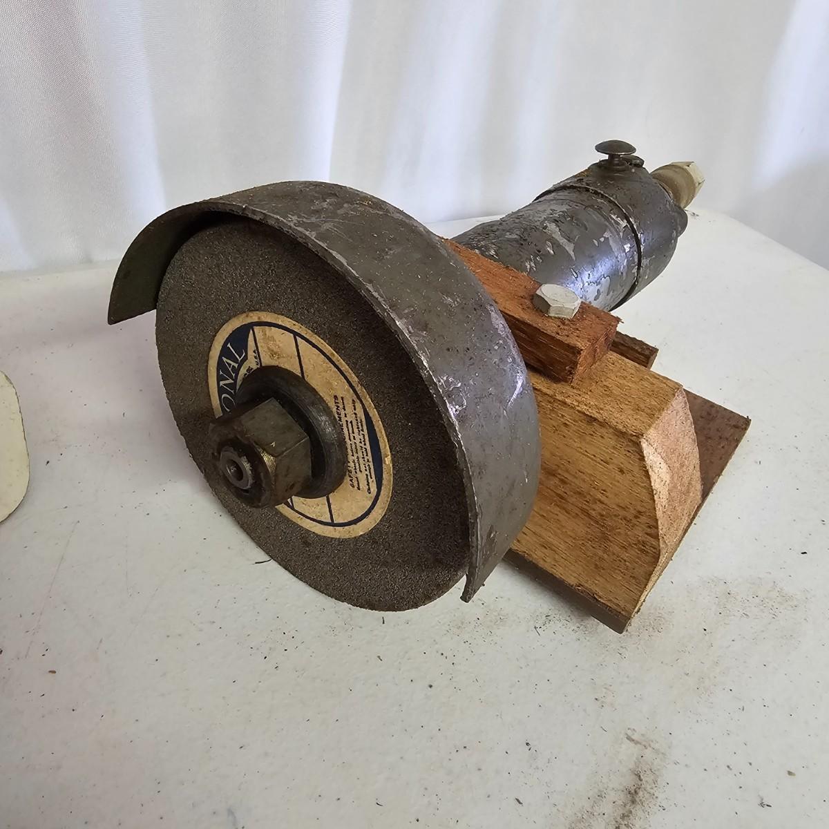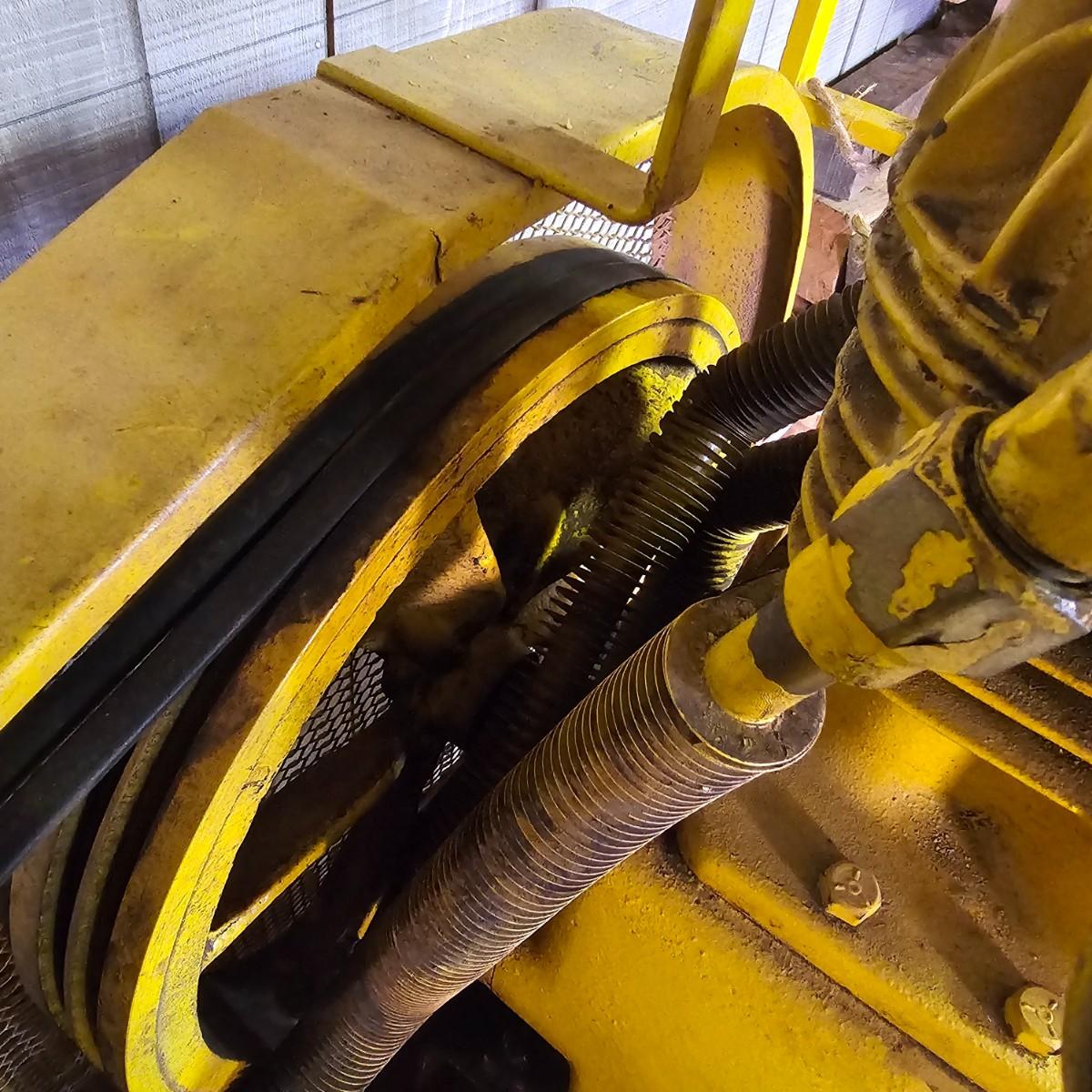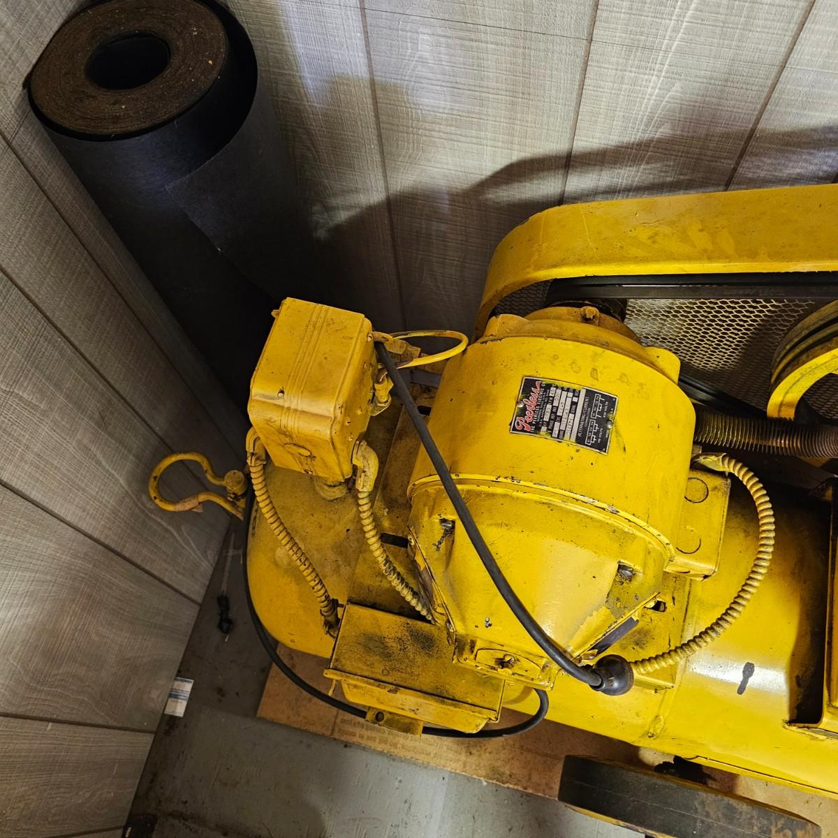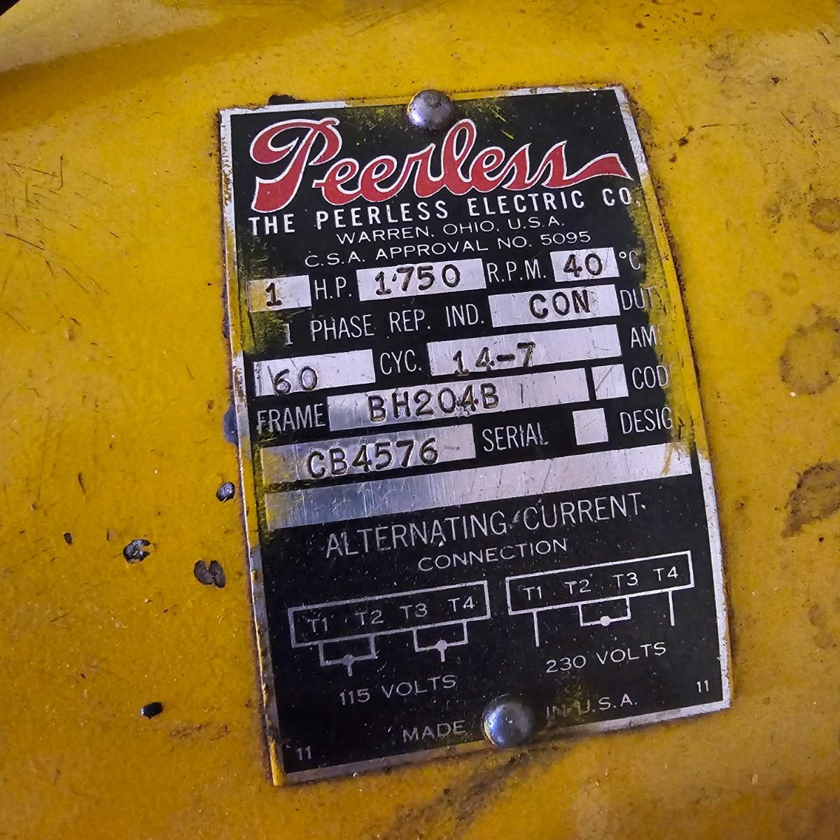 Vintage Brunner 200 psi air compressor and lots of accessories. Built in 1951, this machine has cast-iron wheels, two-stage compressor, cast iron frame and more. Powered by a Peerless Electric 1hp motor with a double belt drive flywheel. It appears to have at least a 40 gallon tank, and the builders plate indicates 5CFM. Currently wired for 120 volts, can also be used on 220. Measures 53 " x 26" x 44"H, painted in bright yellow. Includes a 50 foot hose, three air nozzles, a 1/2" impact wrench, a 3/8" ratchet, a drill and a grinder unit, as well as several coupling connectors. None of the small tools have been tested, but the compressor started and ran when plugged in. Also some tool oil and other lubricants (we cannot guarantee the contents). See photos for details.
