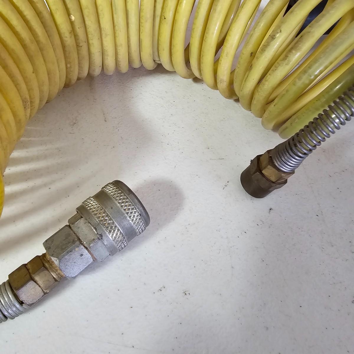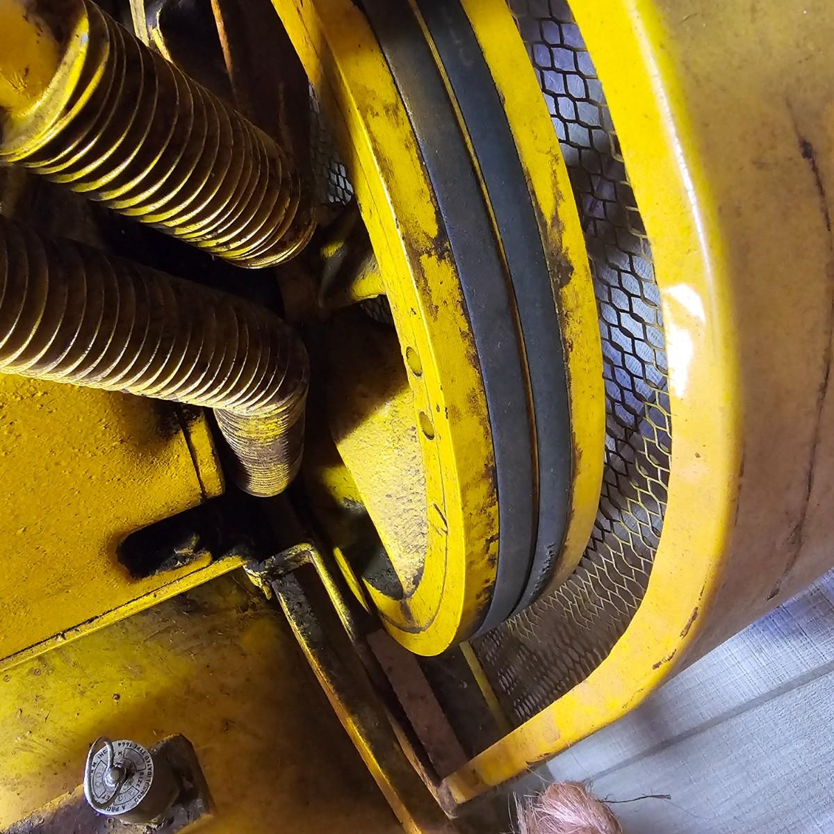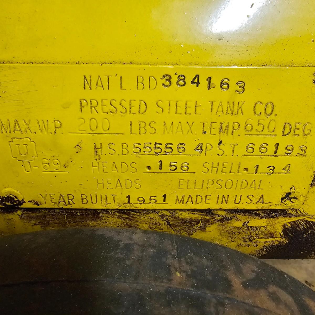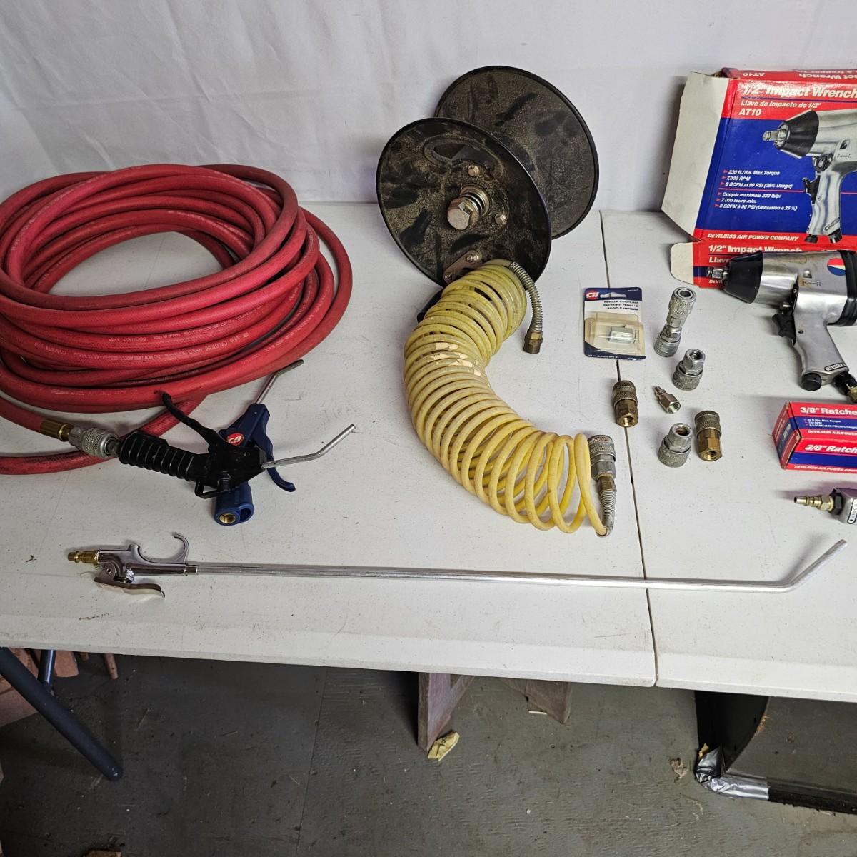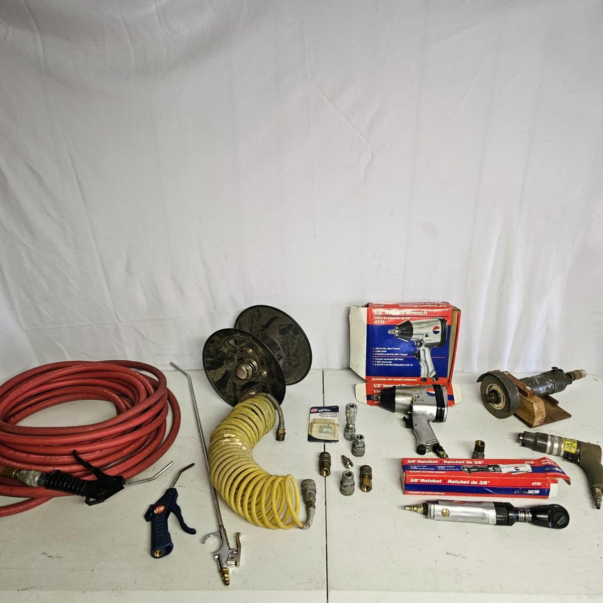 Vintage Brunner 200 psi air compressor and lots of accessories. Built in 1951, this machine has cast-iron wheels, two-stage compressor, cast iron frame and more. Powered by a Peerless Electric 1hp motor with a double belt drive flywheel. It appears to have at least a 40 gallon tank, and the builders plate indicates 5CFM. Currently wired for 120 volts, can also be used on 220. Measures 53 " x 26" x 44"H, painted in bright yellow. Includes a 50 foot hose, three air nozzles, a 1/2" impact wrench, a 3/8" ratchet, a drill and a grinder unit, as well as several coupling connectors. None of the small tools have been tested, but the compressor started and ran when plugged in. Also some tool oil and other lubricants (we cannot guarantee the contents). See photos for details.