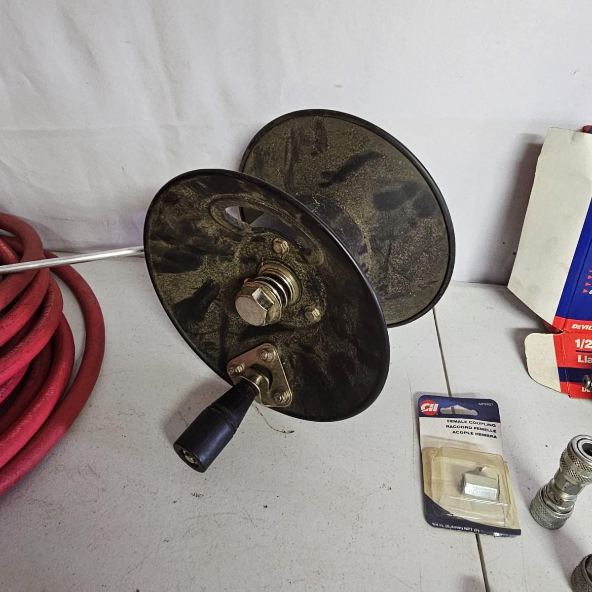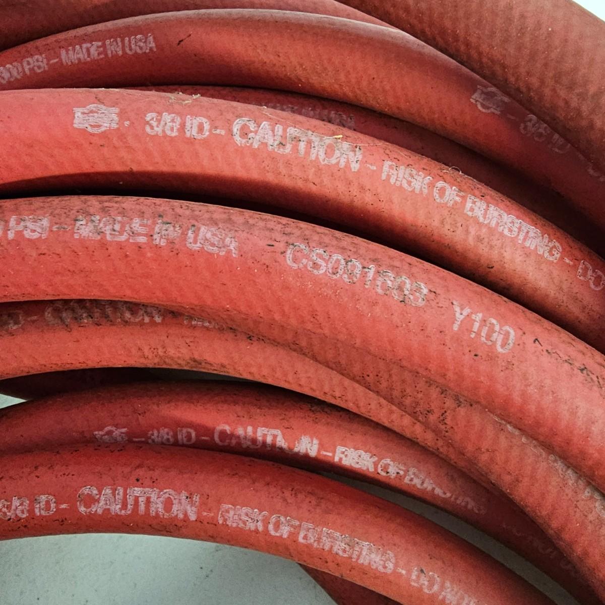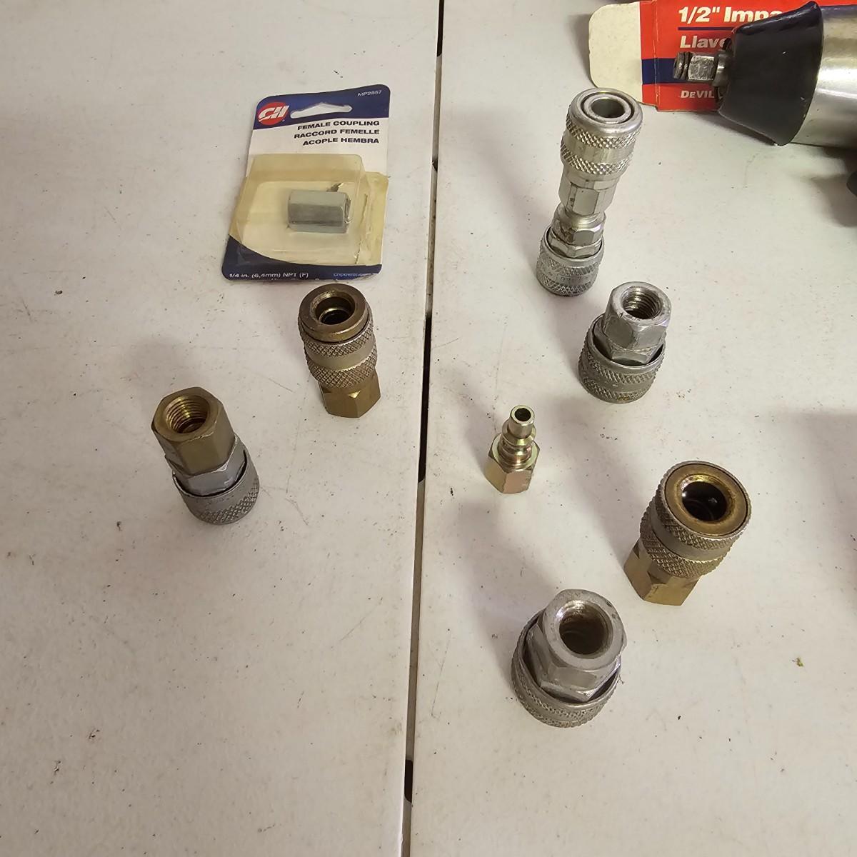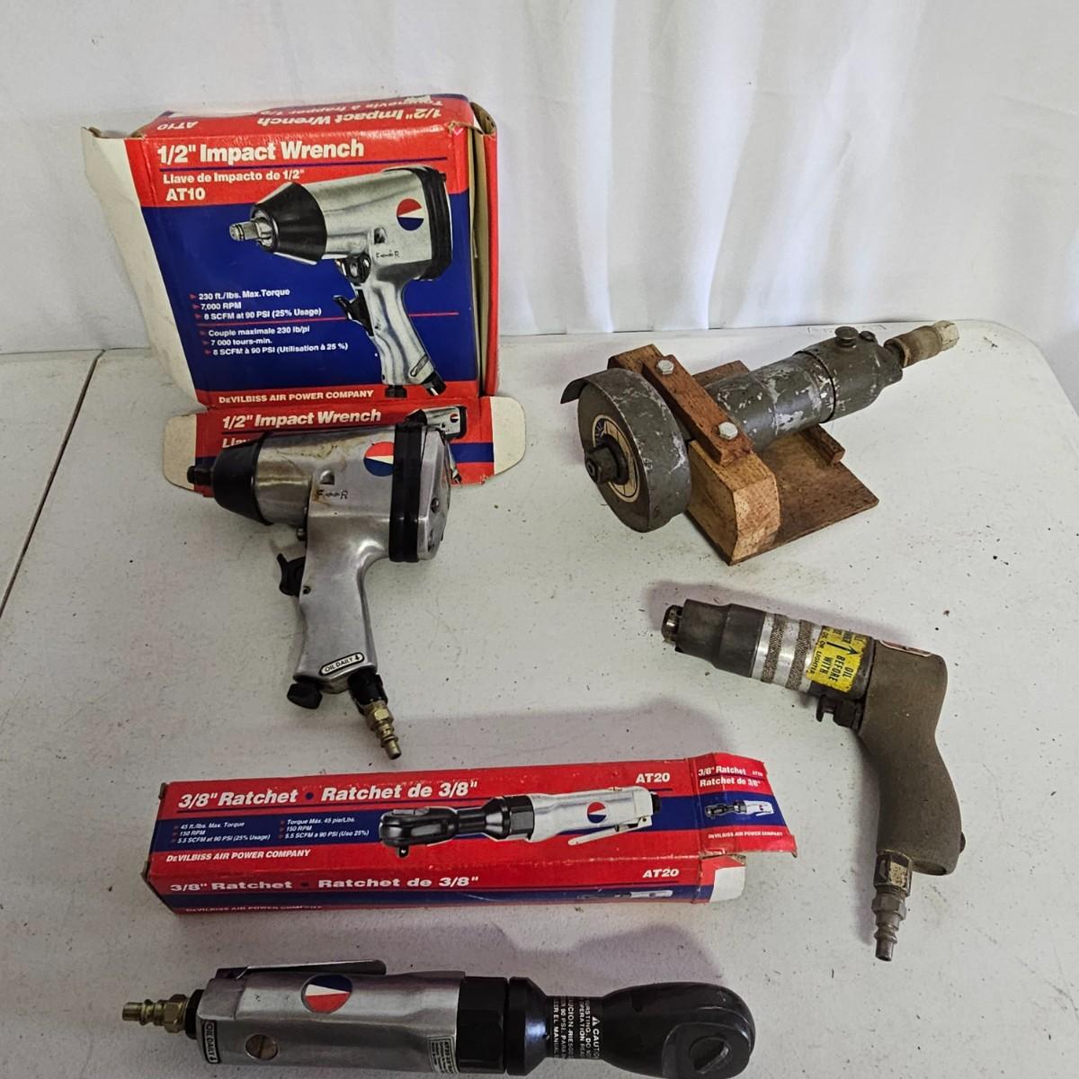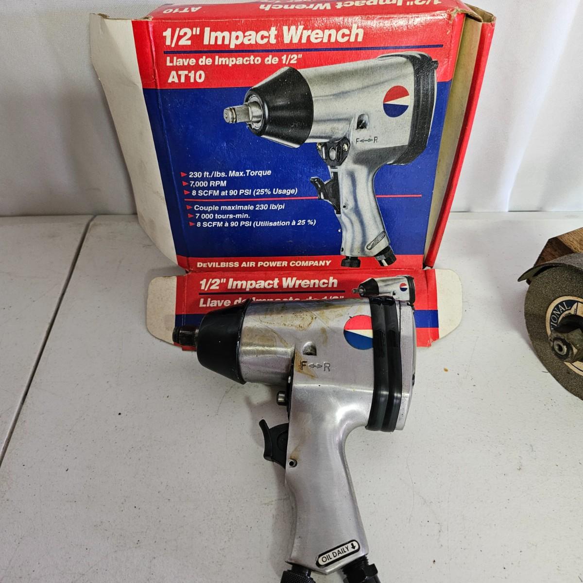 Vintage Brunner 200 psi air compressor and lots of accessories. Built in 1951, this machine has cast-iron wheels, two-stage compressor, cast iron frame and more. Powered by a Peerless Electric 1hp motor with a double belt drive flywheel. It appears to have at least a 40 gallon tank, and the builders plate indicates 5CFM. Currently wired for 120 volts, can also be used on 220. Measures 53 " x 26" x 44"H, painted in bright yellow. Includes a 50 foot hose, three air nozzles, a 1/2" impact wrench, a 3/8" ratchet, a drill and a grinder unit, as well as several coupling connectors. None of the small tools have been tested, but the compressor started and ran when plugged in. Also some tool oil and other lubricants (we cannot guarantee the contents). See photos for details.