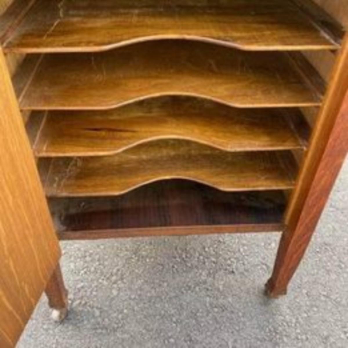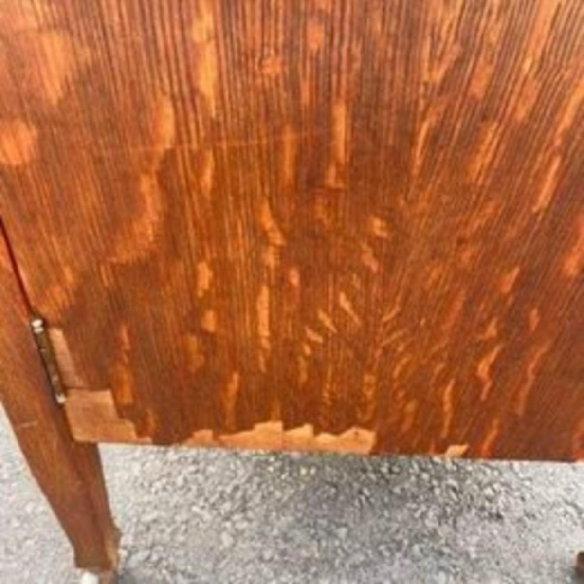 It is quarter sawn oak. Some of the veneer on the bottom front has peeled up. Please see pictures. It is not too bad though, and it still looks great. Overall it’s in great condition, with minimal signs of wear.