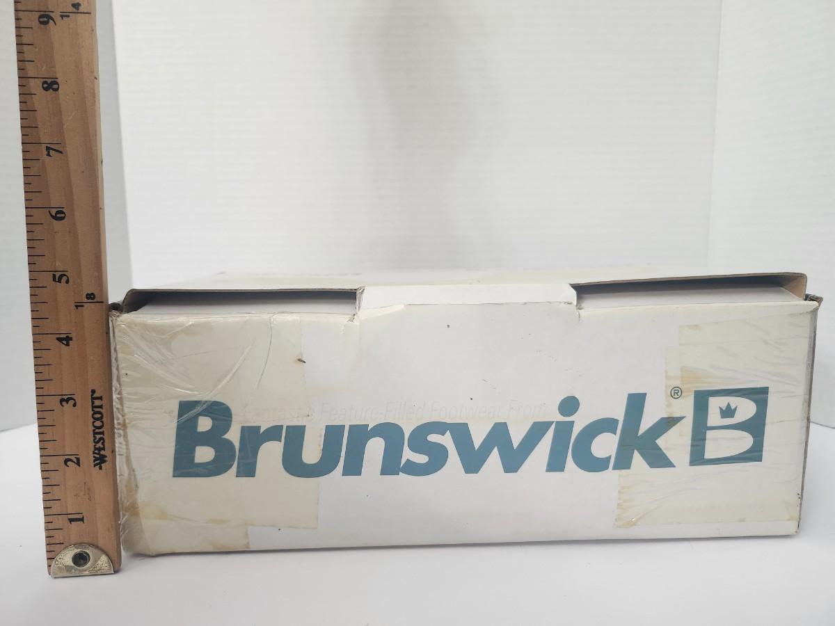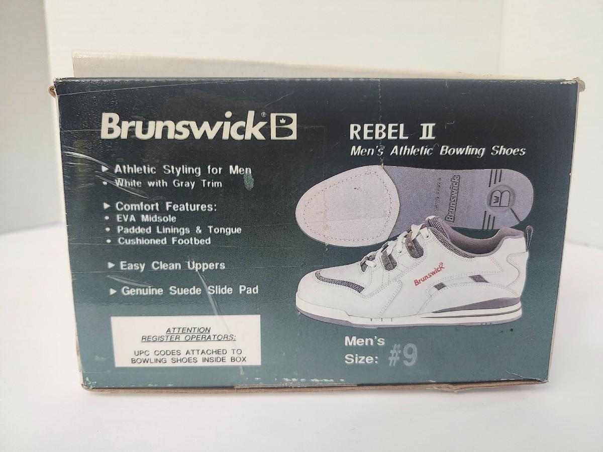 Brunswick Rebel II men’s athletic bowling shoes in white with gray trim. Original box included with features listed EVA midsole padded linings cushioned footbed suede slide pad and easy clean uppers. Box shows wear and tape as photographed. Shoes appear unused from storage.