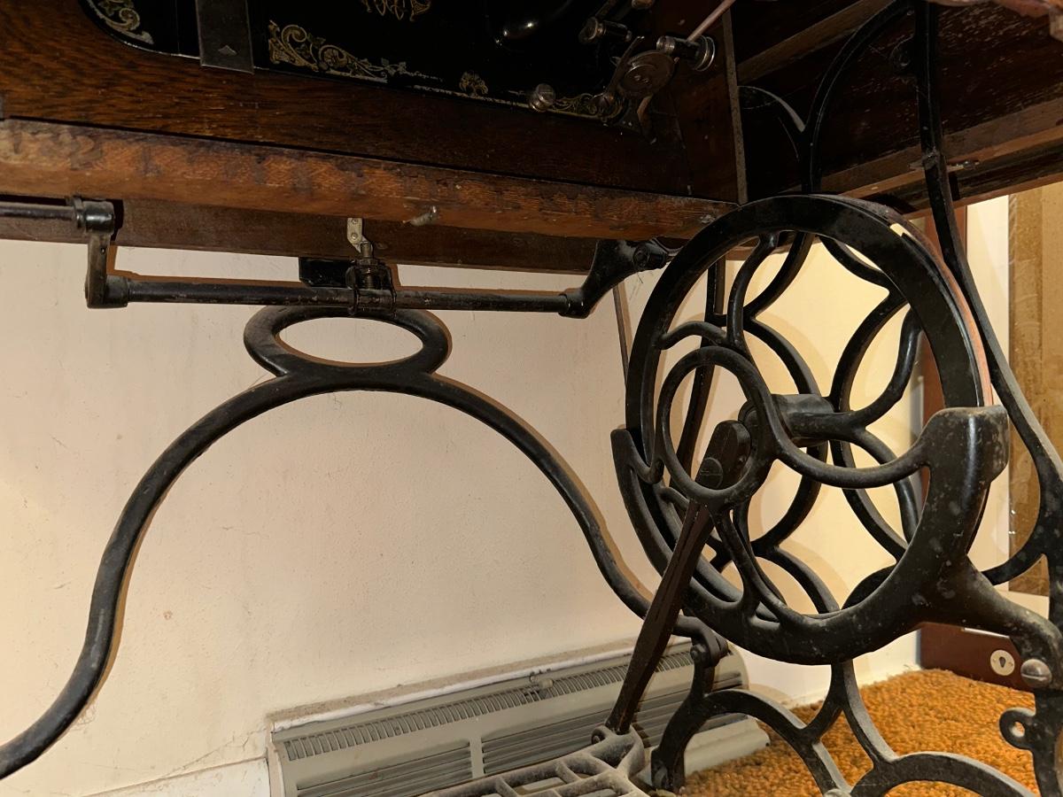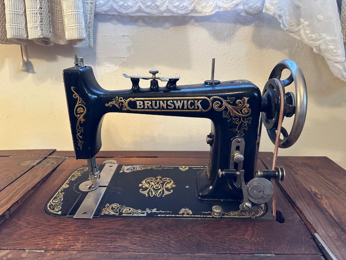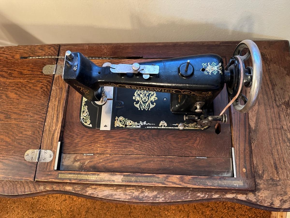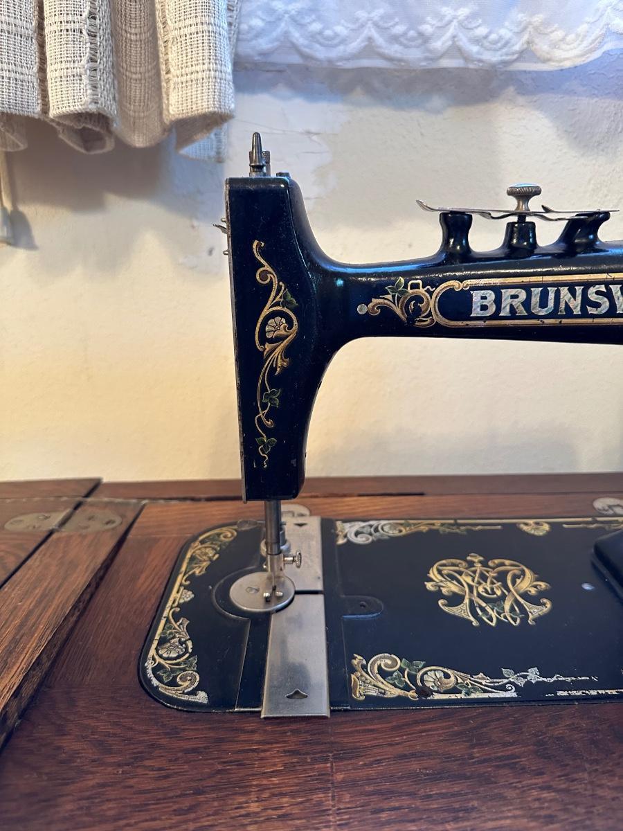 BRUNSWICK TREADLE SEWING MACHINE IN CABINET