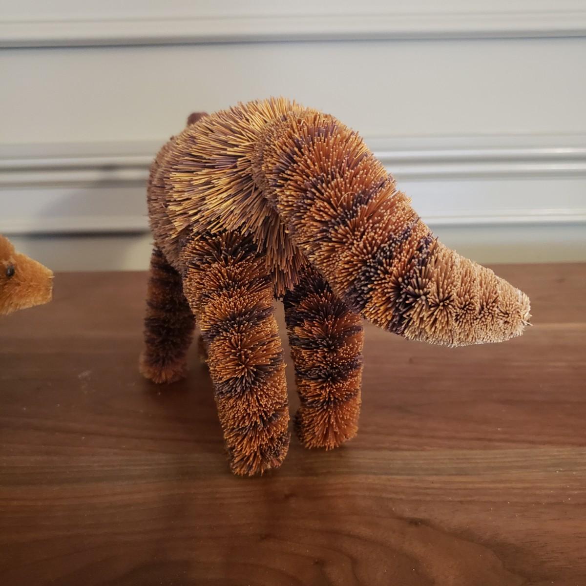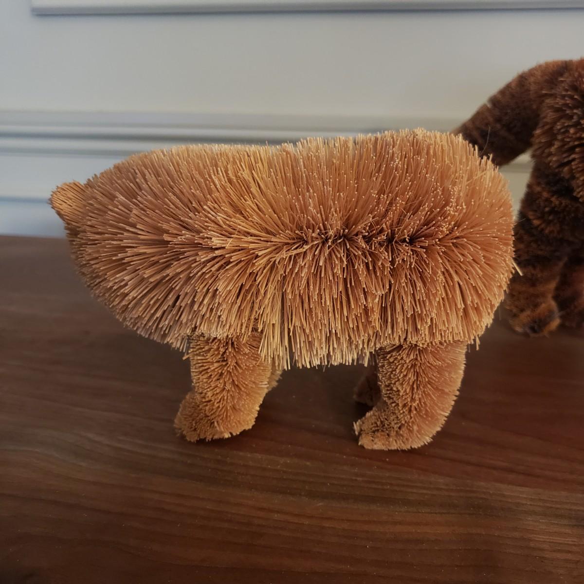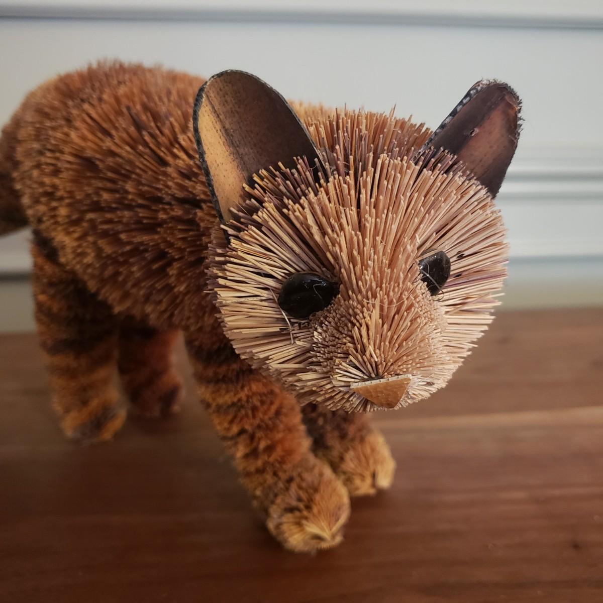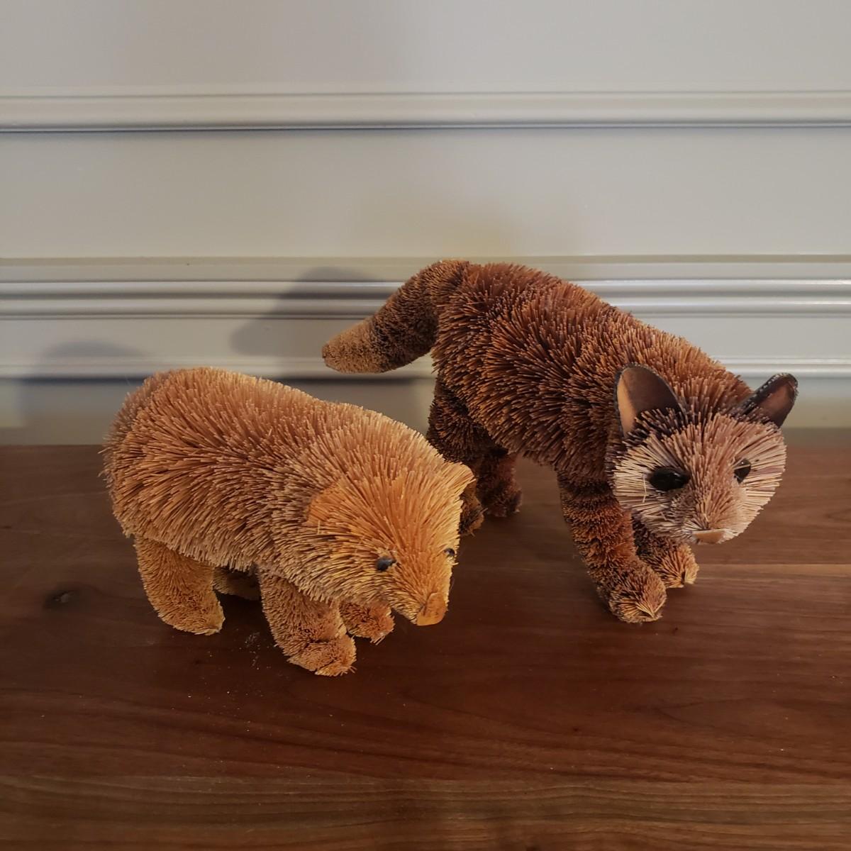 These cute animals are made from straw like material wrapped in wire. See the animal without a tail to see the wire in the very center. The largest, two toned one with a tail measures 10" x 3" x 6"H. There is a little bit of fraying on the tip of his ear, see last picture.