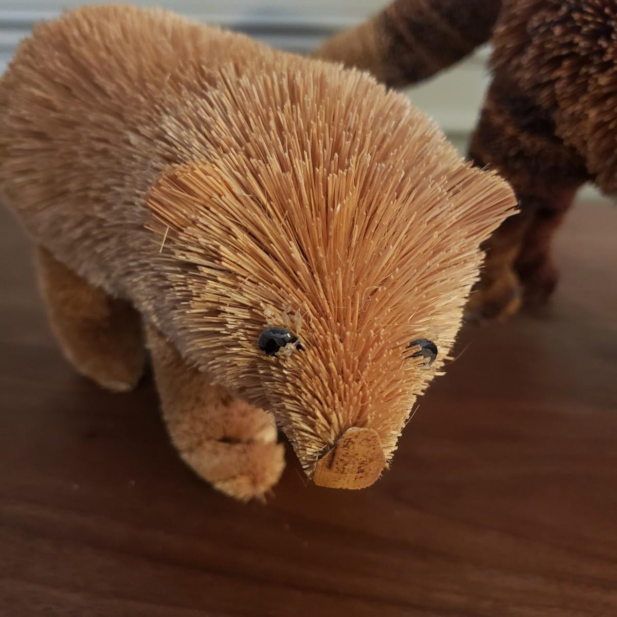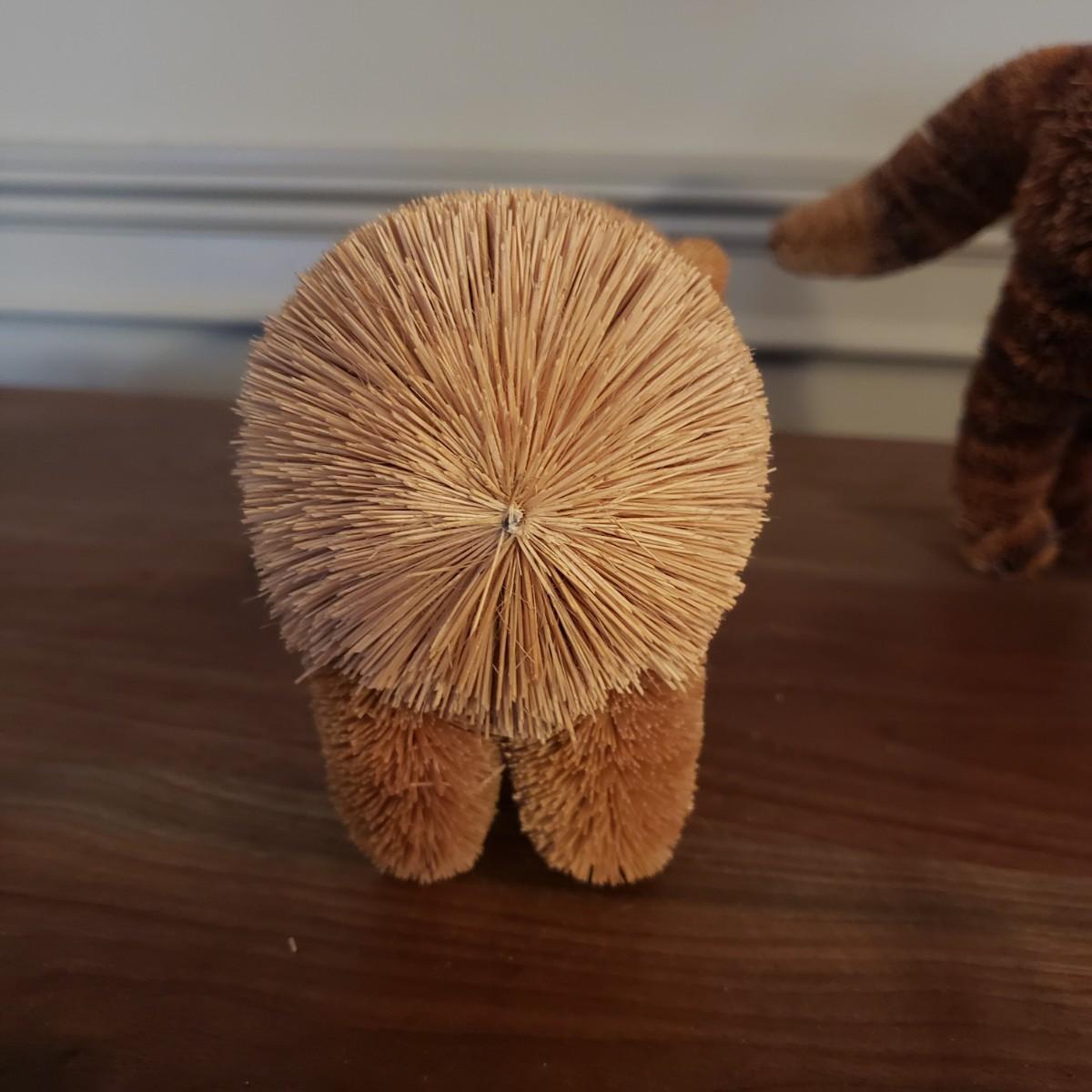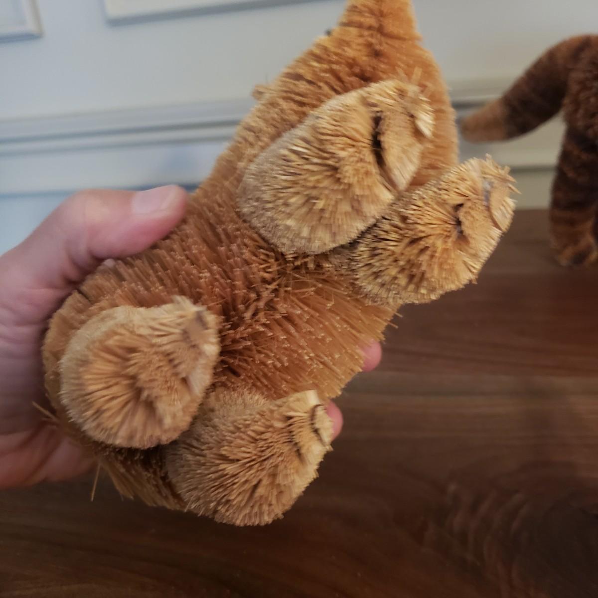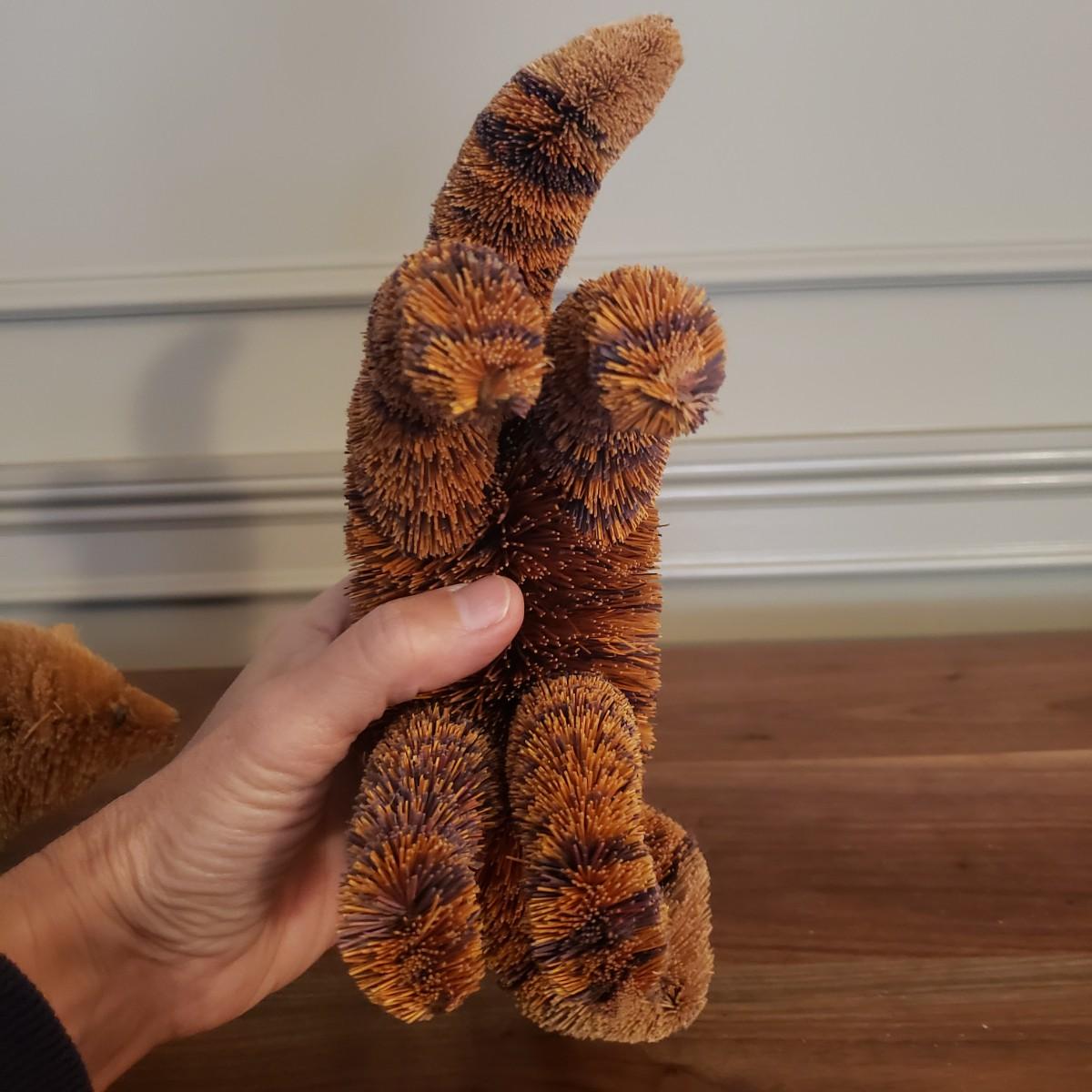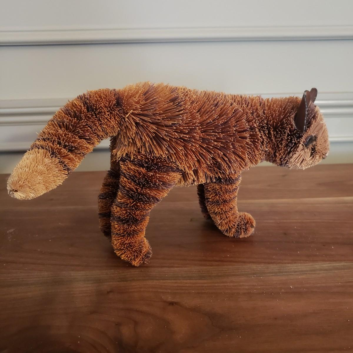 These cute animals are made from straw like material wrapped in wire. See the animal without a tail to see the wire in the very center. The largest, two toned one with a tail measures 10" x 3" x 6"H. There is a little bit of fraying on the tip of his ear, see last picture.