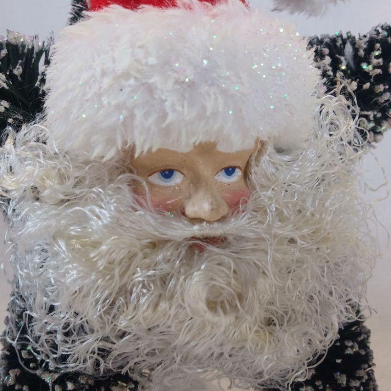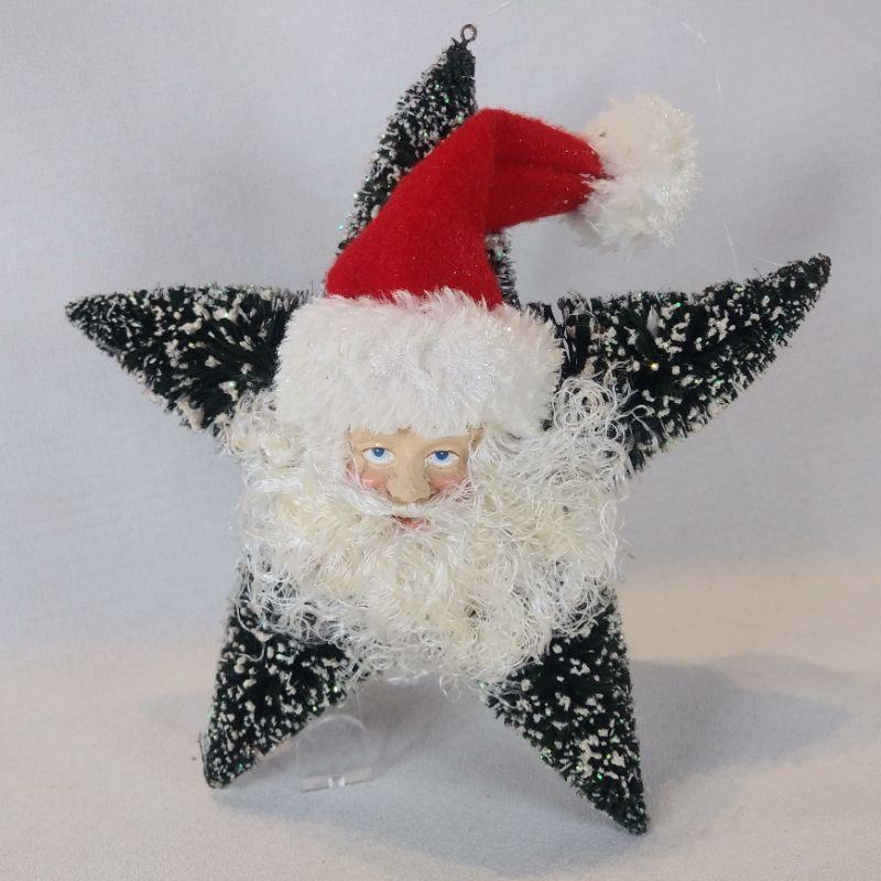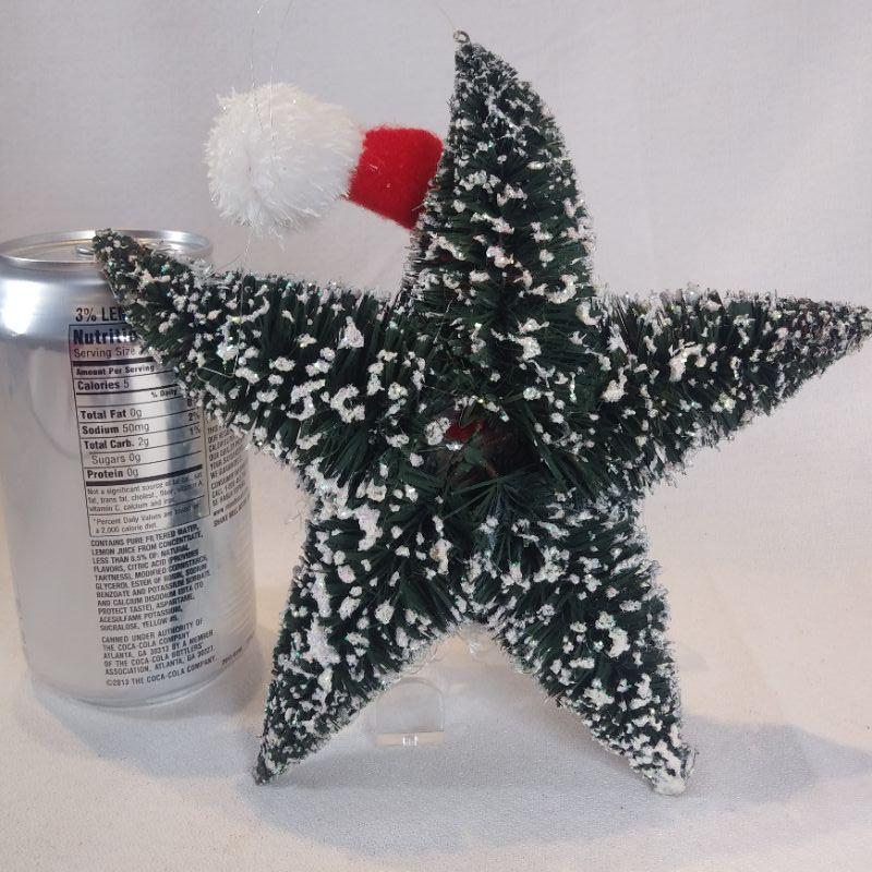 This is a large star made out of brush trees with a Santa on the front as ornament. Very nicely done. It measures 7 1/4-inch x 7 1/4-inch. How fun? Perfect for your tree, or wreath, or mantel, or car, or . . .