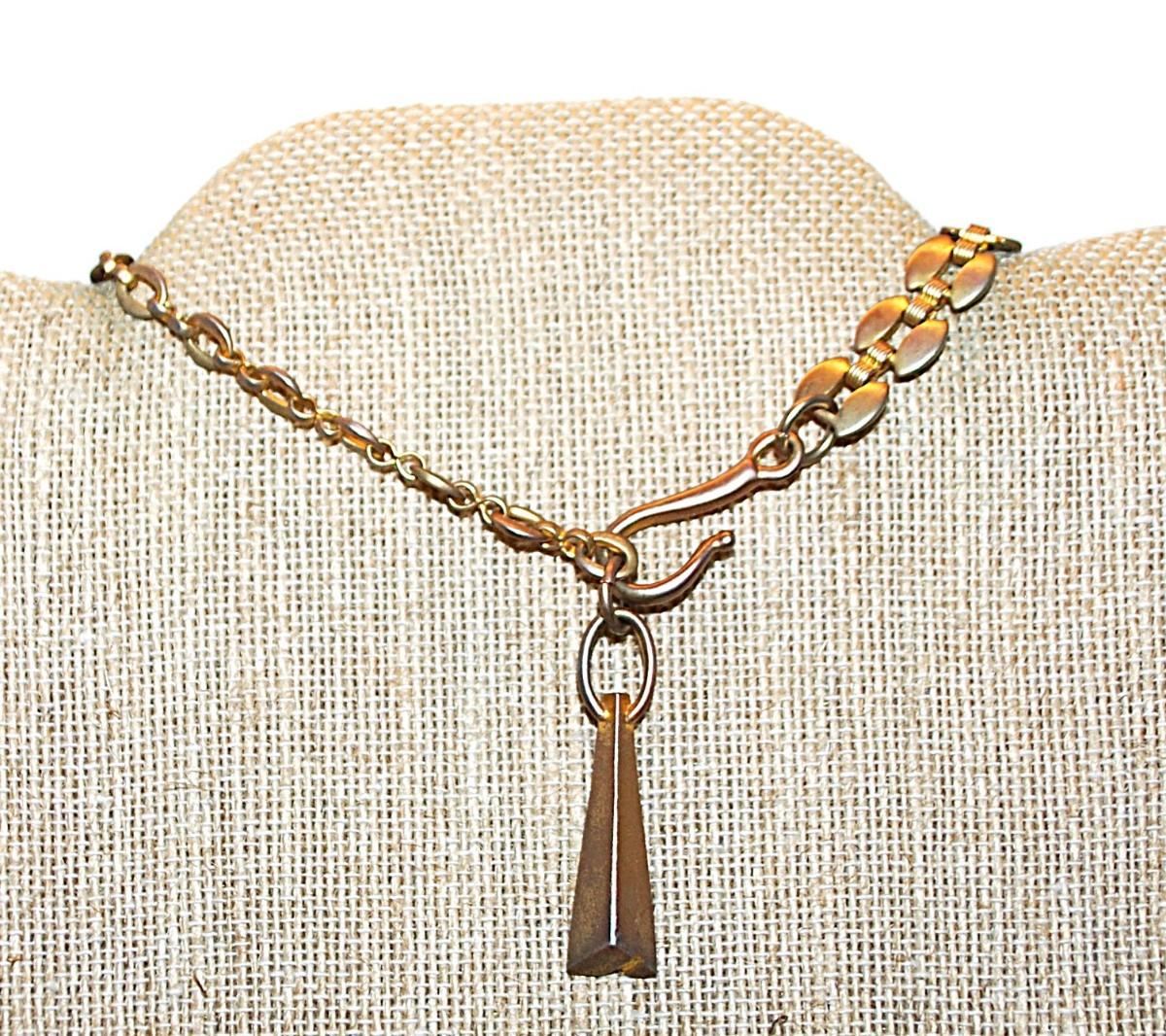 Brushed Gold Color SEGMENTED NECKLACE with Interesting PYRAMID Dangle and Large Wire HOOK CLASP 36" L