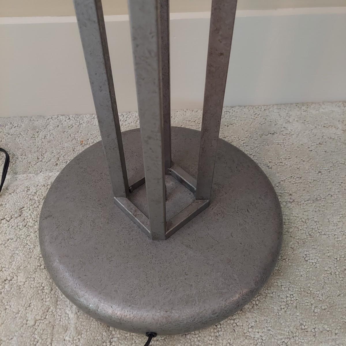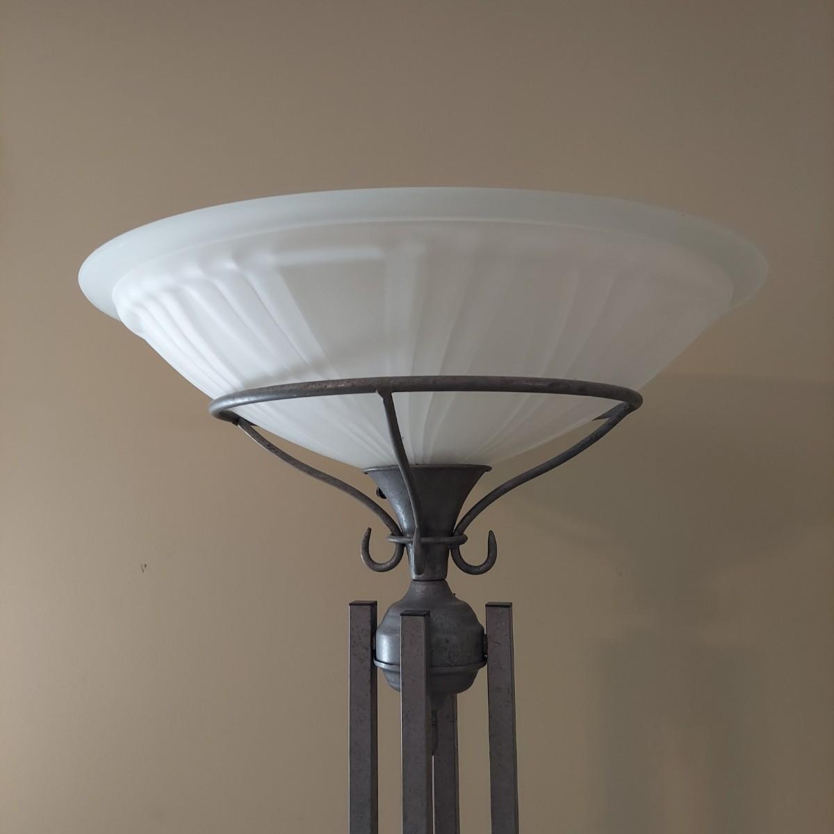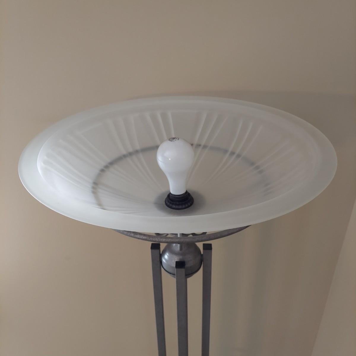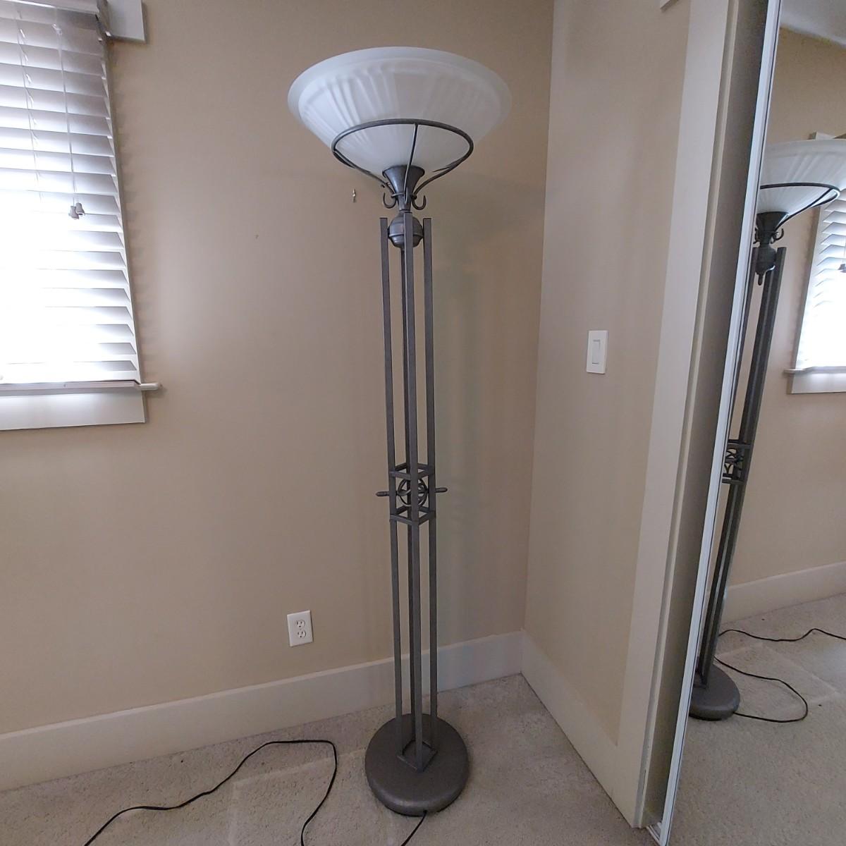 Large metal floor lamp with frosted glass shade. Brushed Nickel finish. Lamp plugged in and powered on. Clicks three times for different brightness. Base has 13" diameter and the shade has 20" diameter. The lamp is 72"H. Local Pickup Only.