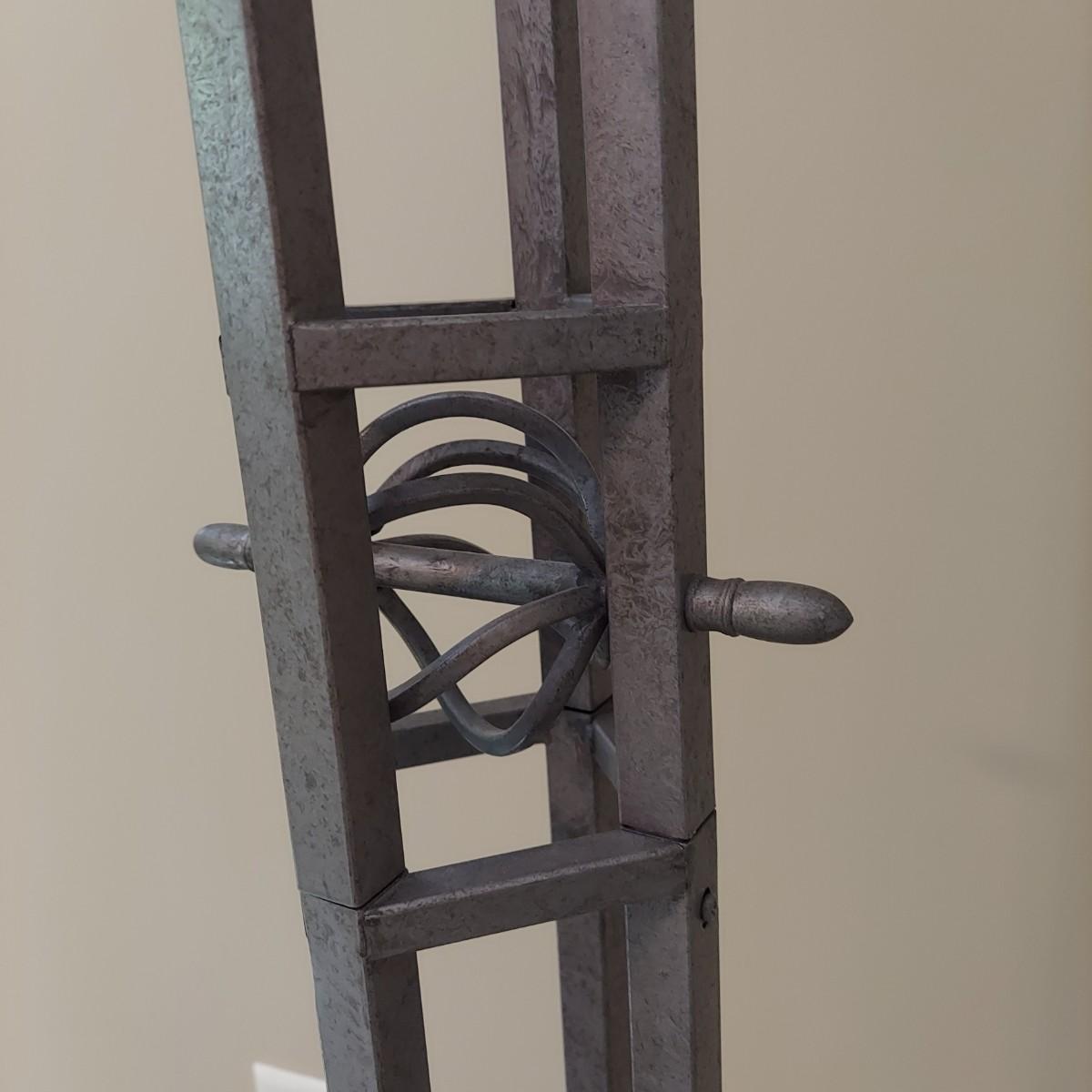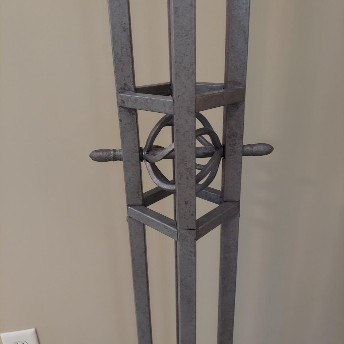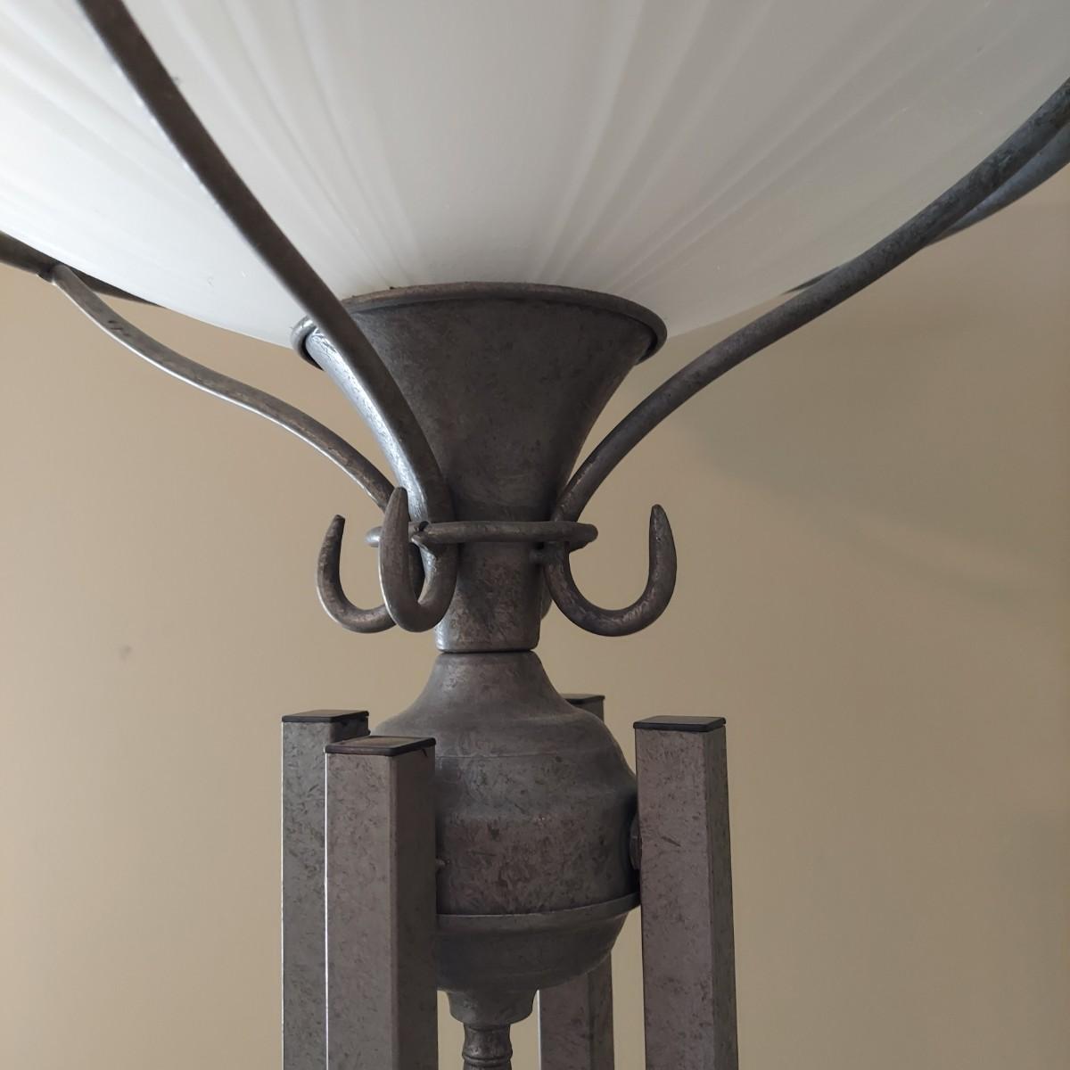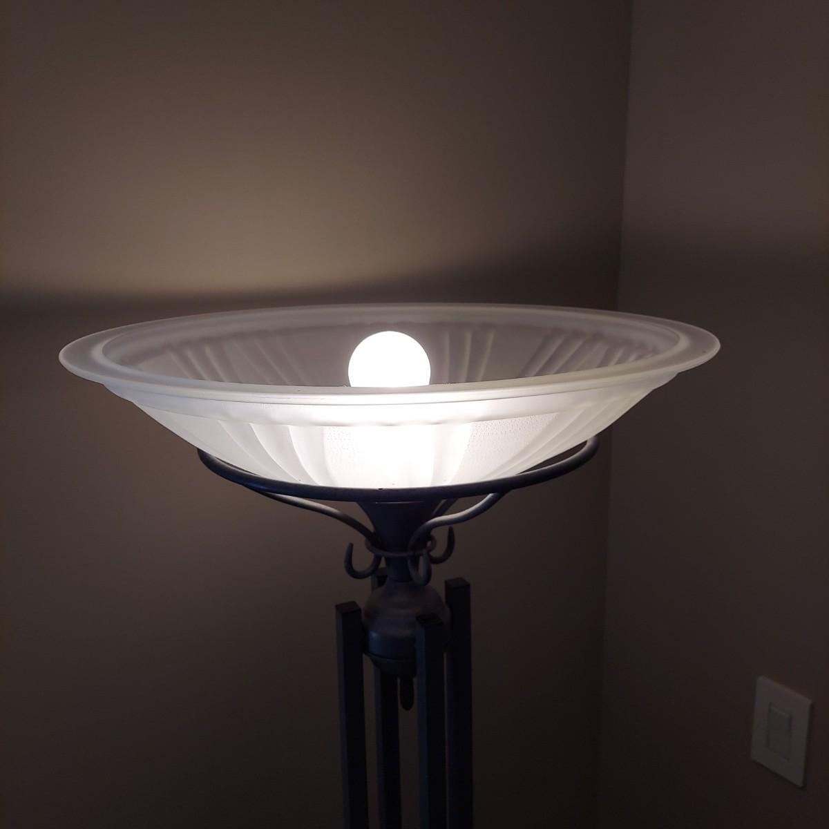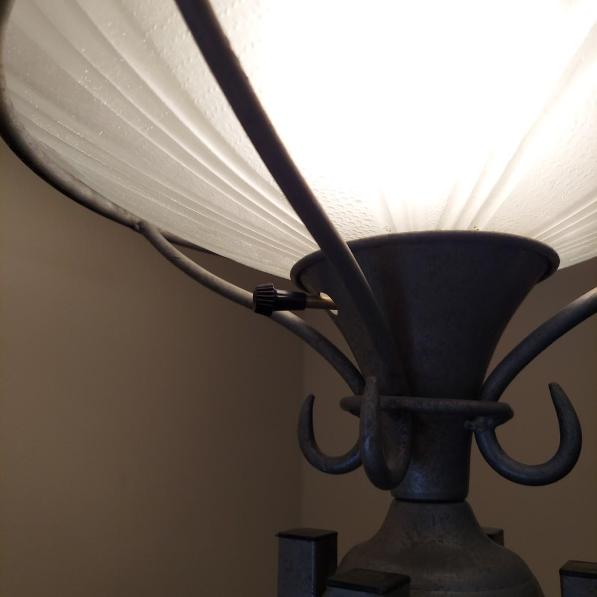 Large metal floor lamp with frosted glass shade. Brushed Nickel finish. Lamp plugged in and powered on. Clicks three times for different brightness. Base has 13" diameter and the shade has 20" diameter. The lamp is 72"H. Local Pickup Only.