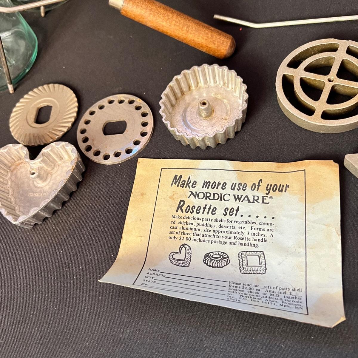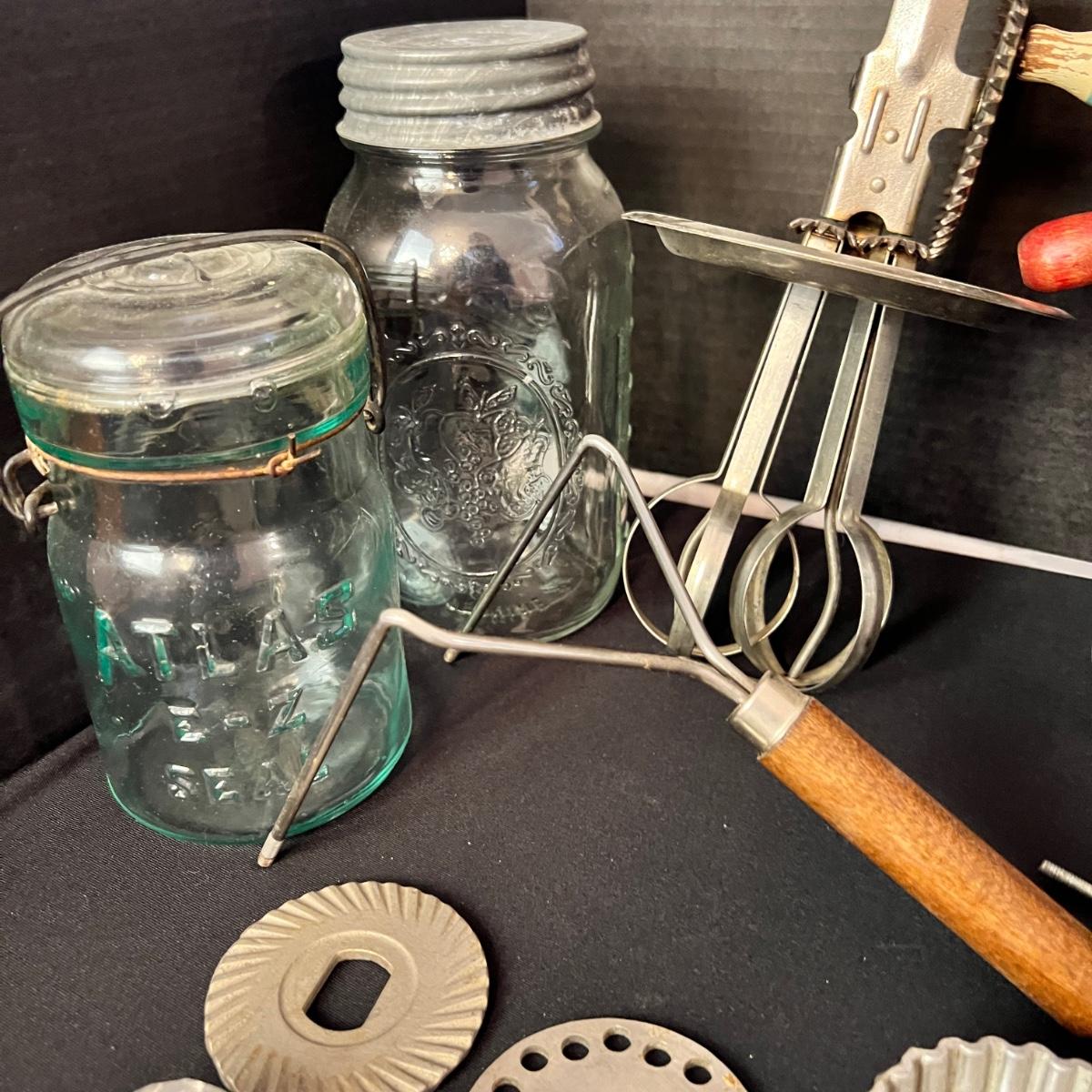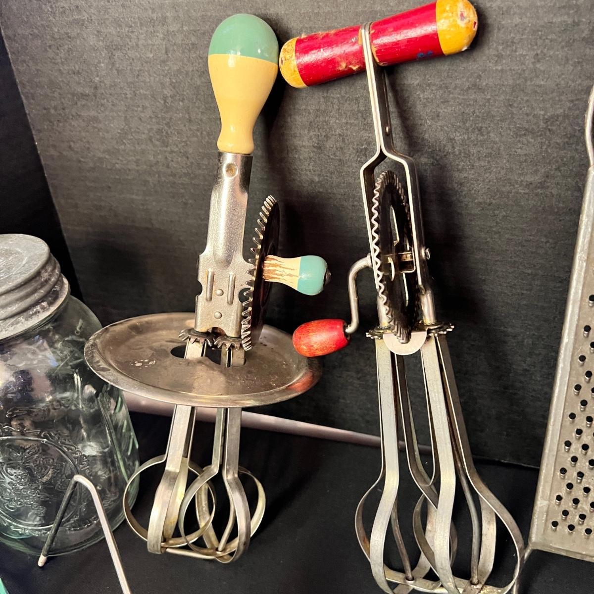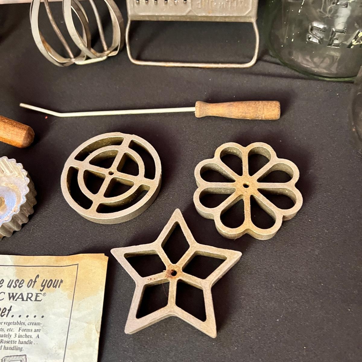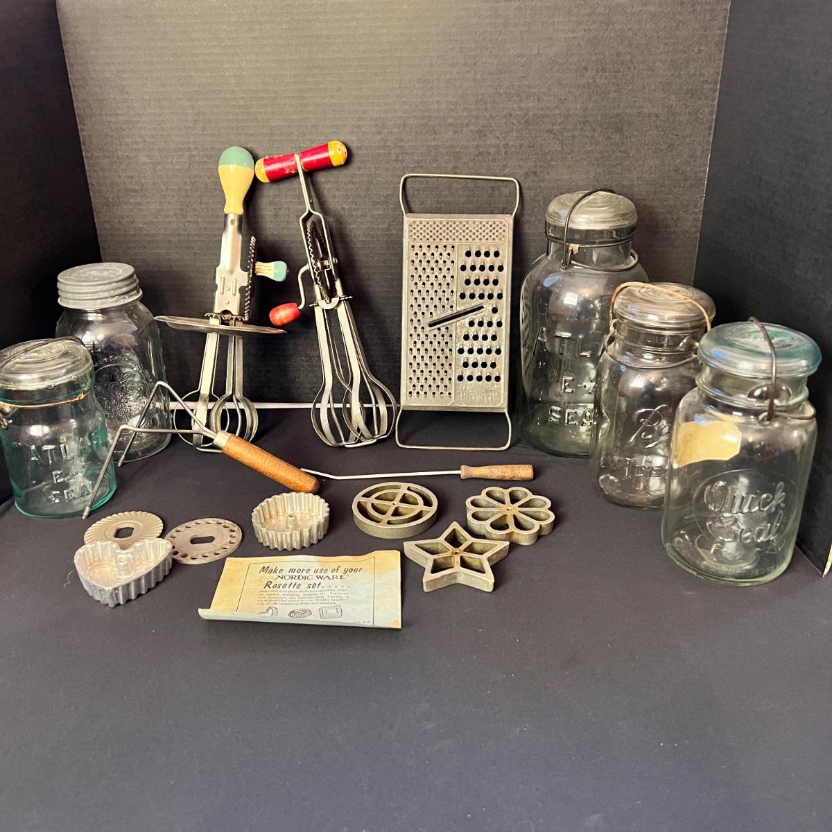 2 wooden handled egg beaters, Ball and Atlas mason jars, NordicWare Rosette set, and more! NOTE: PICK UP ONLY IN DUNKIRK MD.