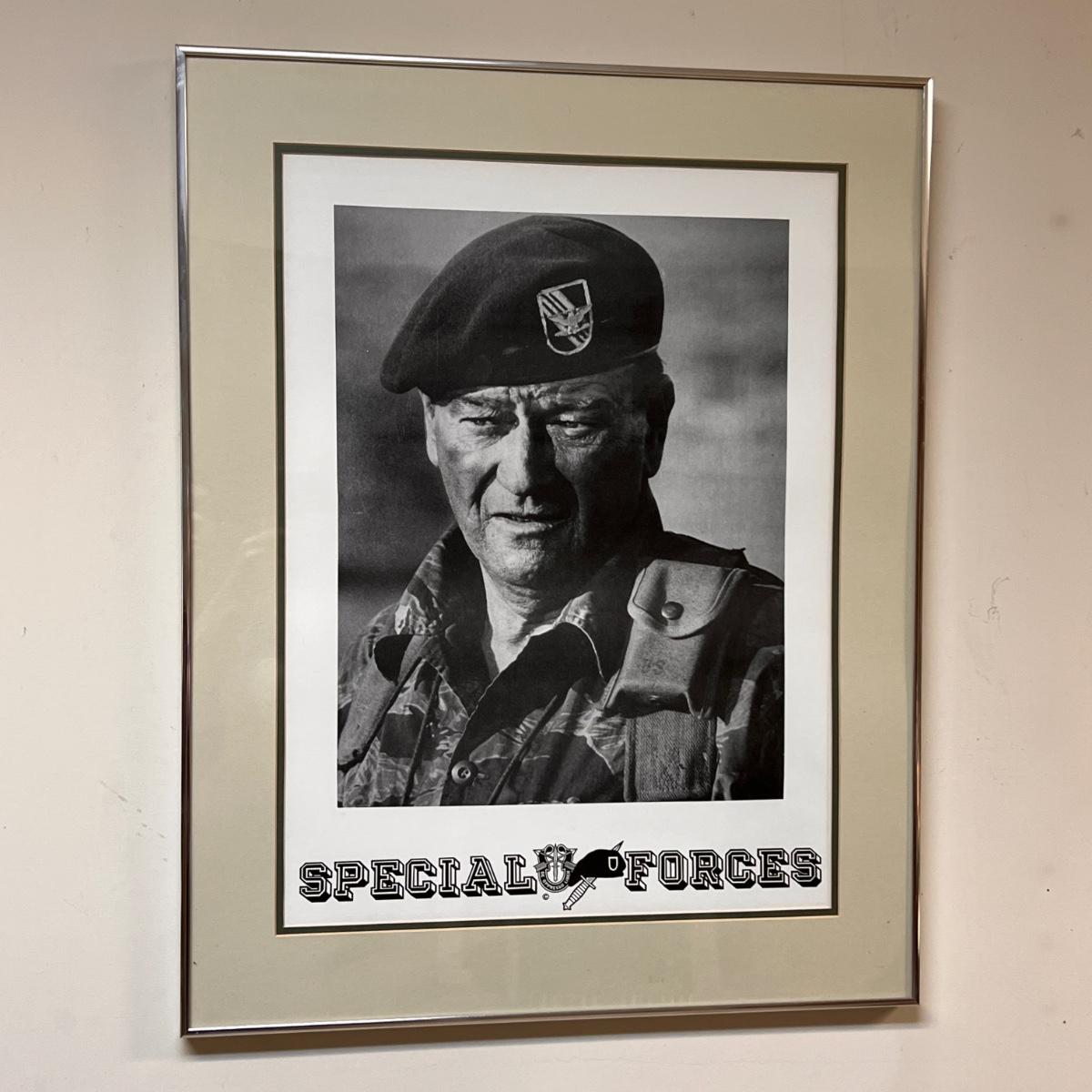 Professionally framed movie memorabilia print of John Wayne as Col. Mike Kirby in The Green Berets. Silver metal frame.