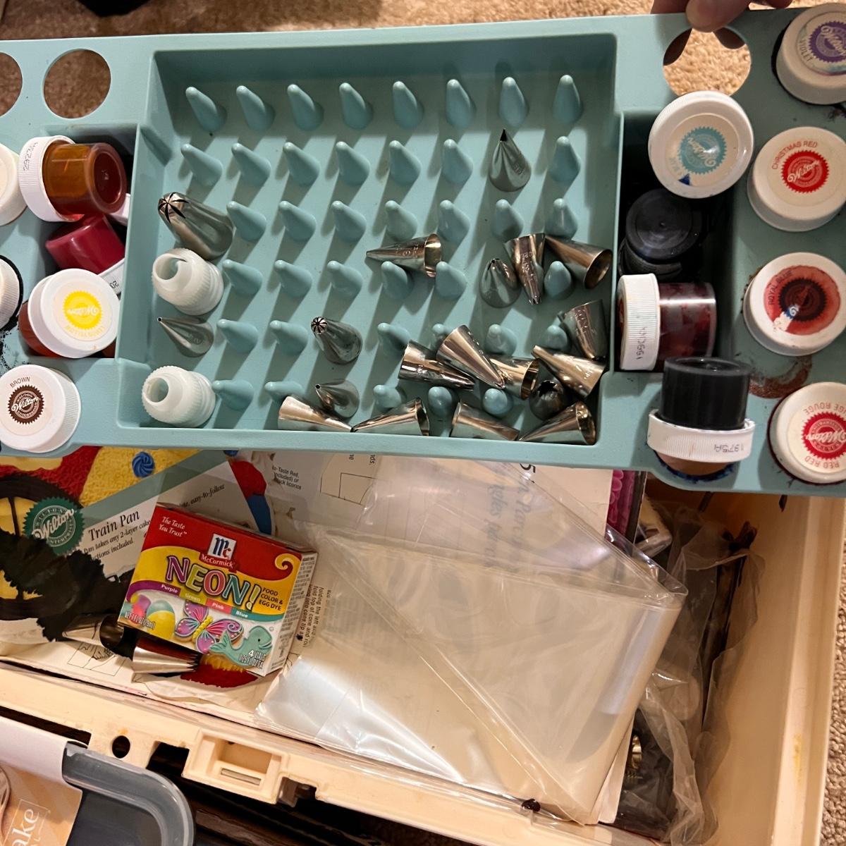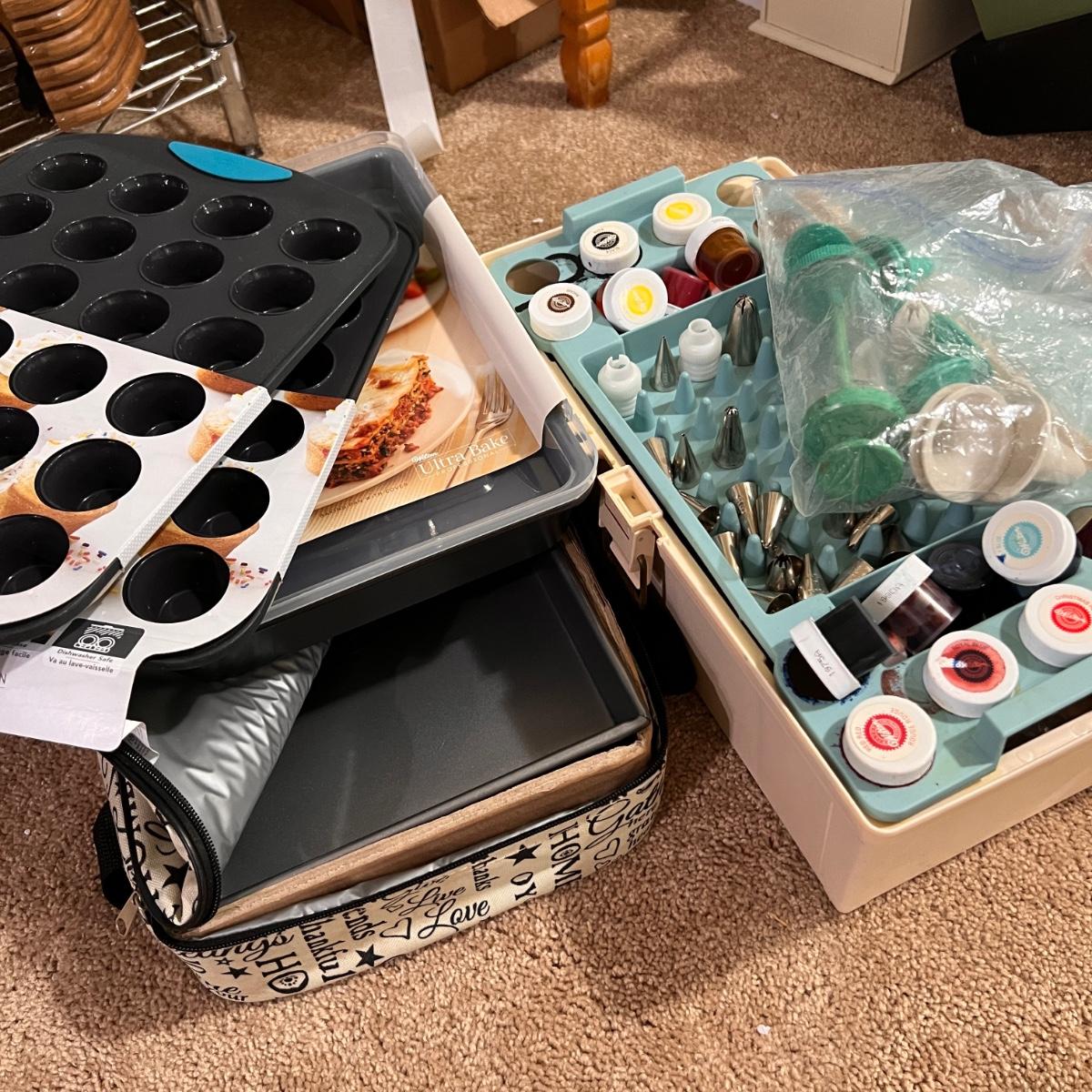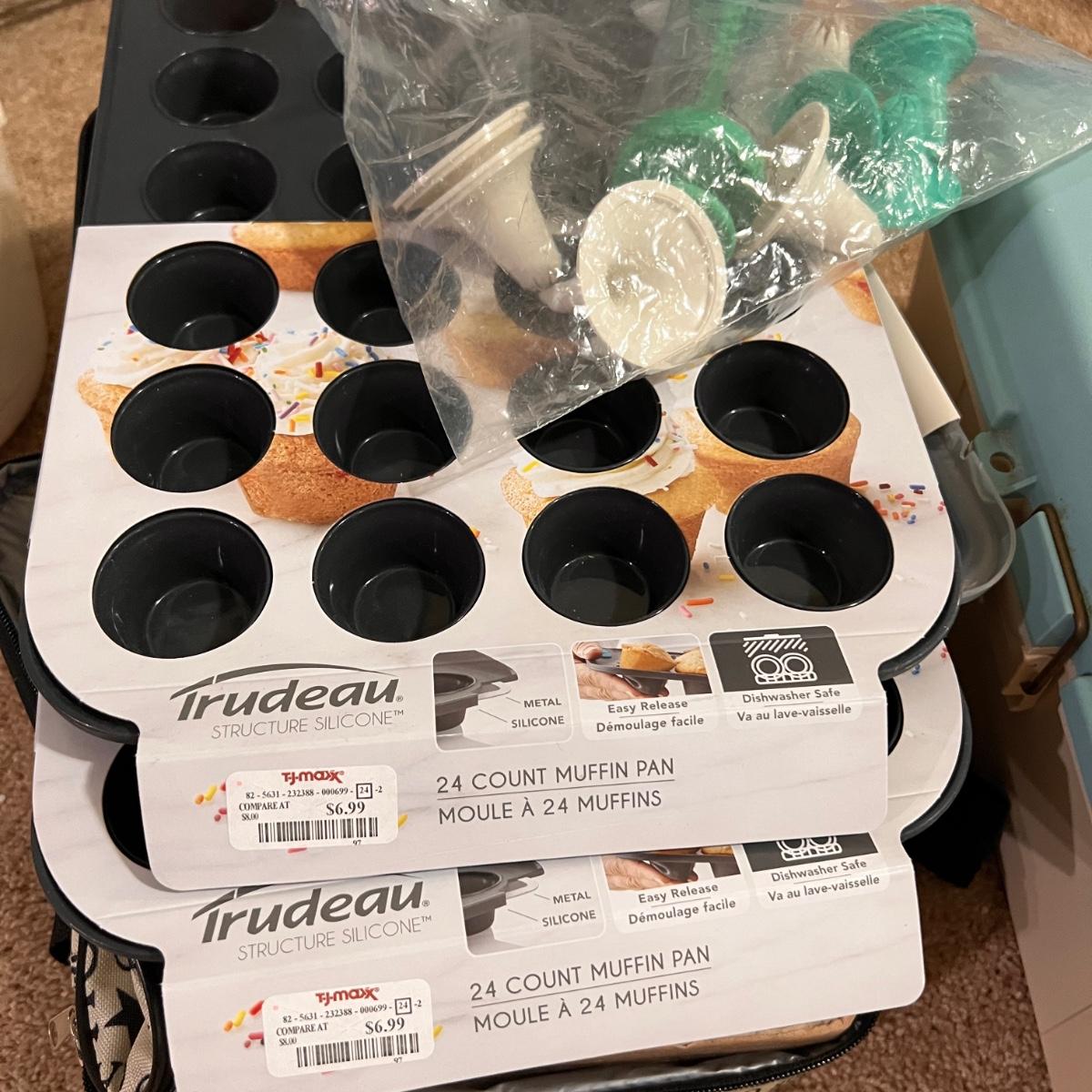 2 Trudeau silicone muffin pan 24 count, Wilton Ultra Bake pan with top, baking pan with zip up carrying case, box with cake decorating piping bags, tips, edible food gel coloring, food coloring, decorating pamphlets.