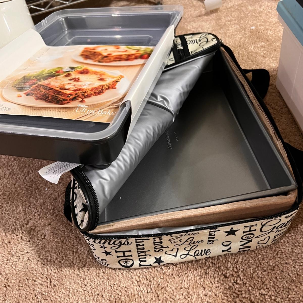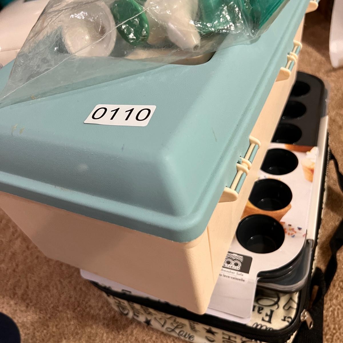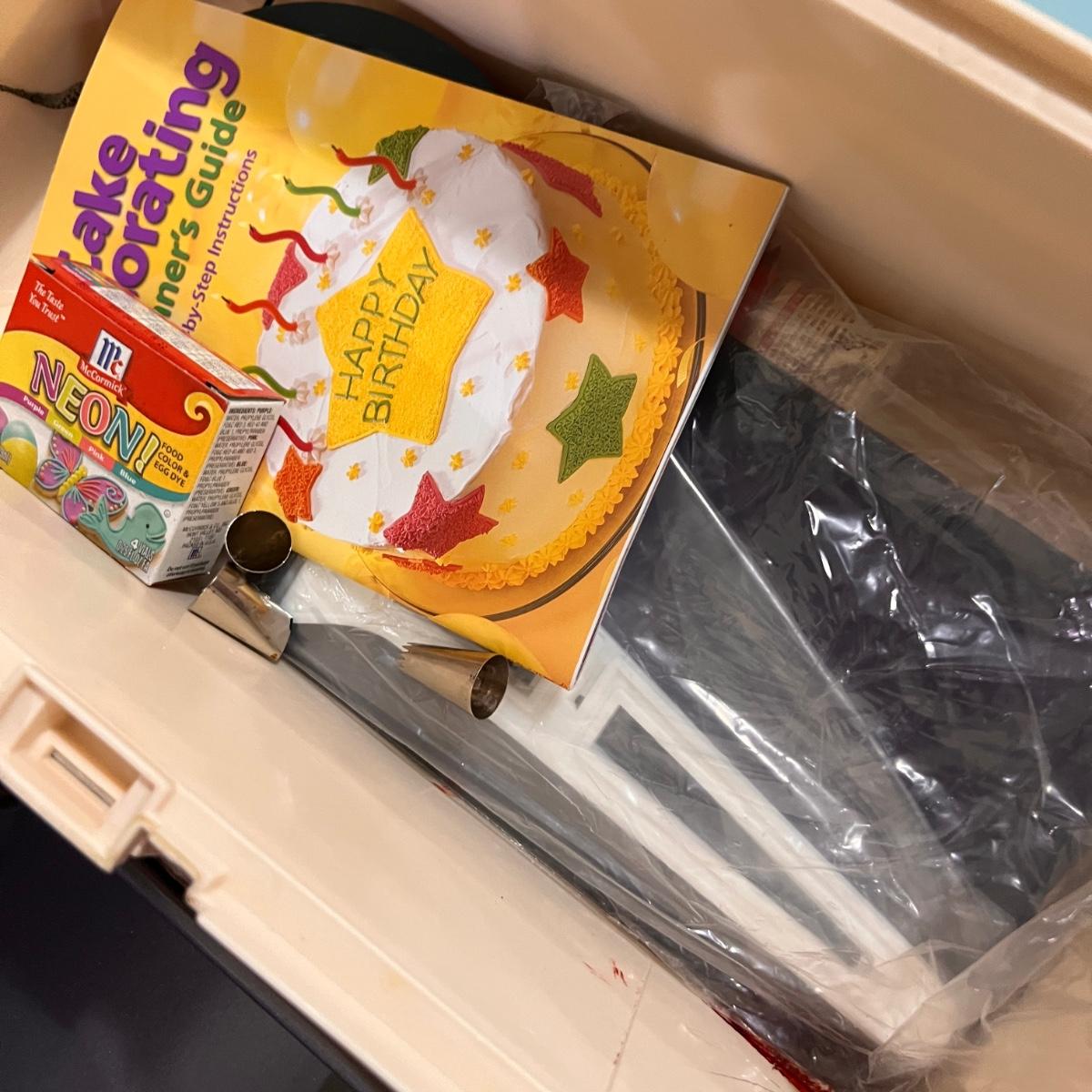 2 Trudeau silicone muffin pan 24 count, Wilton Ultra Bake pan with top, baking pan with zip up carrying case, box with cake decorating piping bags, tips, edible food gel coloring, food coloring, decorating pamphlets.