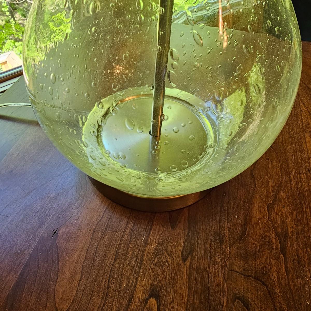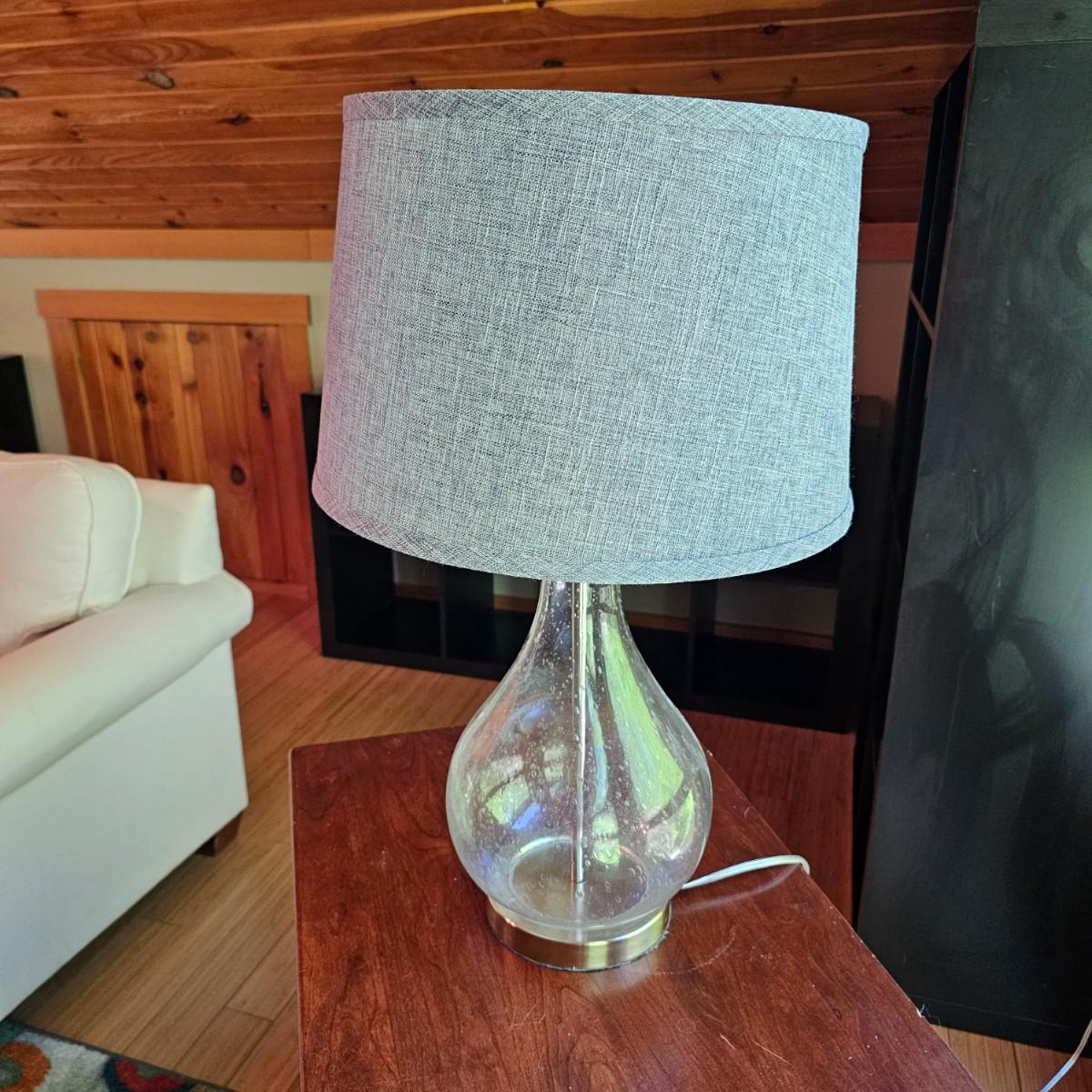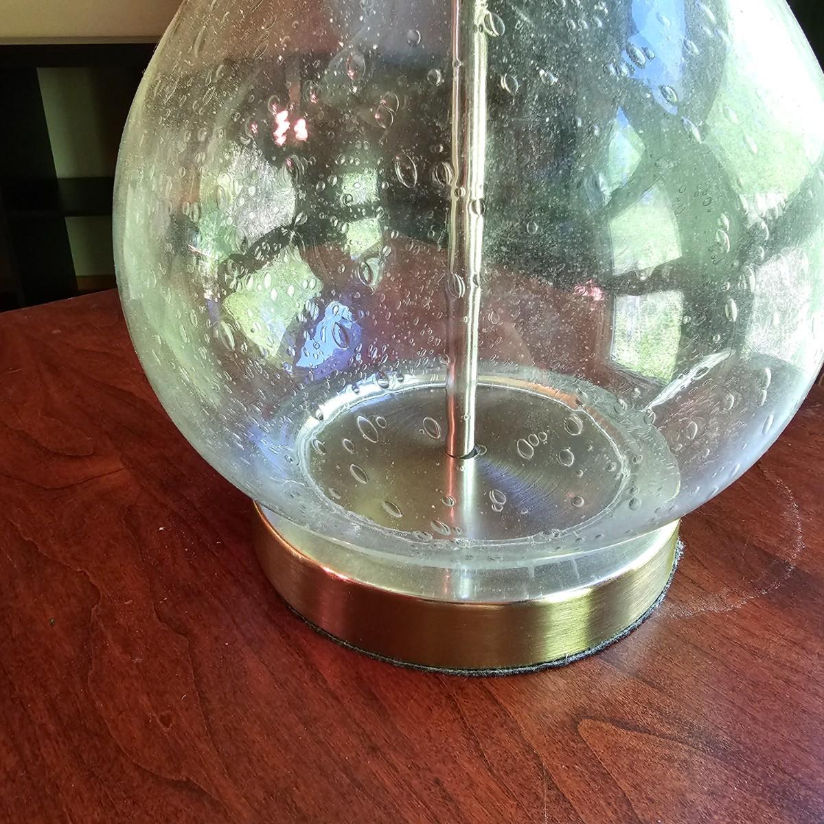 A glass table lamp with bubbles in the body piece. Light gray fabric shade, lamp measures 15"D x 25"H. Brass colored base. Lamp powered on when plugged in. See photos for details. Shipping available.