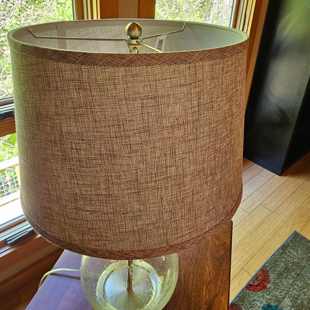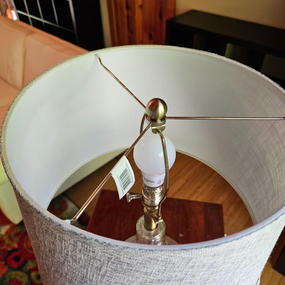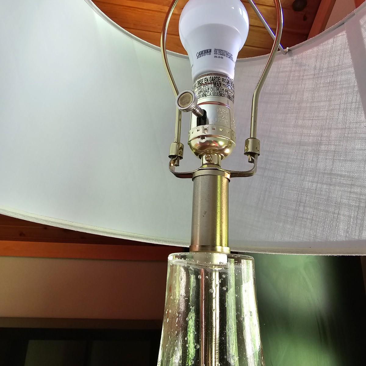 A glass table lamp with bubbles in the body piece. Light gray fabric shade, lamp measures 15"D x 25"H. Brass colored base. Lamp powered on when plugged in. See photos for details. Shipping available.