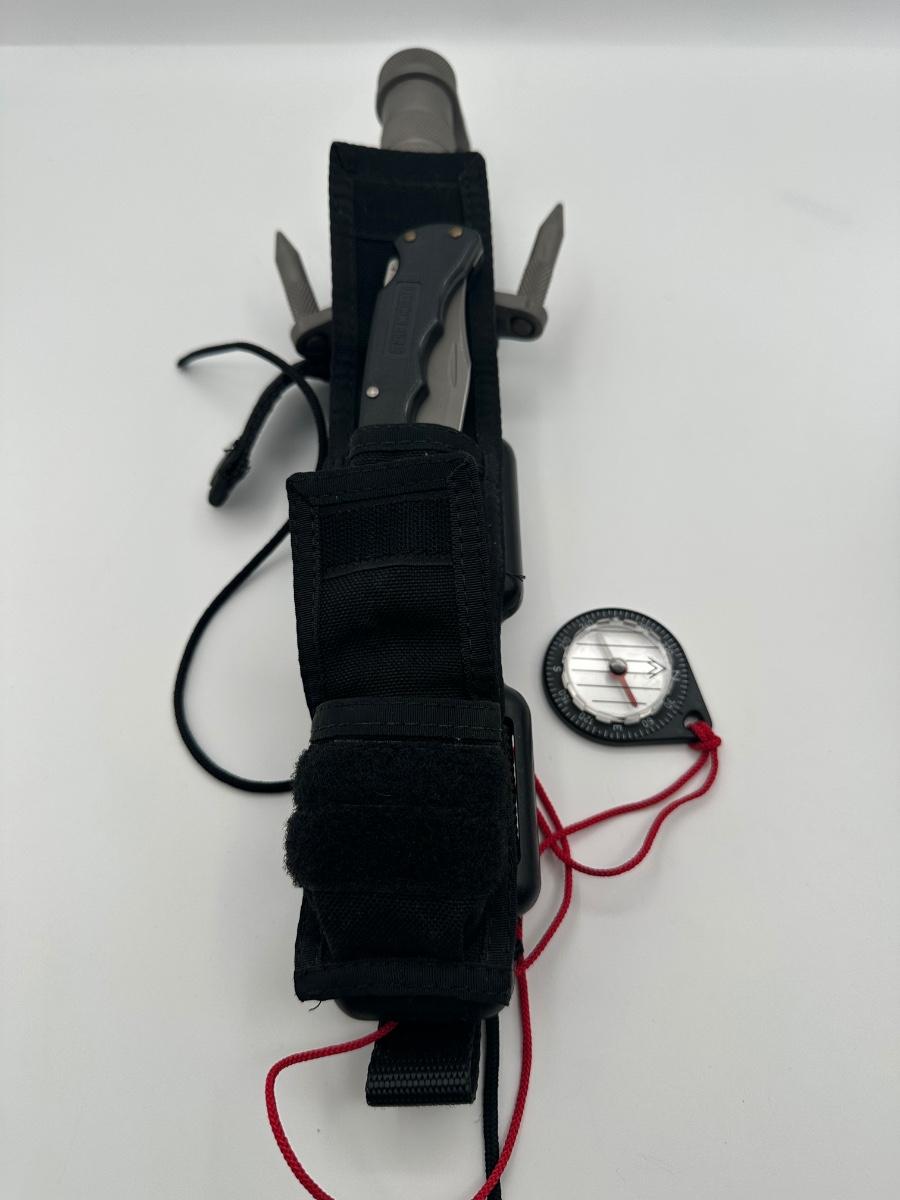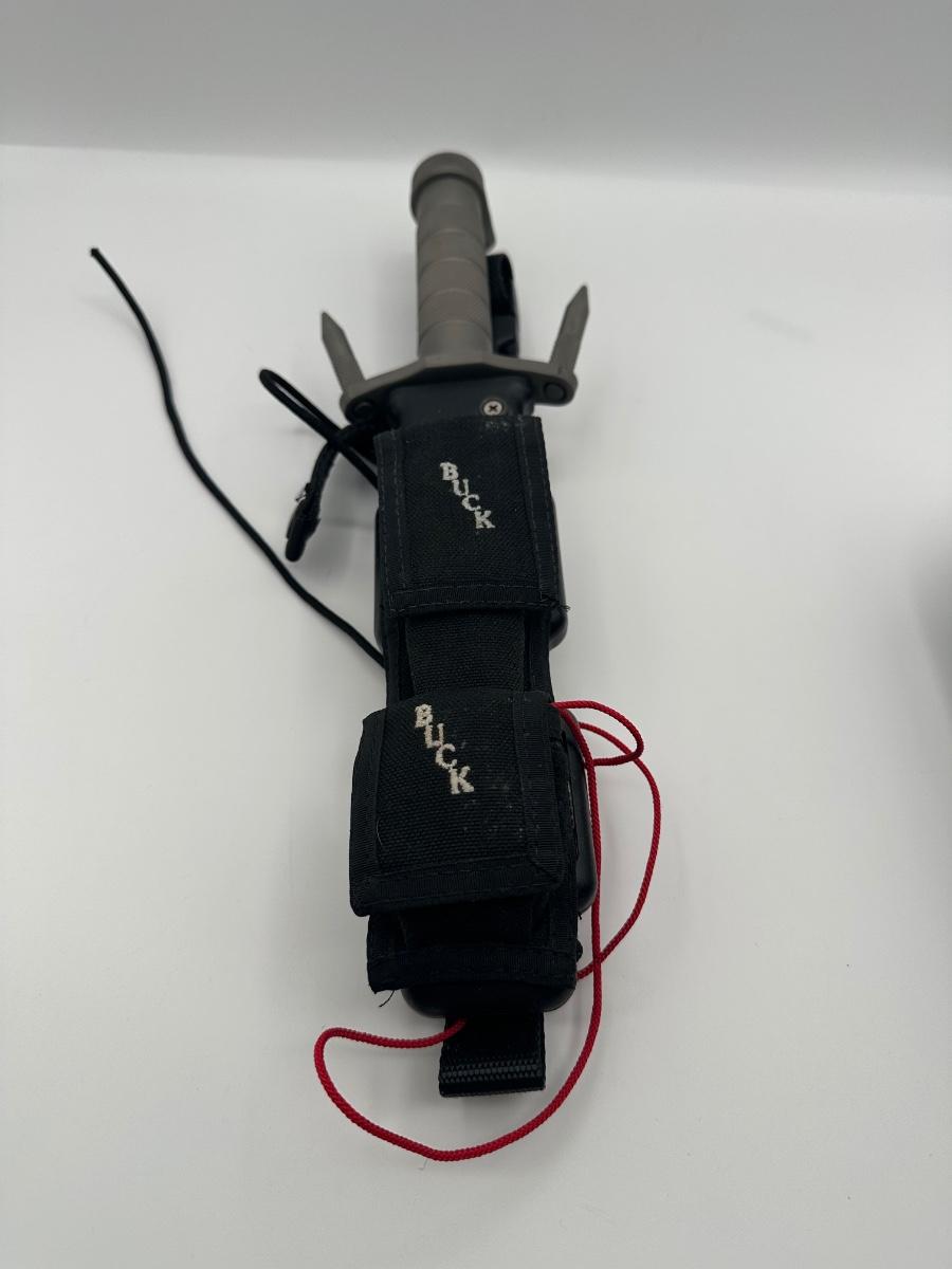 • Sheath: Nylon with multiple pouches (yours includes a folding Buck knife and a compass attached)