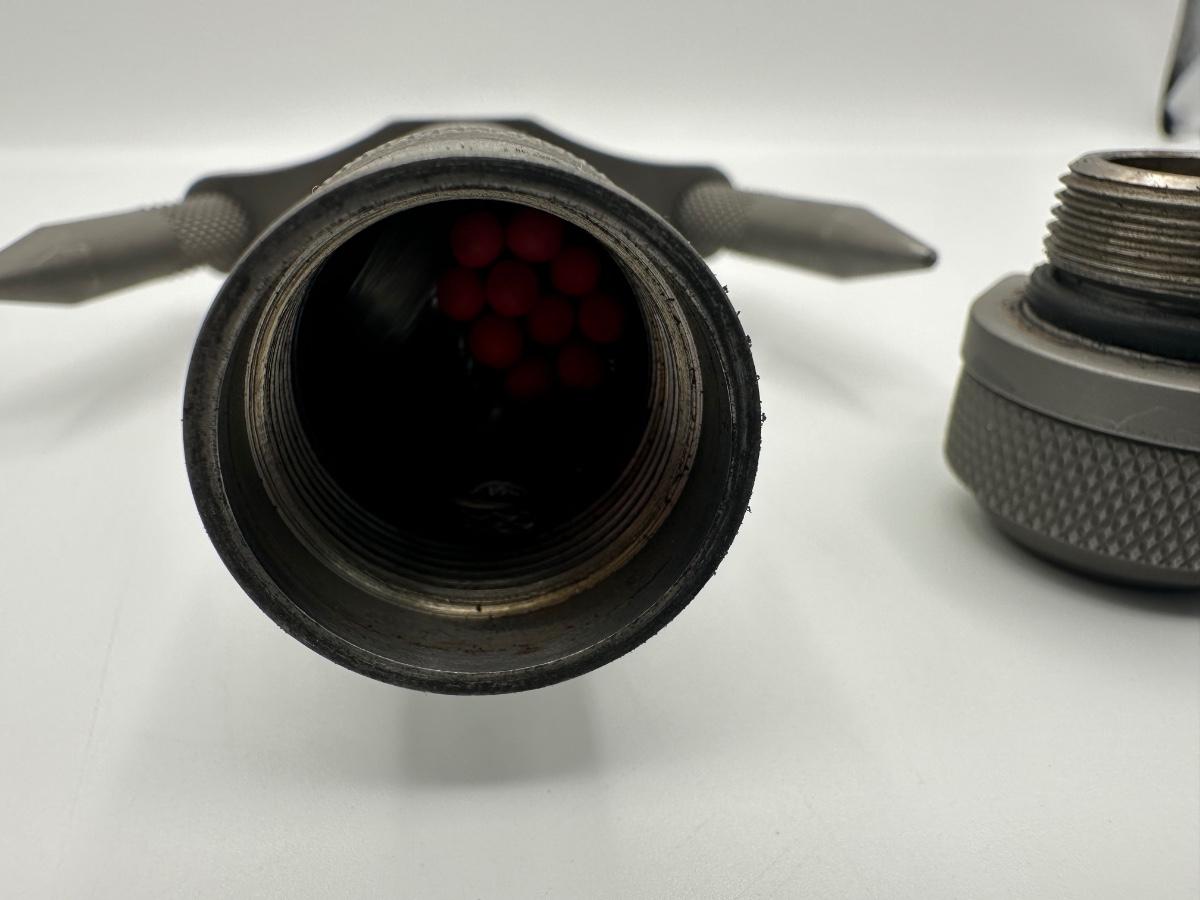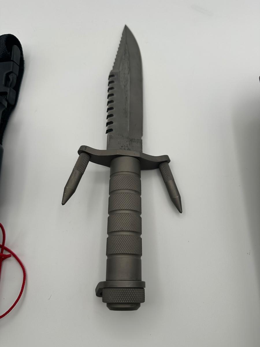 • Handle: Hollow, knurled aluminum handle (used for survival storage; contains fishing hook, line, matches, nail, etc