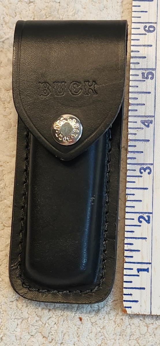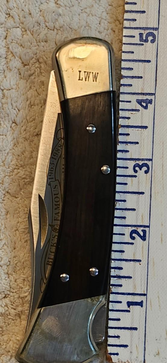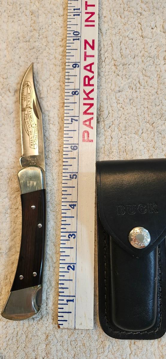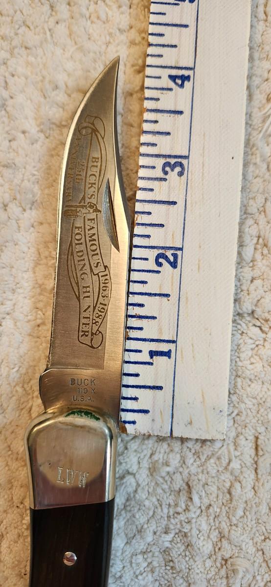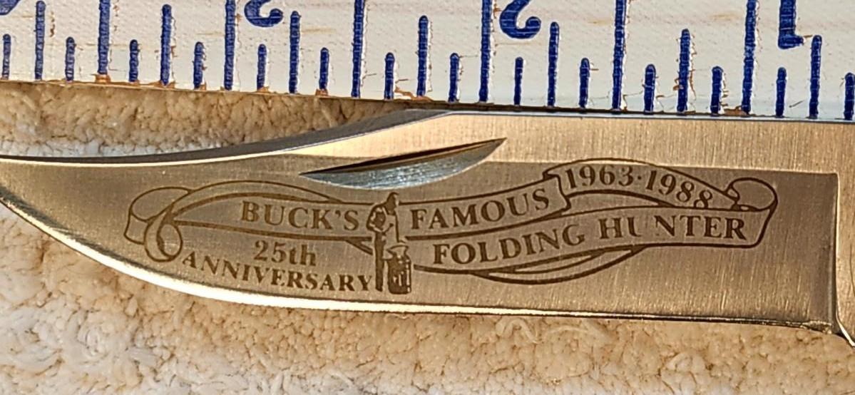 This is a great knife but a small tip is broken off, see photo The blade has a banner with "Buck's Famous Folding Hunter 1963-1988", 25th Anniversary and a picture of a blacksmith and anvil etched on it The bolsters are nickel silver with 3 stainless inlay pins and a stainless rocker rivet. Comes with a black leather sheath Please see pictures for size and condition