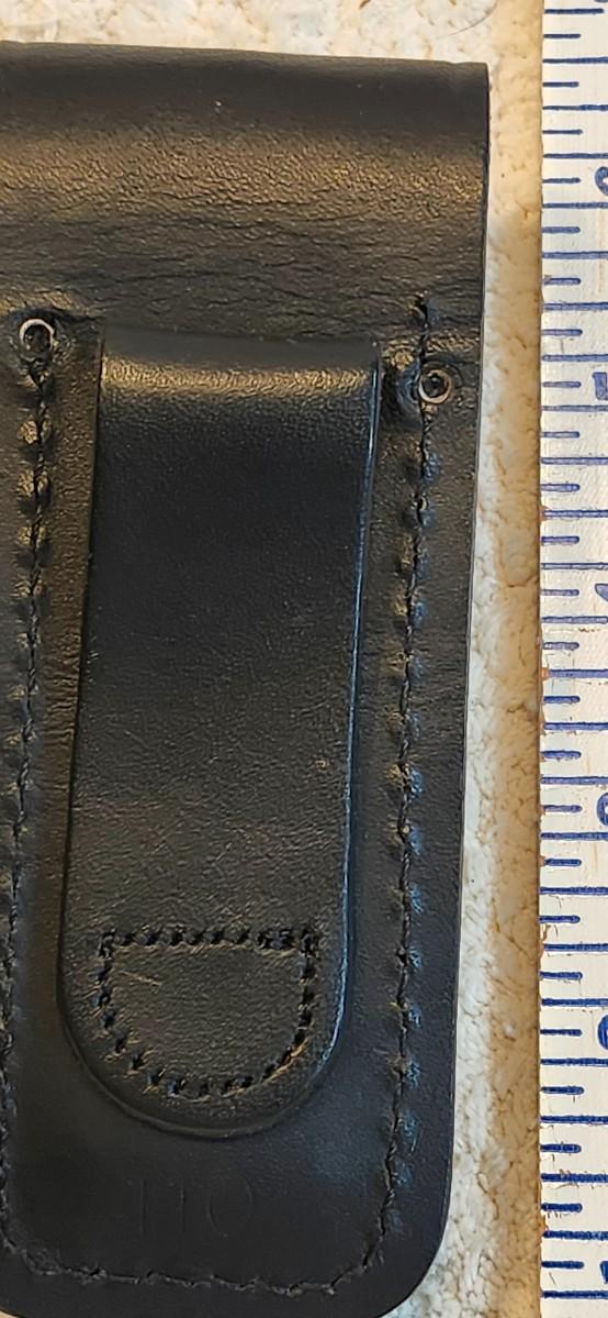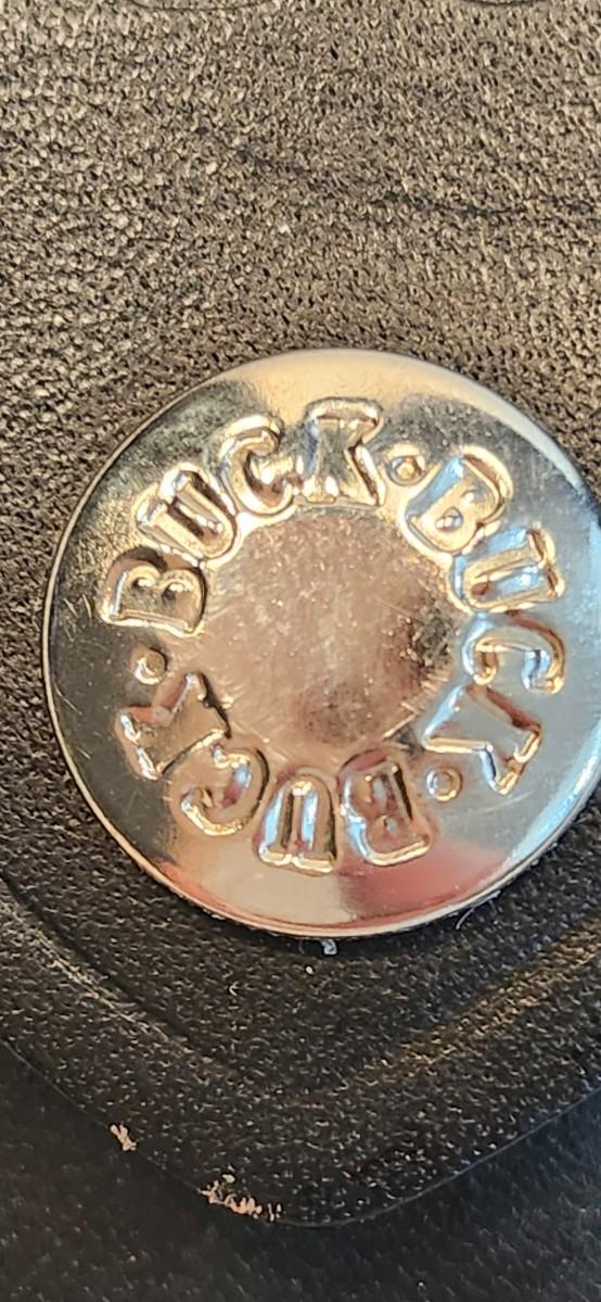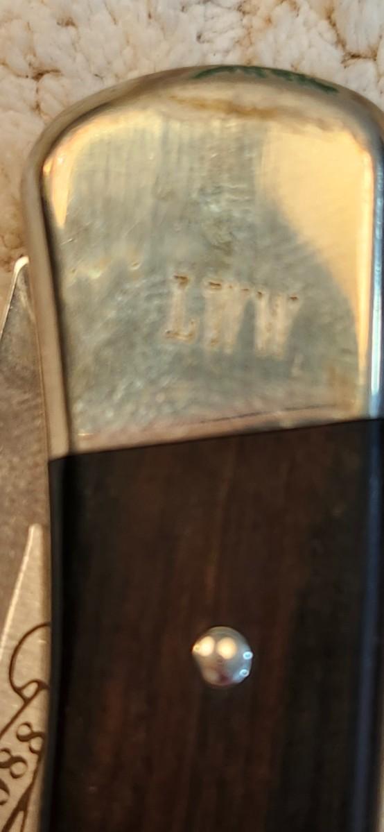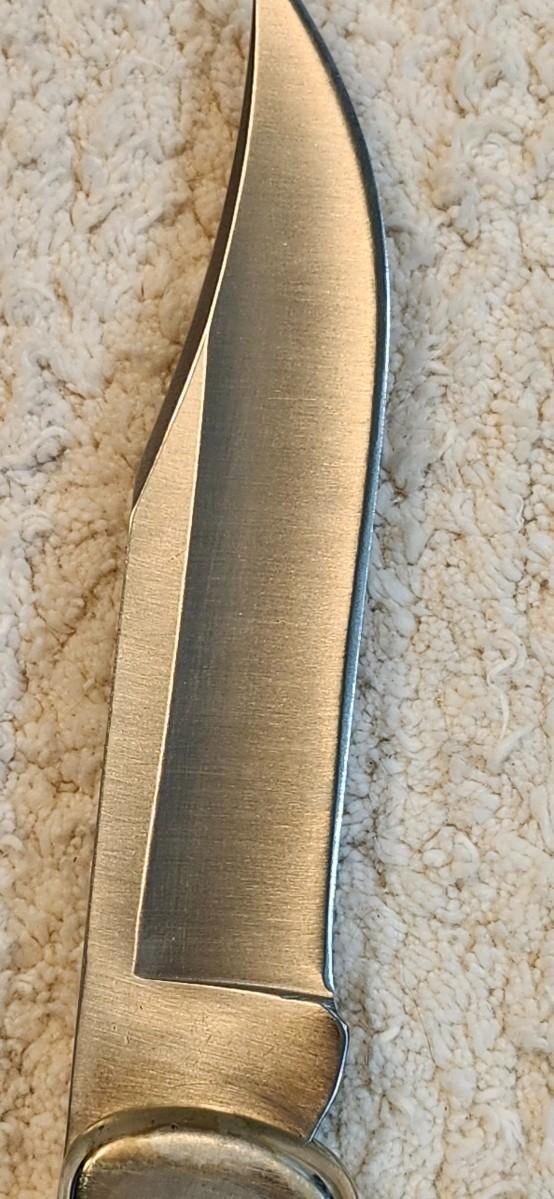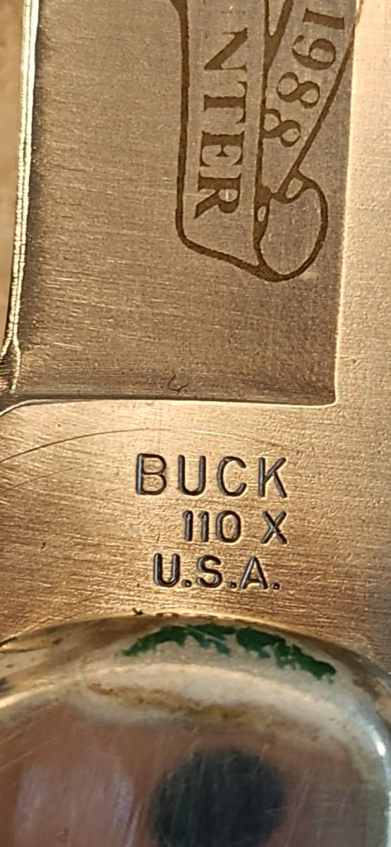 This is a great knife but a small tip is broken off, see photo The blade has a banner with "Buck's Famous Folding Hunter 1963-1988", 25th Anniversary and a picture of a blacksmith and anvil etched on it The bolsters are nickel silver with 3 stainless inlay pins and a stainless rocker rivet. Comes with a black leather sheath Please see pictures for size and condition
