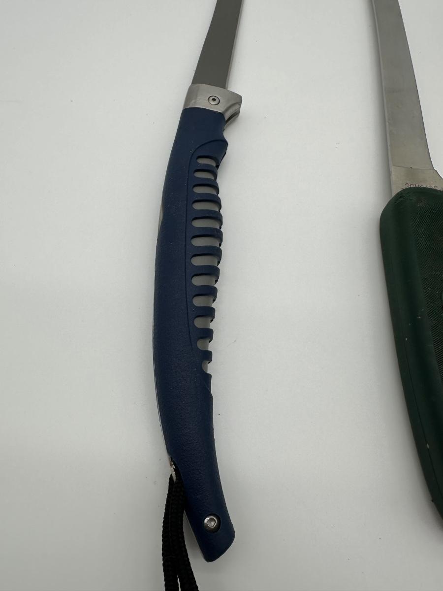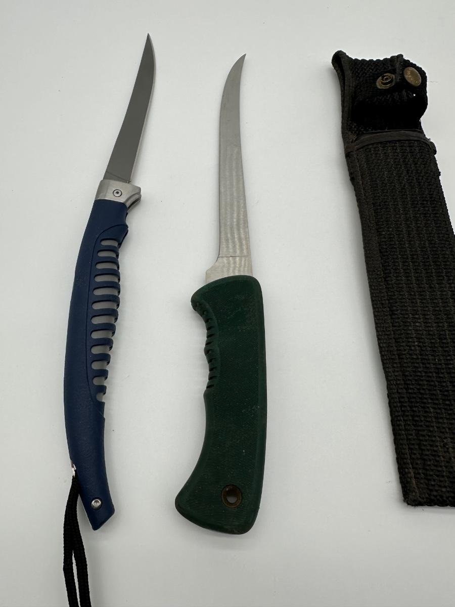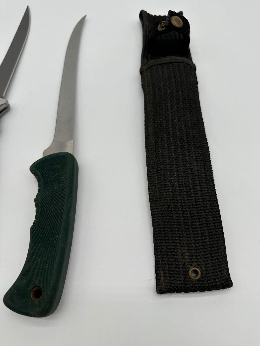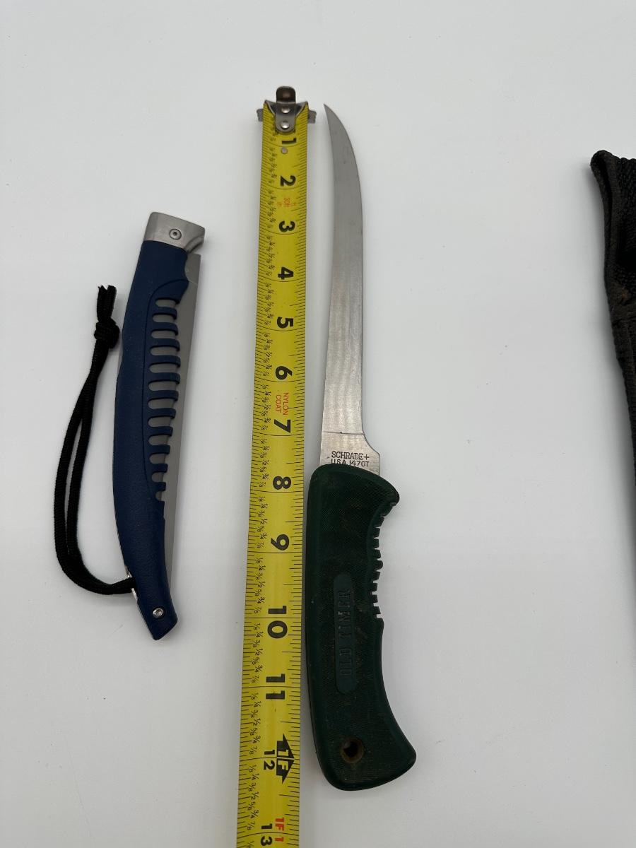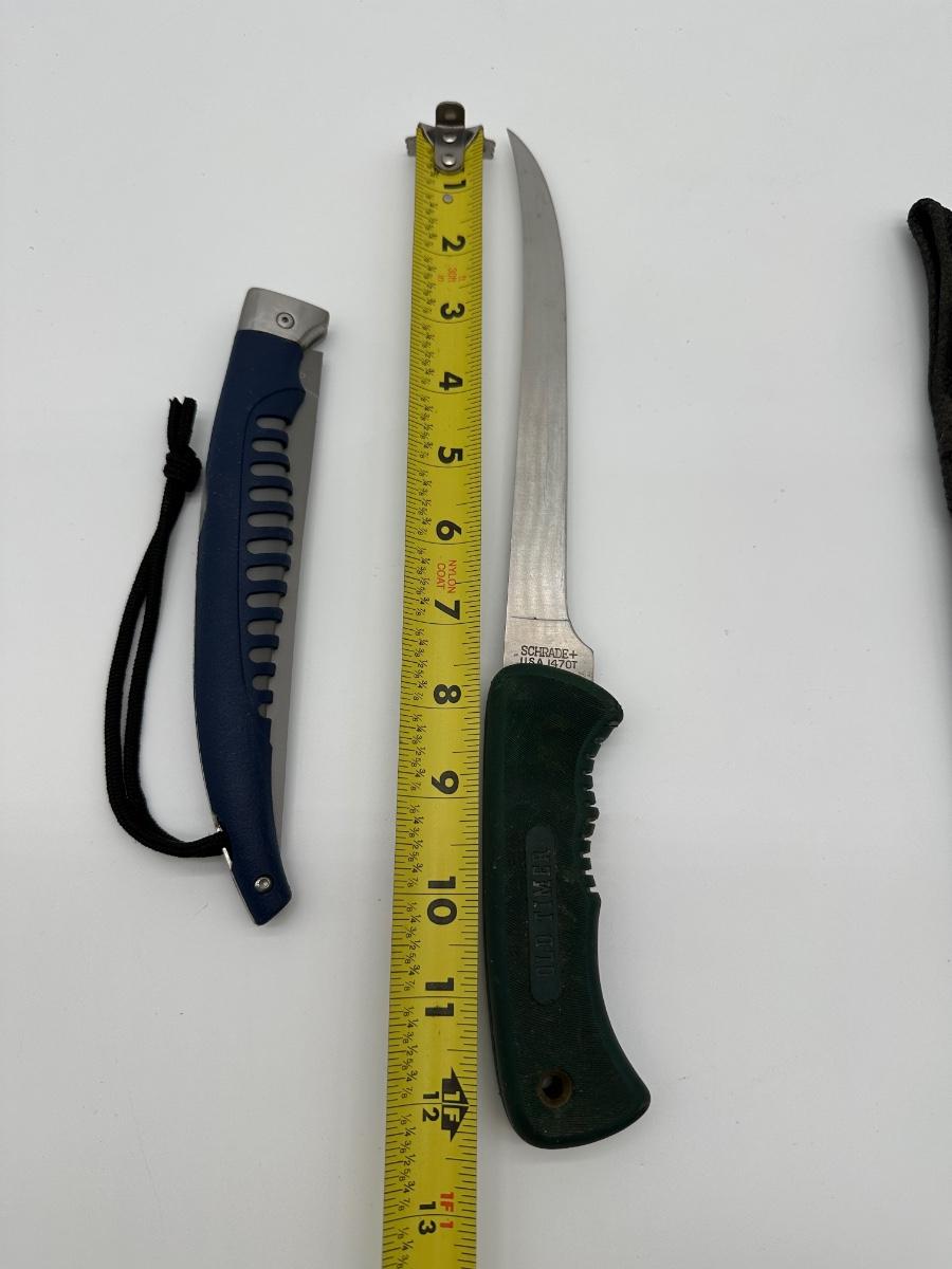Two quality USA-made knives sold together. Includes a Buck 220 fillet knife with blue rubberized handle and a Schrade Old Timer 147OT long fillet/boning knife with green handle. Schrade includes the original canvas sheath. Great setup for fishing, hunting, or camp kitchen use.