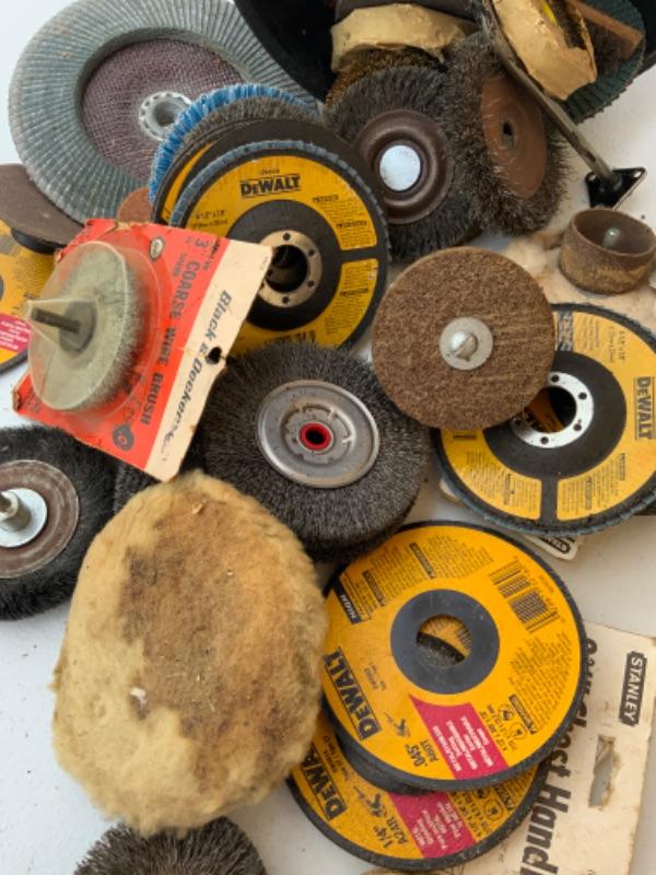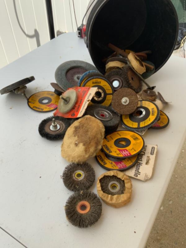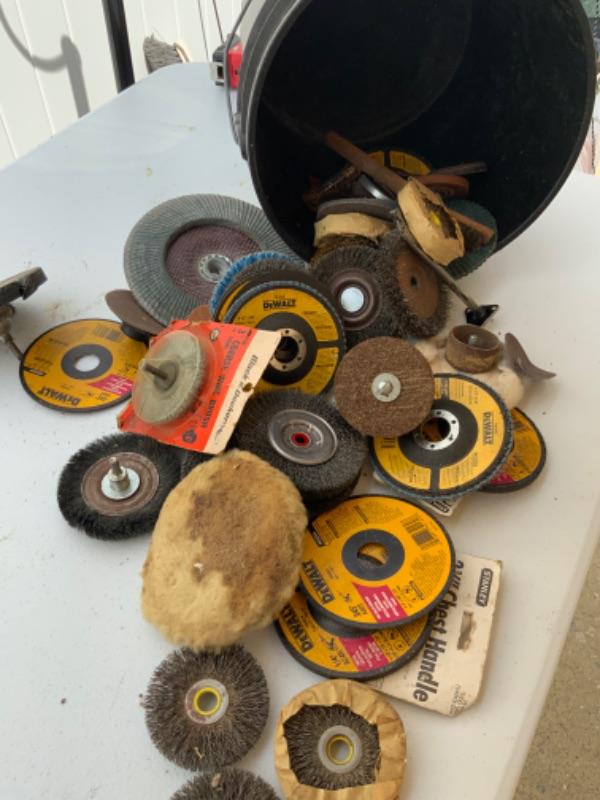 Bucket full of assorted sanding wheels, brush wheels,, grinder wheels lot 2589