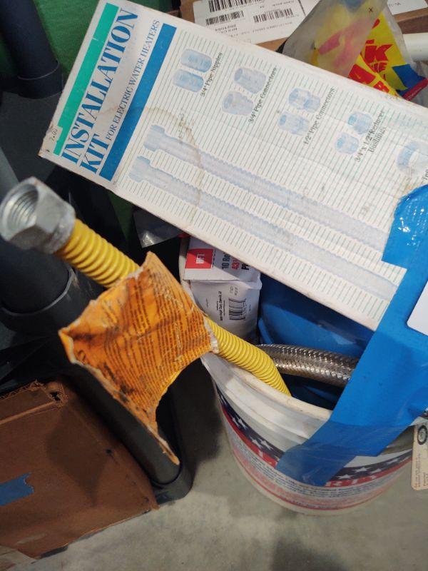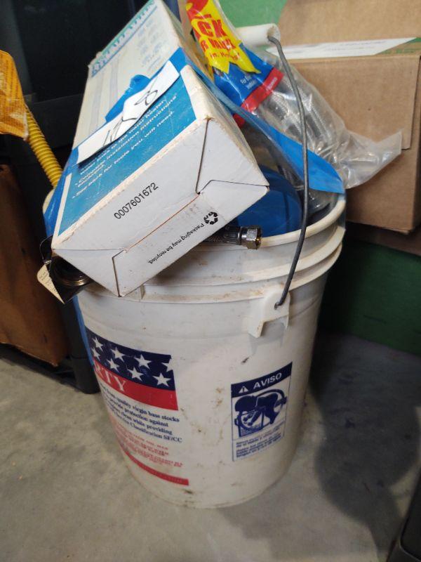 Bucket of assorted plumbing tubing, water heater installation kit etc. as shown.
