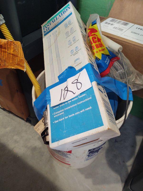 lot 128 -Bucket of assorted plumbing tubing, water heater installation kit etc.