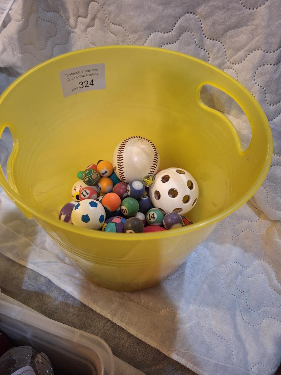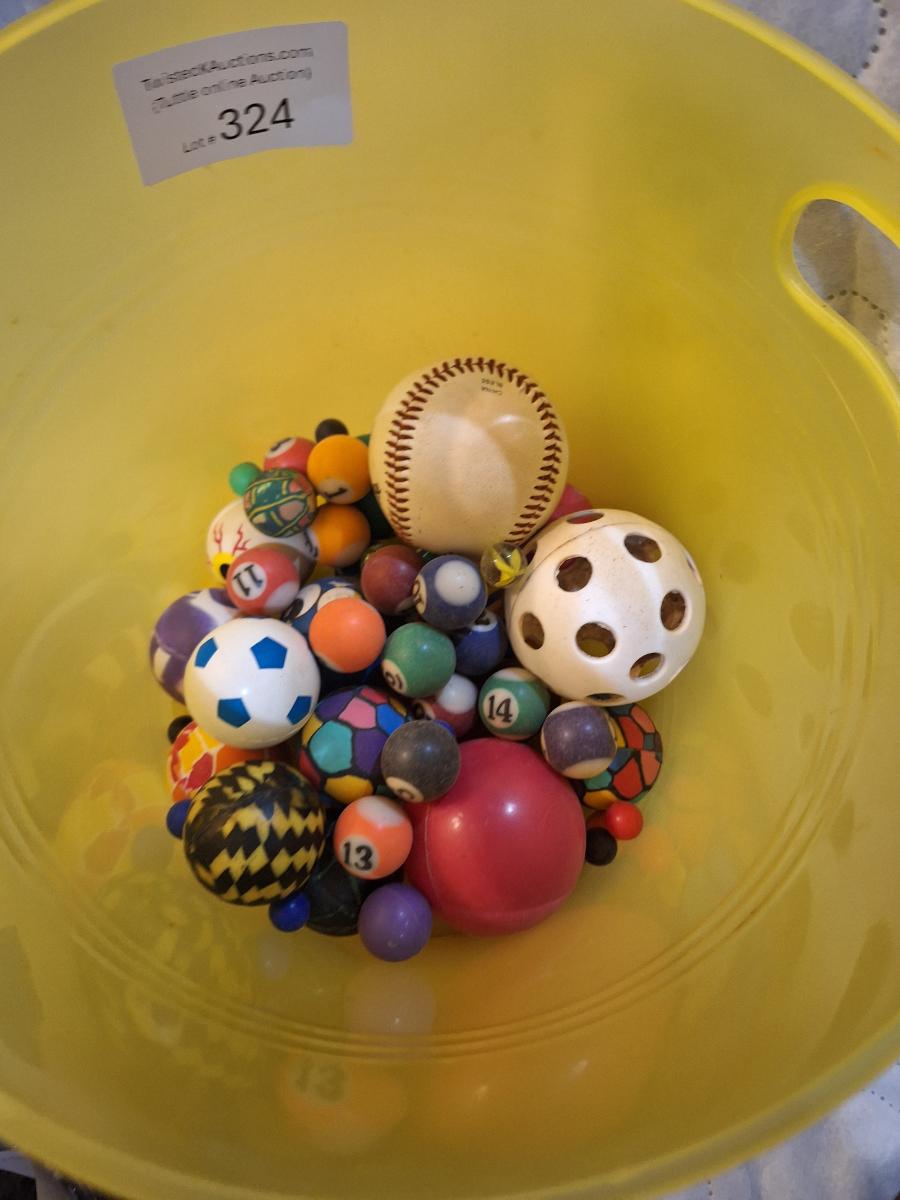 bucket of bouncy balls, a baseball and others