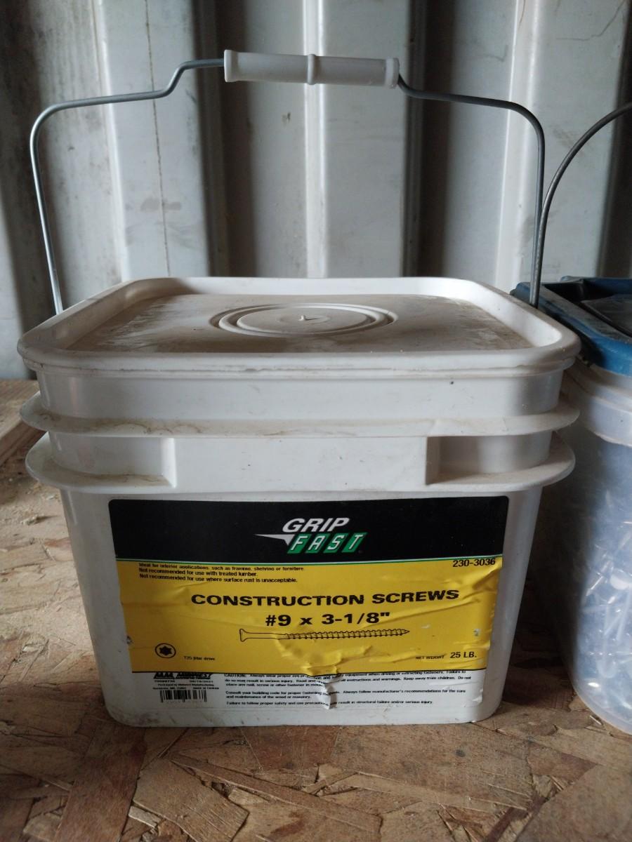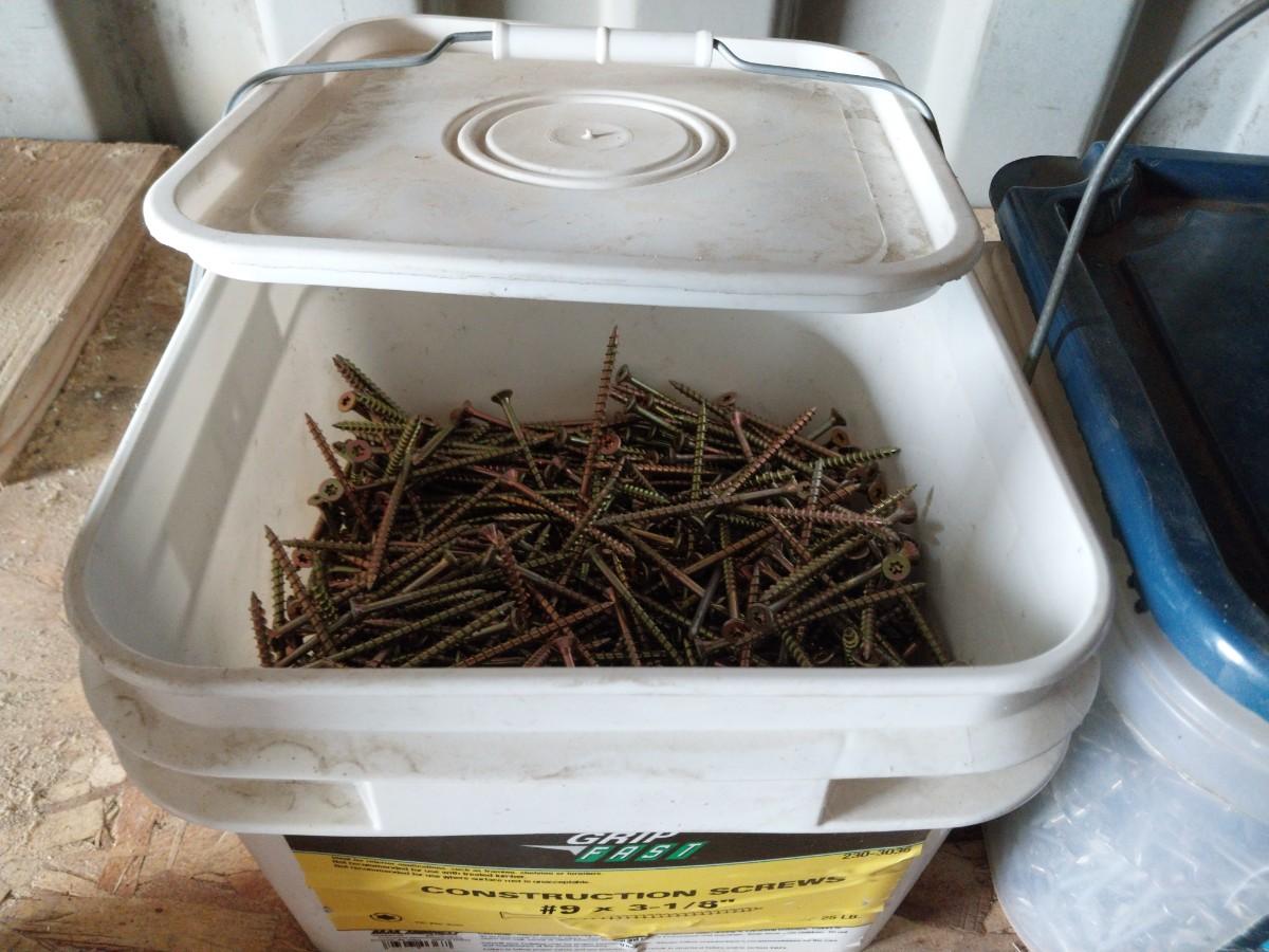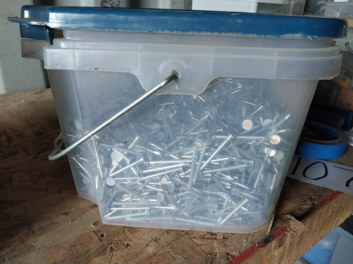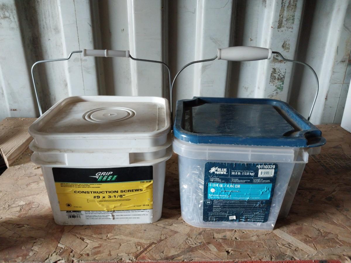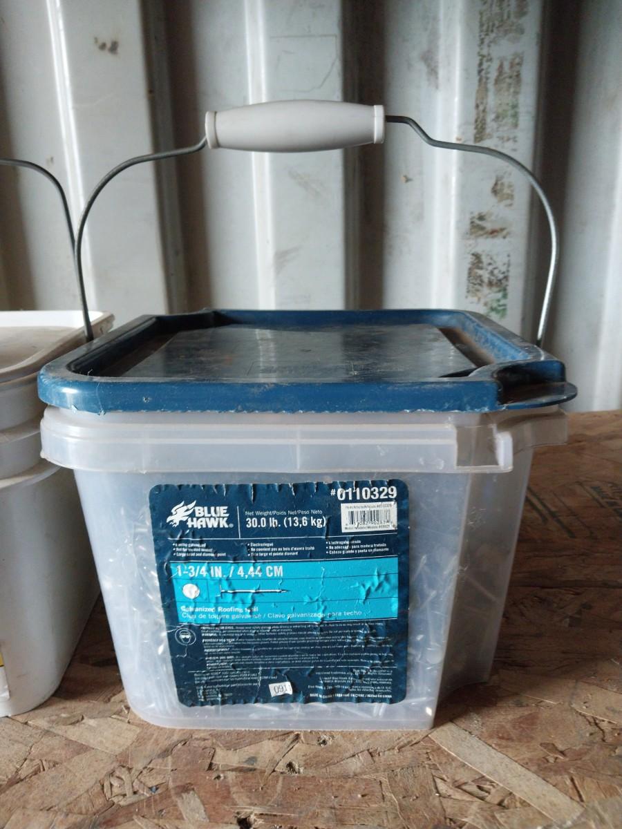 BUCKET OF CONSTRUCTION SCREWS AND GALVINIZED ROOFING NAILS