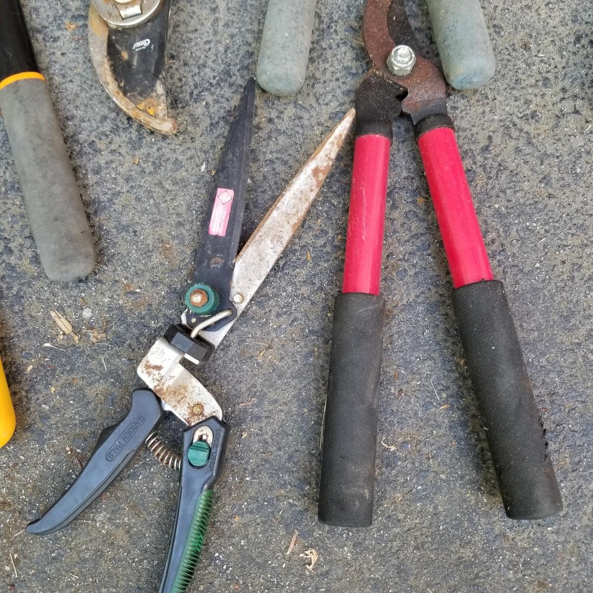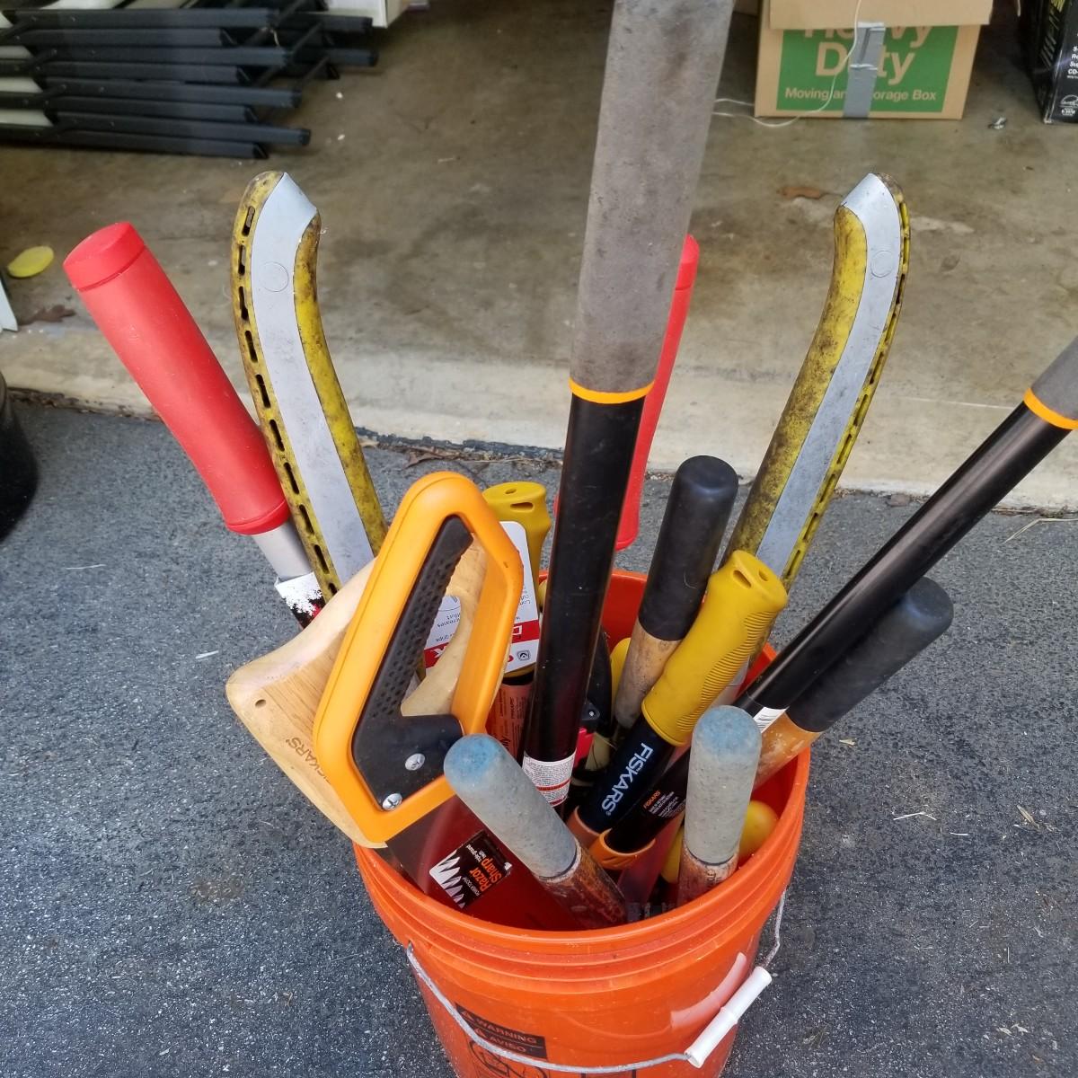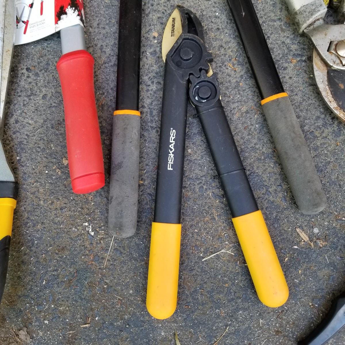 A mixture of saws, pruners and loppers, some older and some new. Fiskars and other brands, see photos for details. Bucket included. Local pickup only.