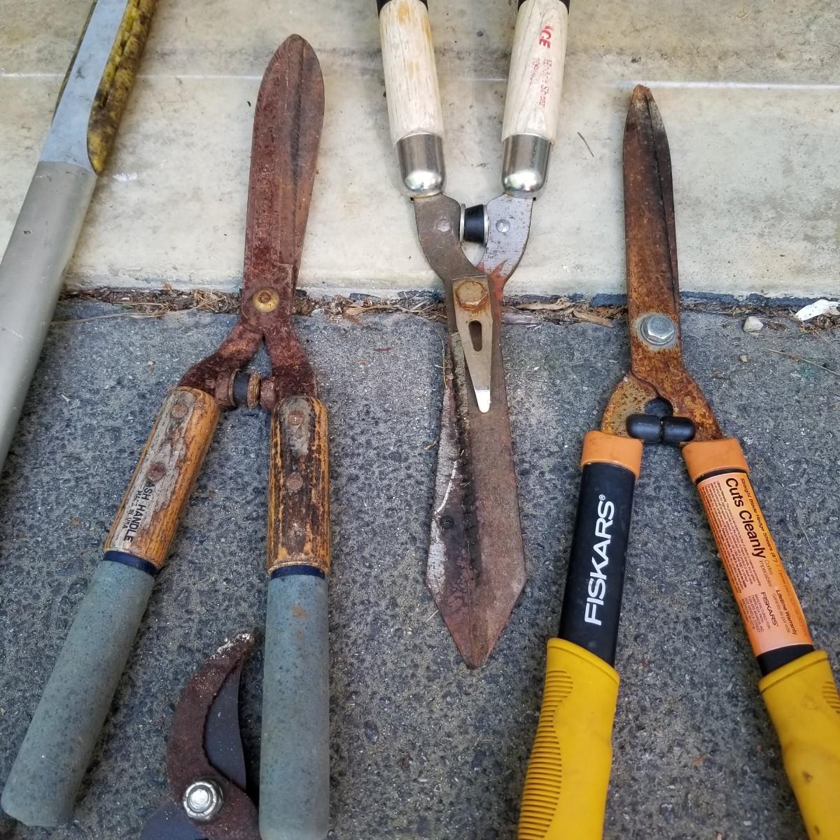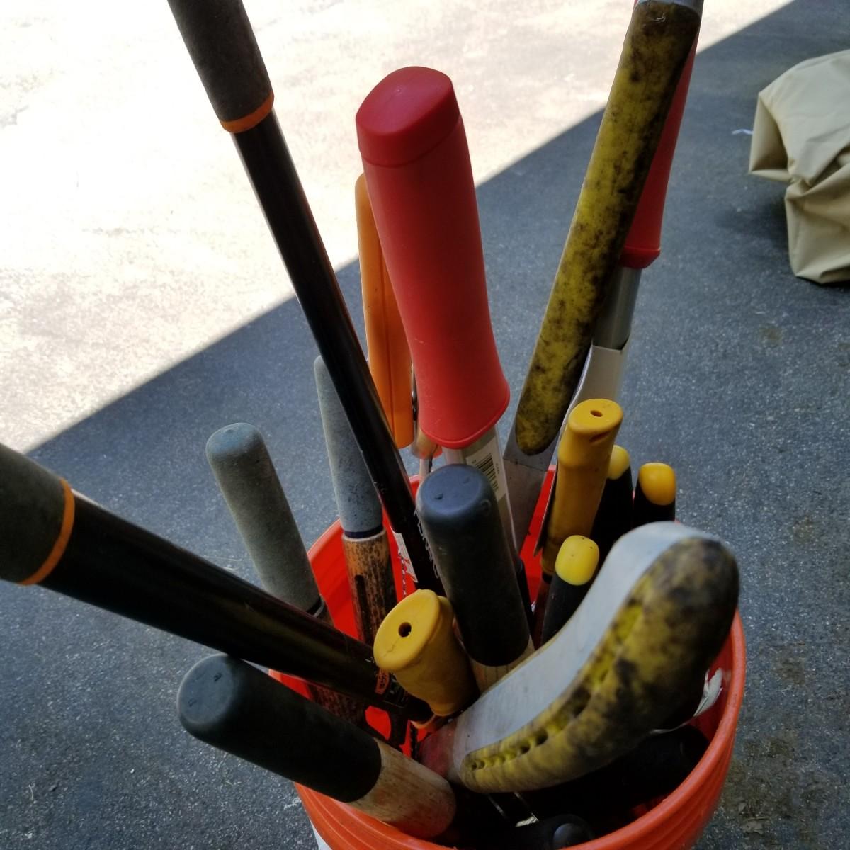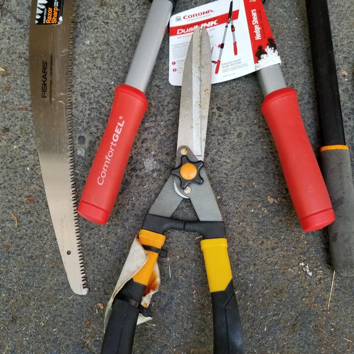 A mixture of saws, pruners and loppers, some older and some new. Fiskars and other brands, see photos for details. Bucket included. Local pickup only.