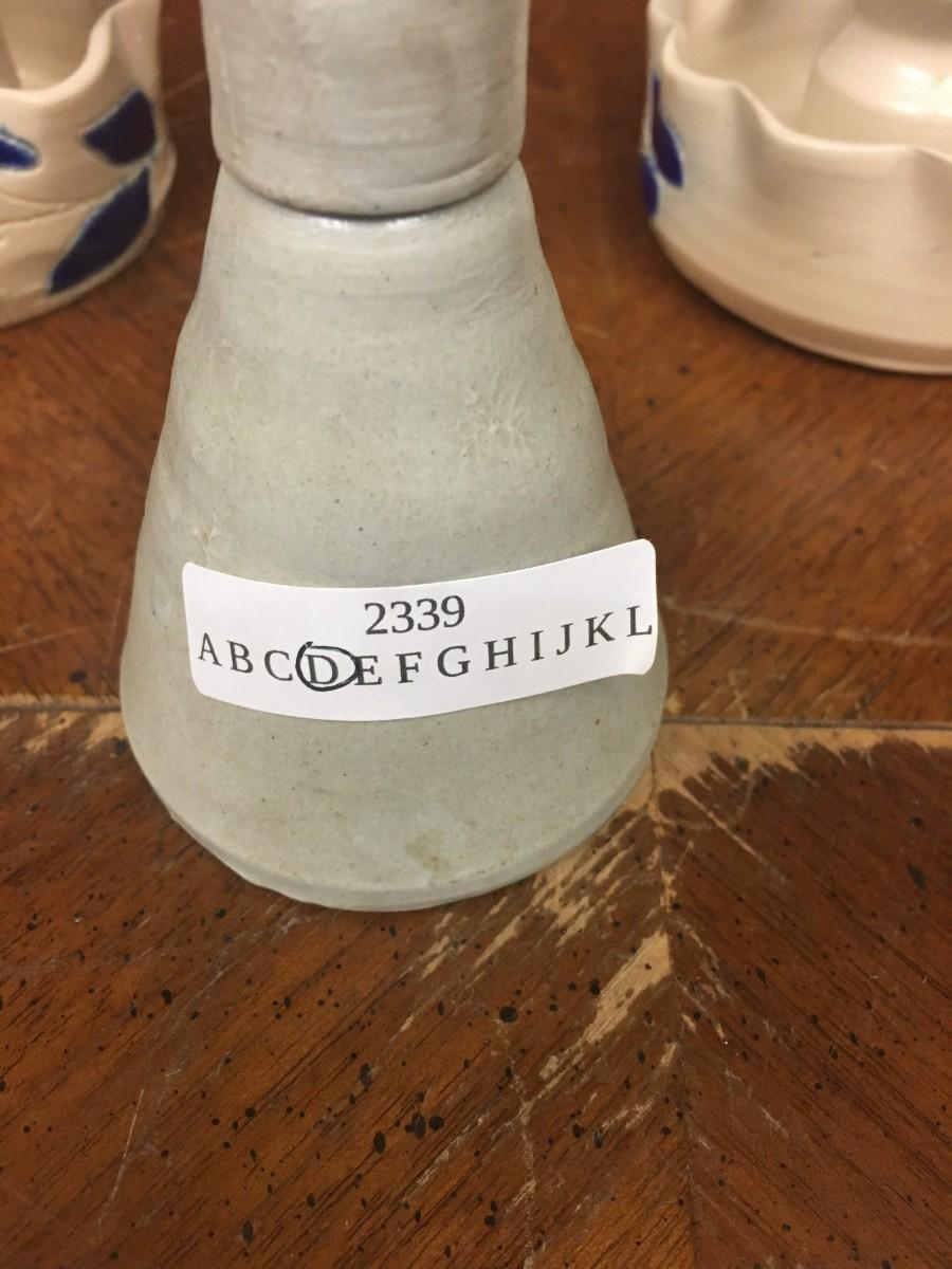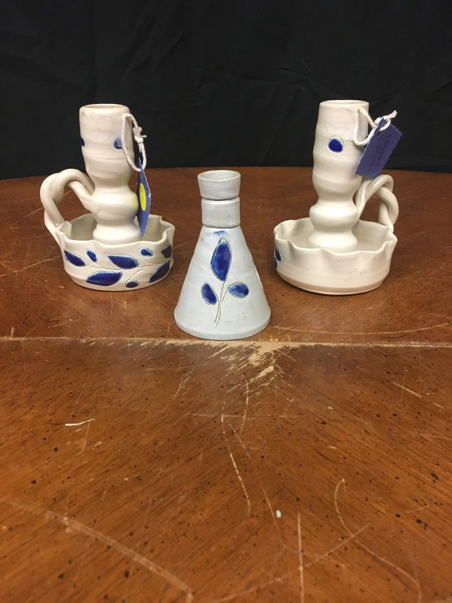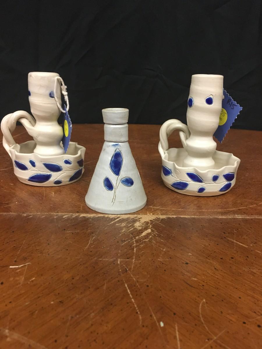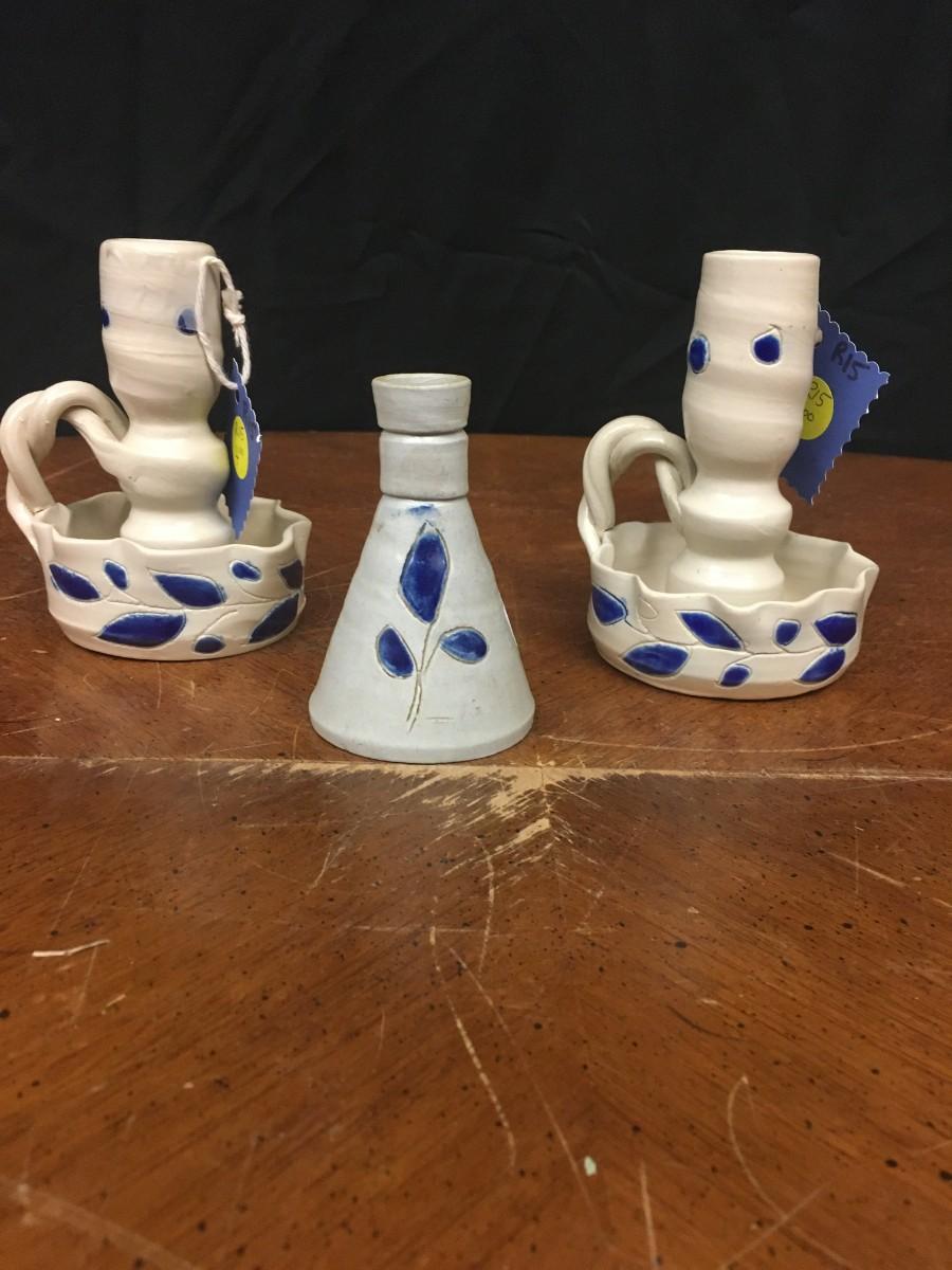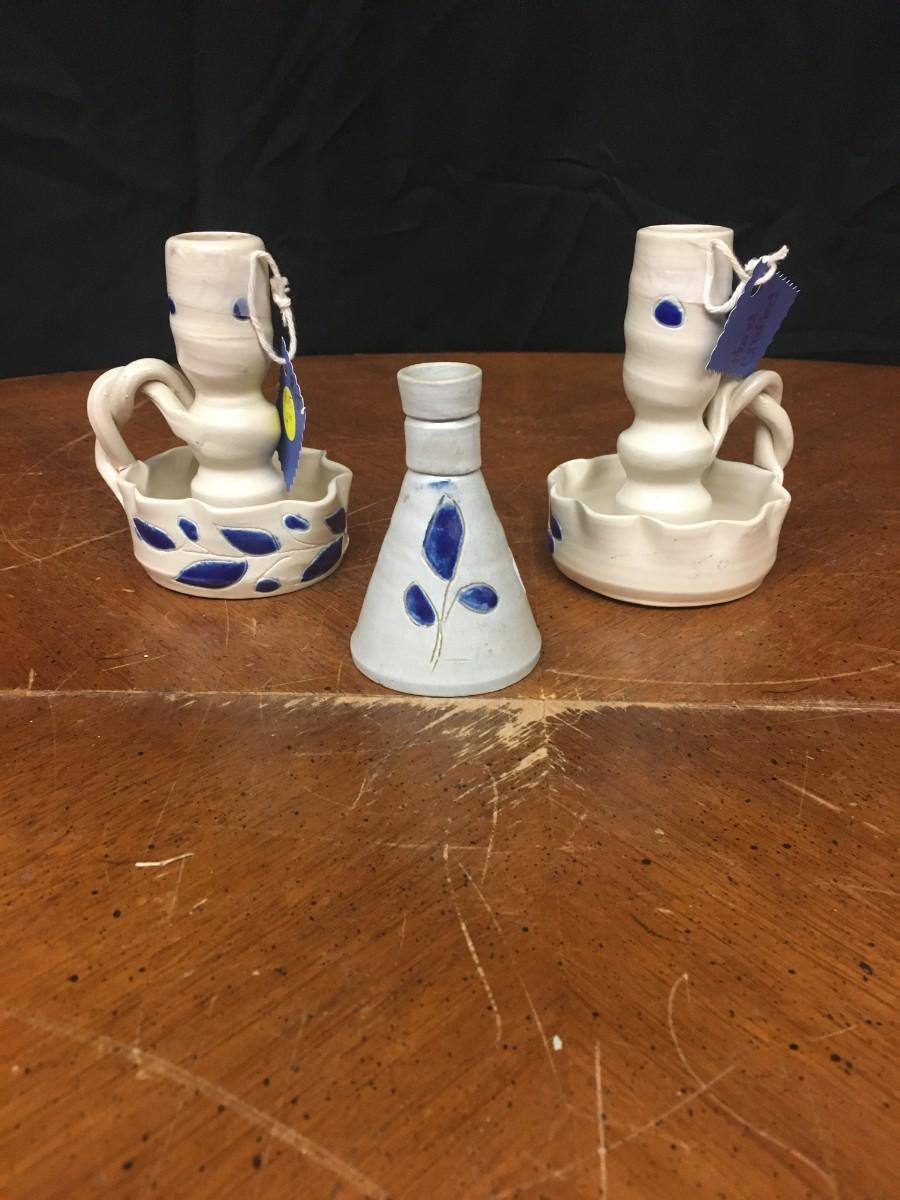 pottery : bud vase and 2 candlesticks, handmade pottery;