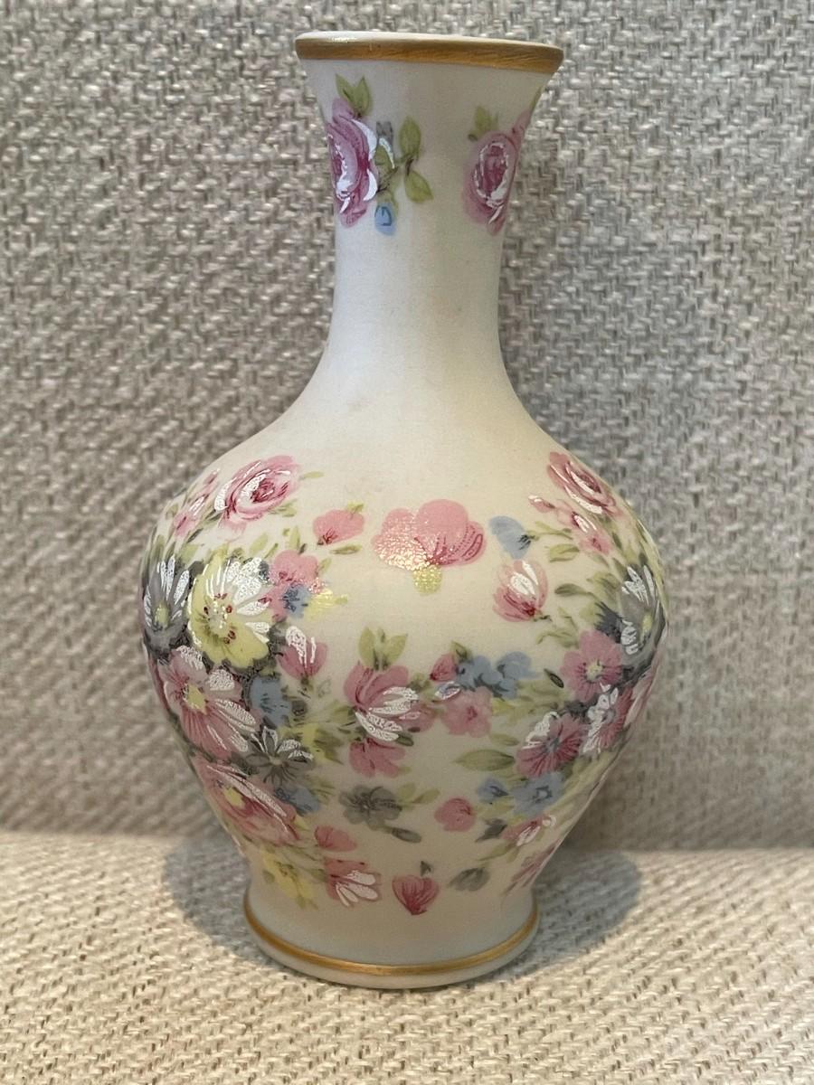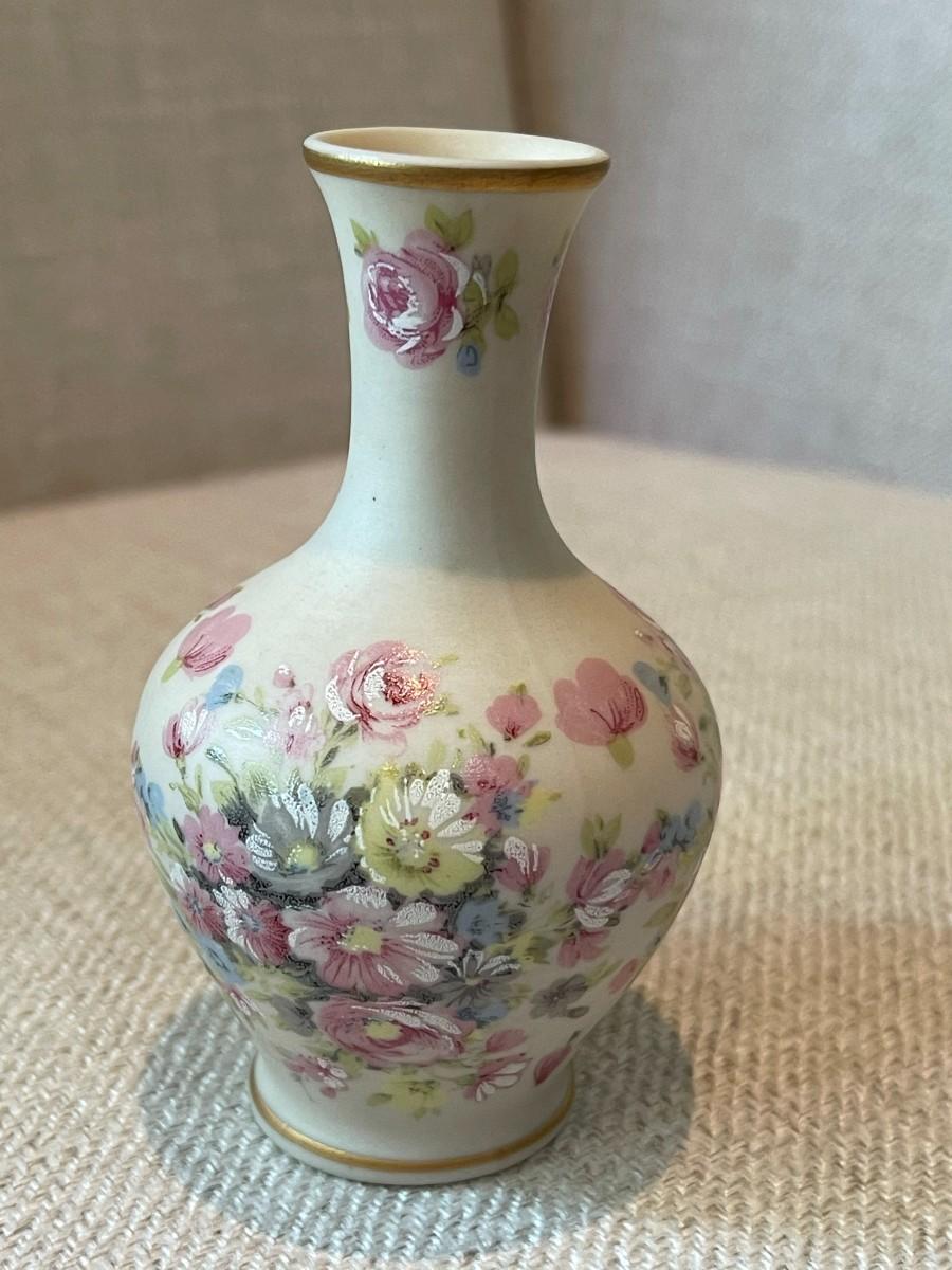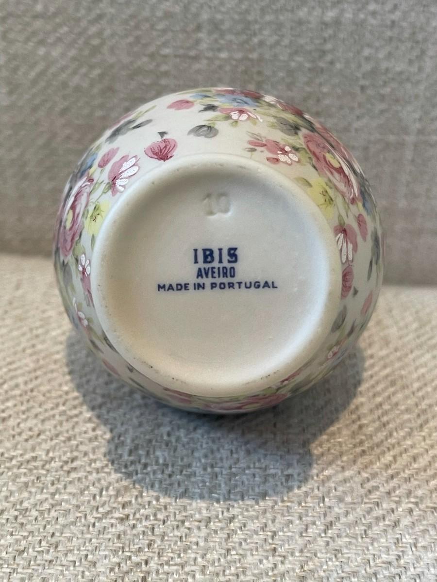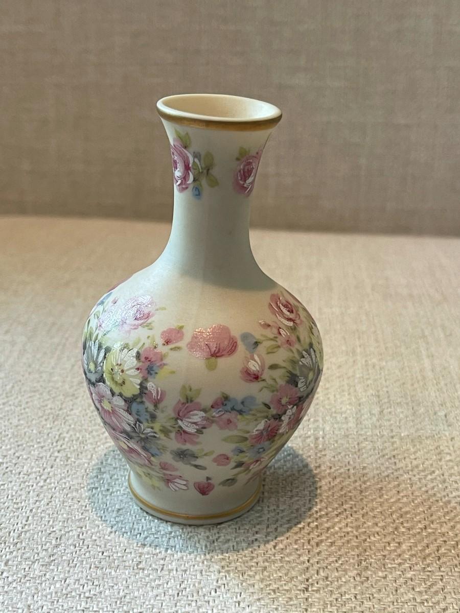 IBIS AVEIRO miniature porcelain bud vase, Roses. Cream colored vases with pastel rose design. Gold leaf trim around top and base.