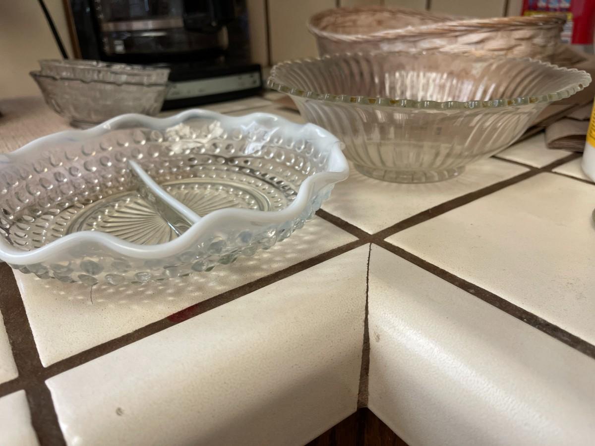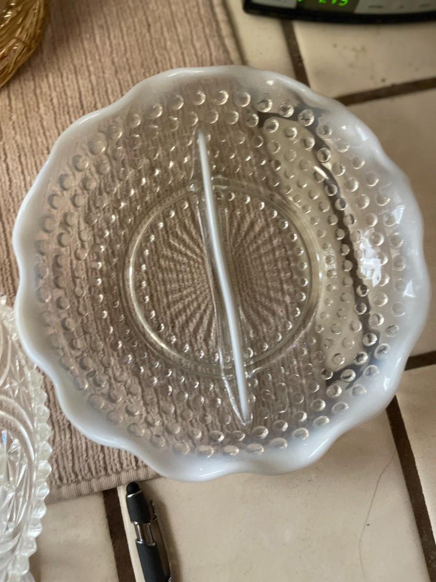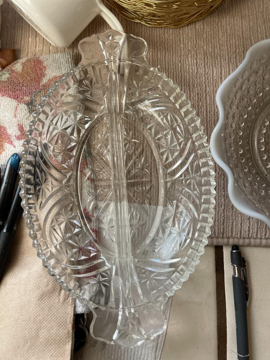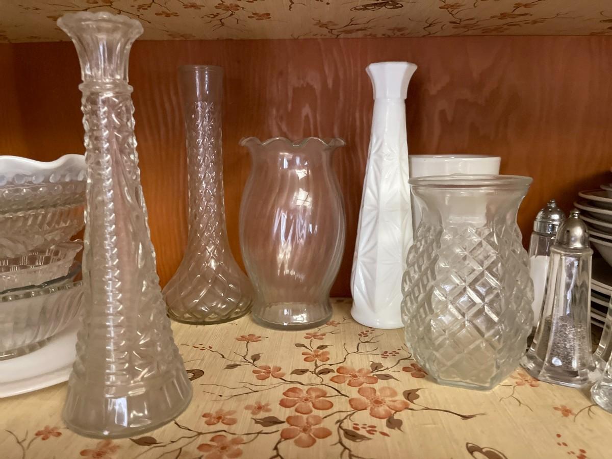 3 Bud Vases, Swirl Vase & Pineapple Vase, Ashtrays. Vintage Opalescent Moonstone Hobnail Divided Bowl, Vintage Anchor Hocking Stars, And Bars Sawtooth Edge Divided Dish, Federal Milk Glass Plate, Vintage Divided Starburst Relish/Candy Dish & Butter Dish with lid & Tupperware Deviled Egg Server