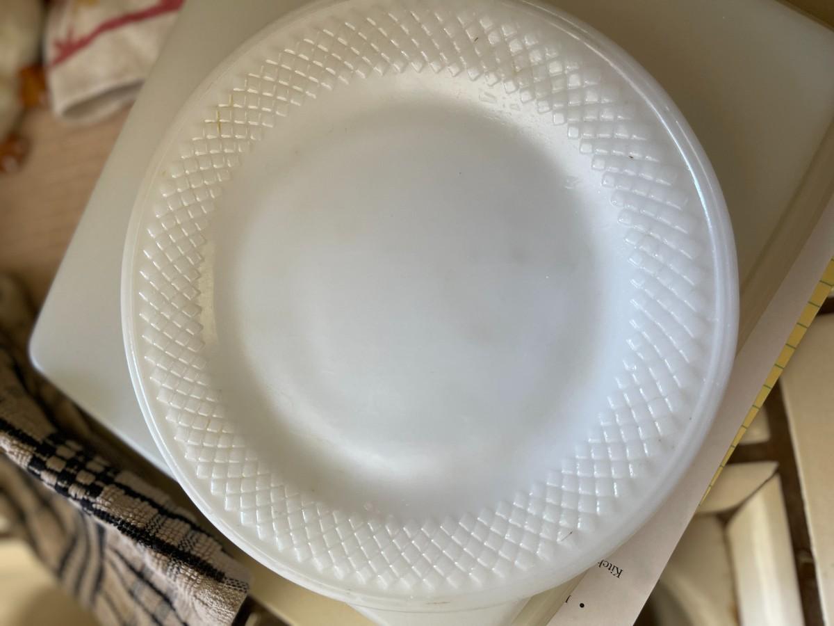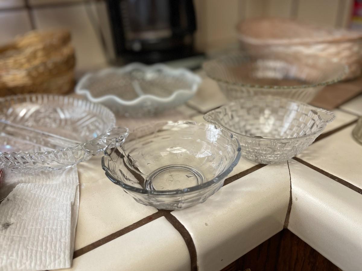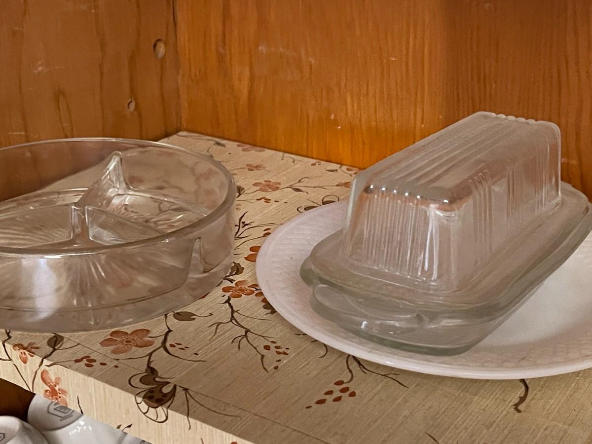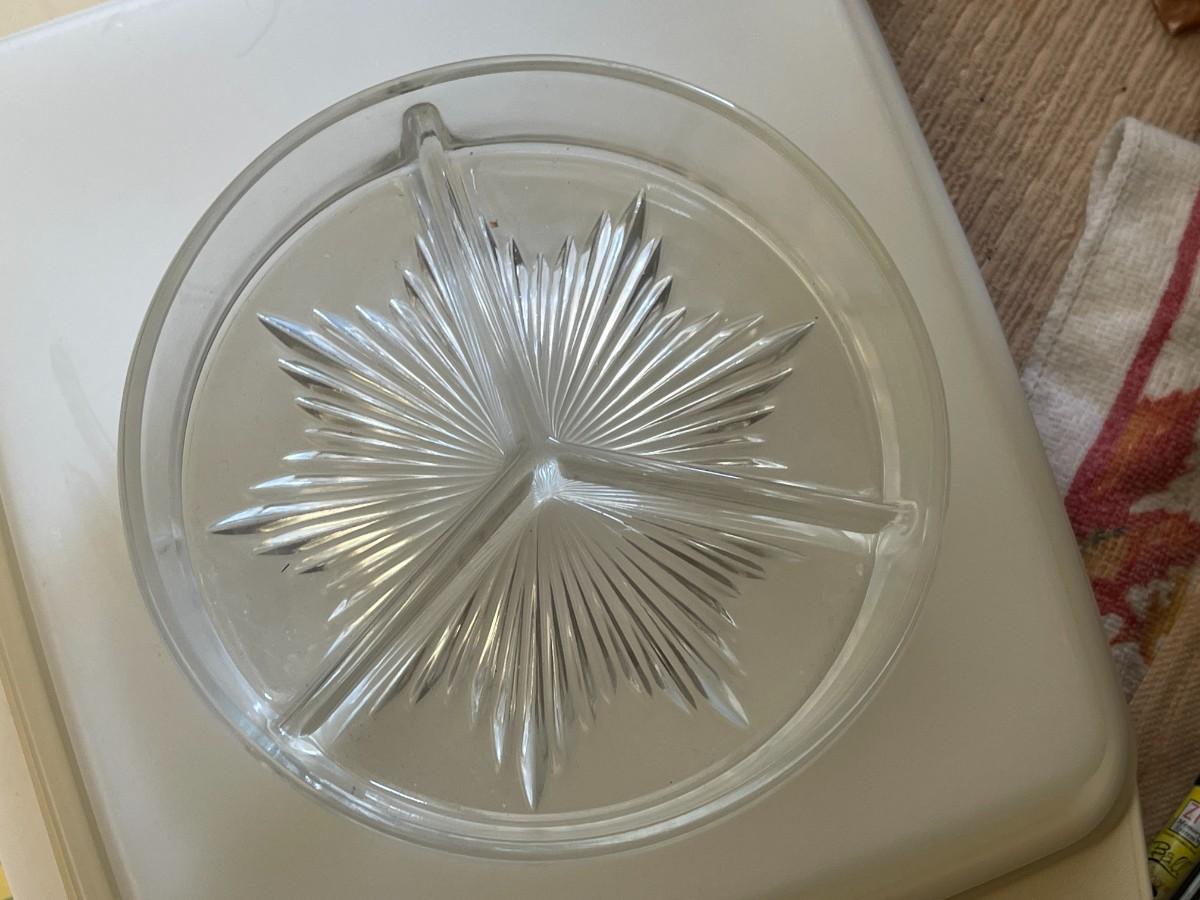3 Bud Vases, Swirl Vase & Pineapple Vase, Ashtrays. Vintage Opalescent Moonstone Hobnail Divided Bowl, Vintage Anchor Hocking Stars, And Bars Sawtooth Edge Divided Dish, Federal Milk Glass Plate, Vintage Divided Starburst Relish/Candy Dish & Butter Dish with lid & Tupperware Deviled Egg Server