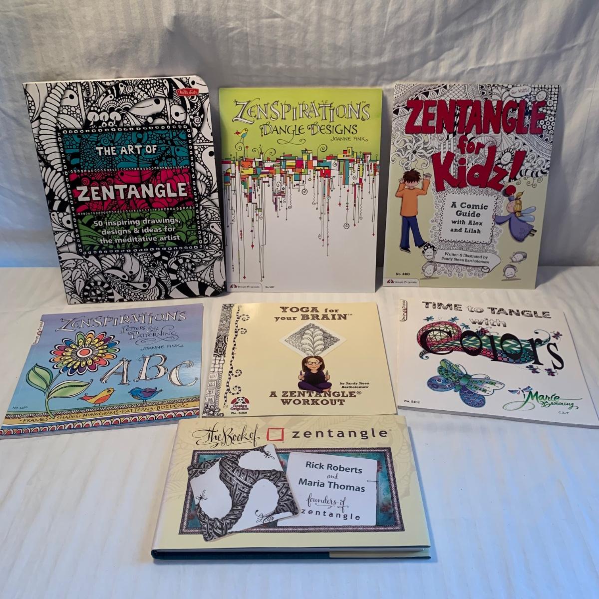 Seven Zentangle themed books, plus a Zen by the Brush set, a Buddha Board, a Zenbroidery pack, and three other books.