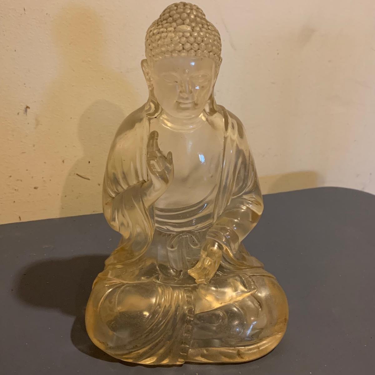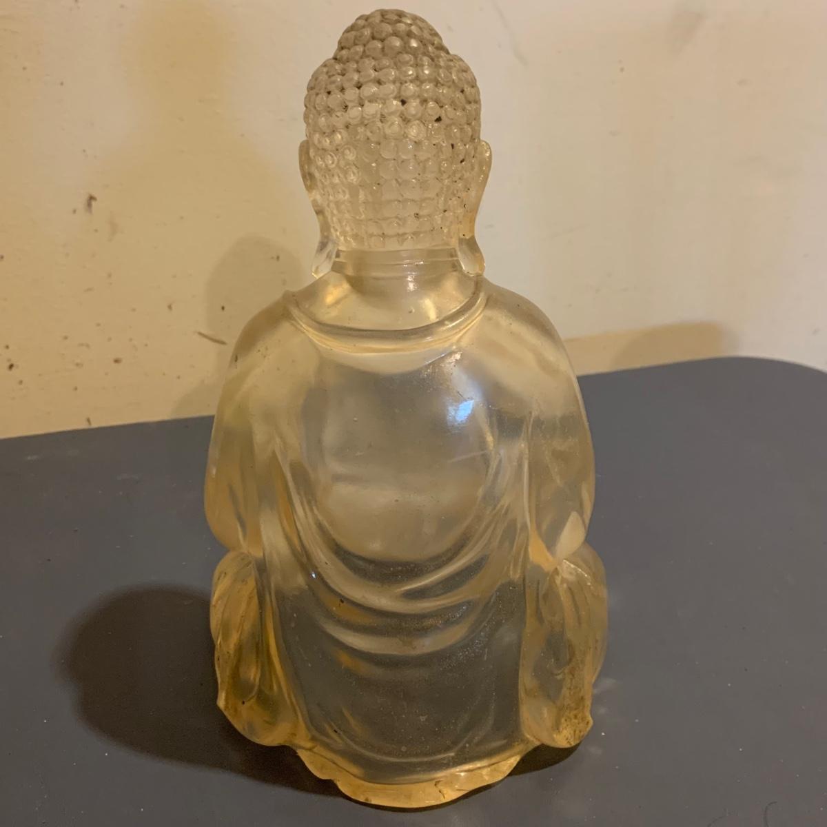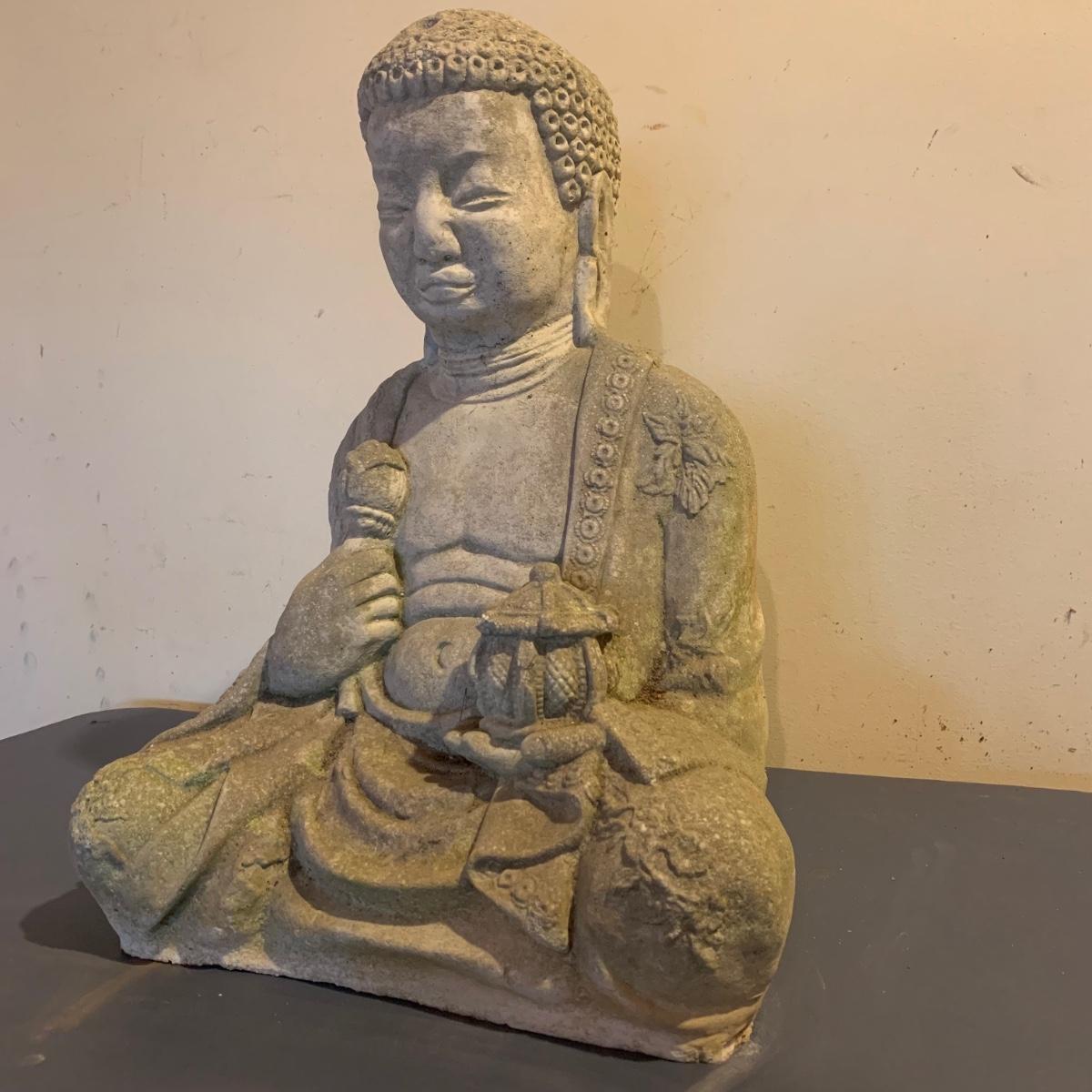 Cement Buddha garden statue measures approximately 14” x 9” x 18.5”H. Shows slight wear from being outside. Two other small Buddha or similar figures are included as well. One is clear hollow glass and the other is jade green made of an unknown material. The glass figure has some dust in its hair. Cement Buddha is very heavy.