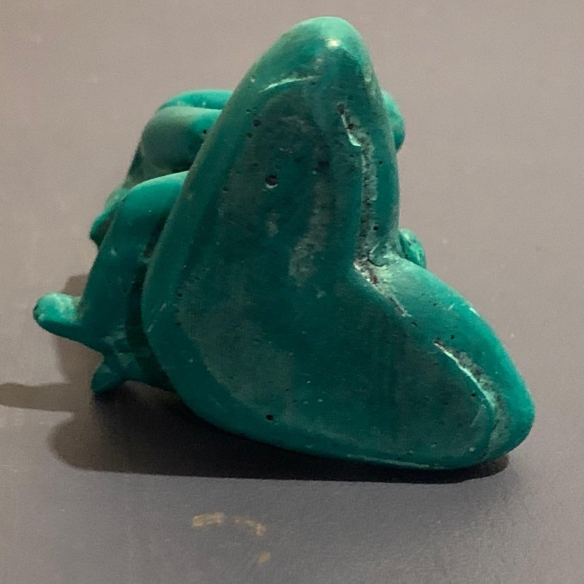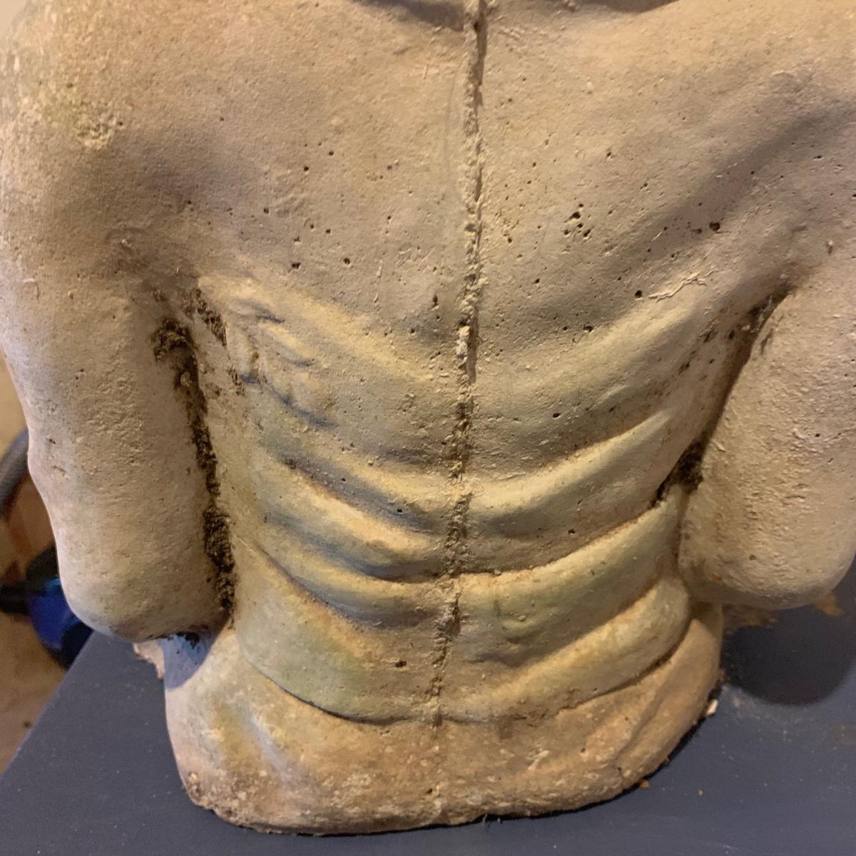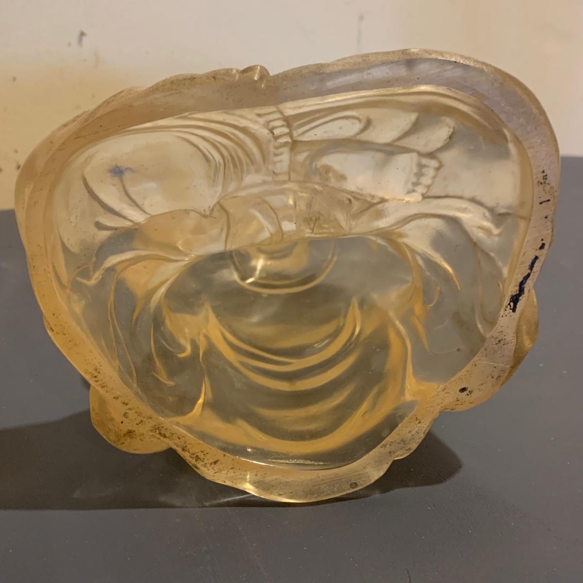 Cement Buddha garden statue measures approximately 14” x 9” x 18.5”H. Shows slight wear from being outside. Two other small Buddha or similar figures are included as well. One is clear hollow glass and the other is jade green made of an unknown material. The glass figure has some dust in its hair. Cement Buddha is very heavy.