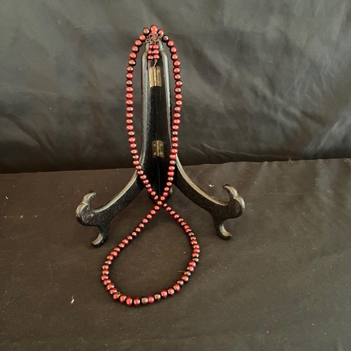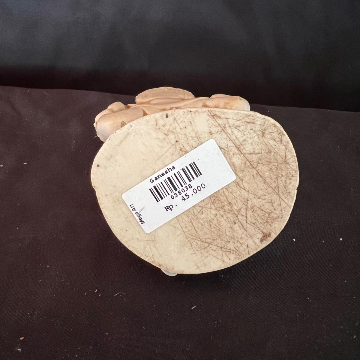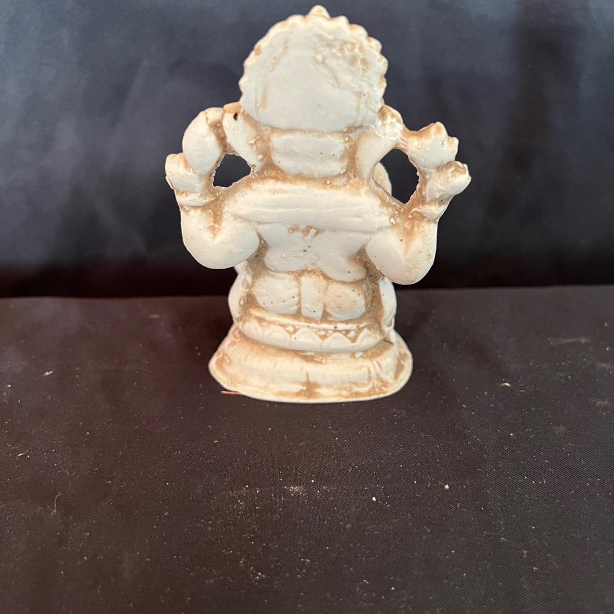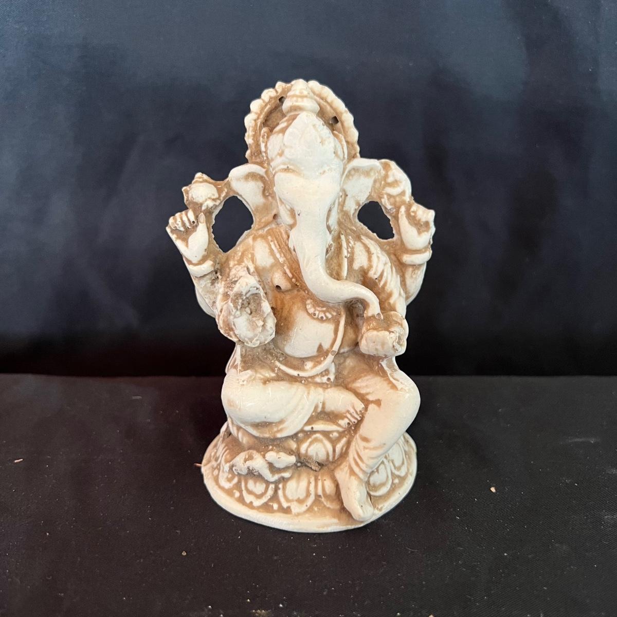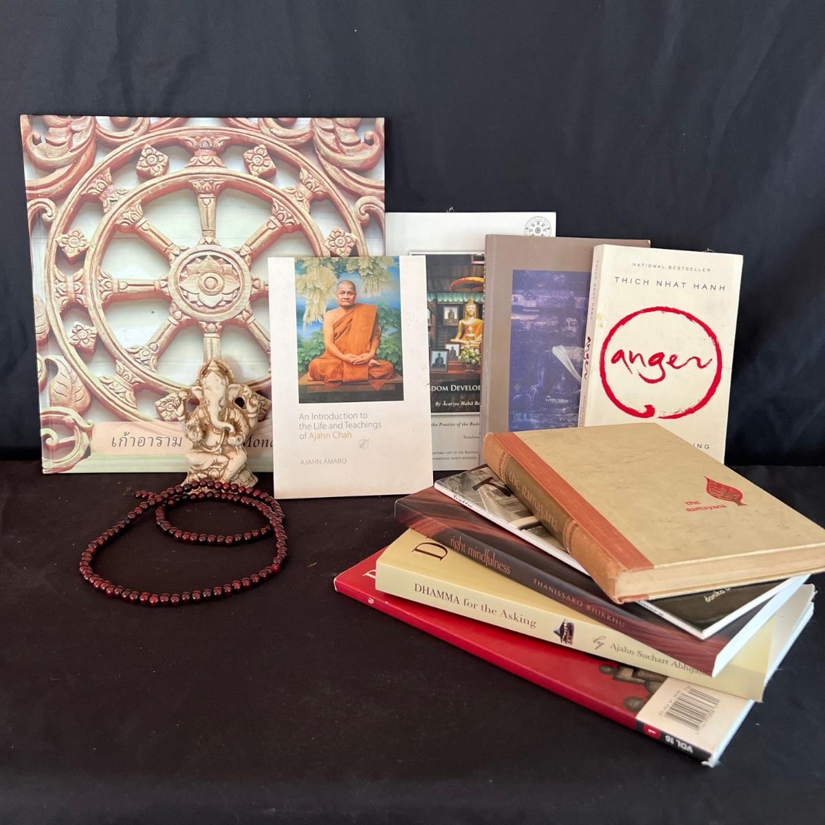 A ceramic Bhagwan Ganesha statue approximately 4.5” X 3”W is accompanied by a dark red Buddha beaded Necklace which is 27” long and strung on elastic plus ten miscellaneous Buddhist books.