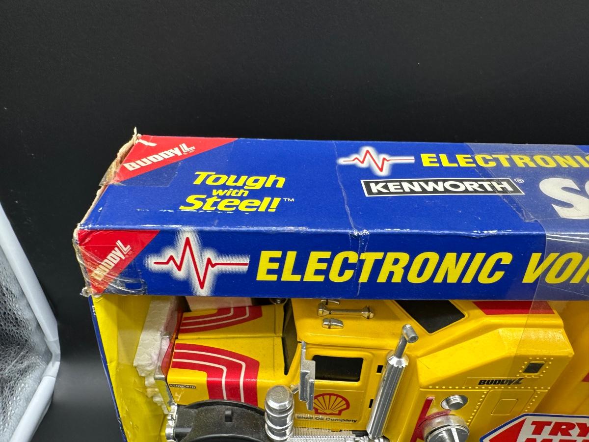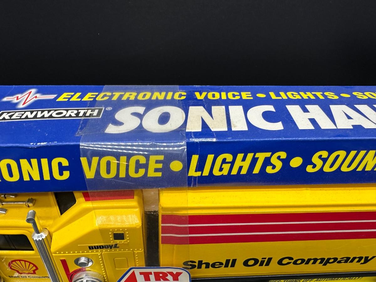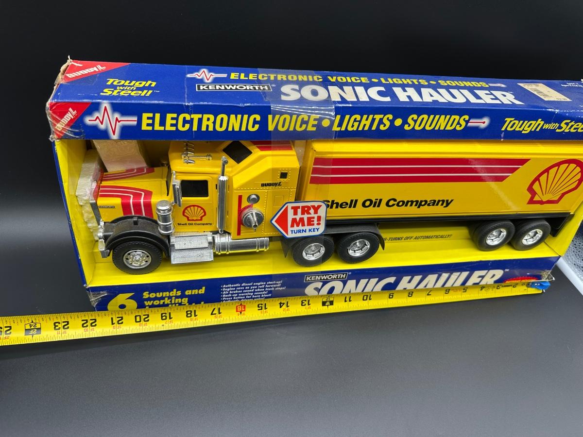 Large Buddy L Kenworth “Sonic Hauler” semi truck with Shell Oil Company graphics. This is the electronic version featuring lights, sounds, and engine effects, housed in the original retail box.