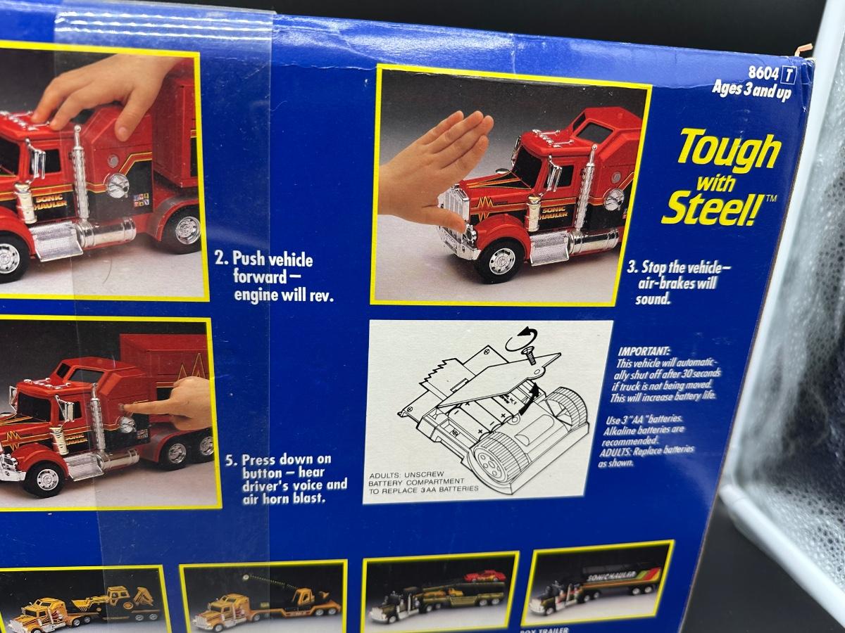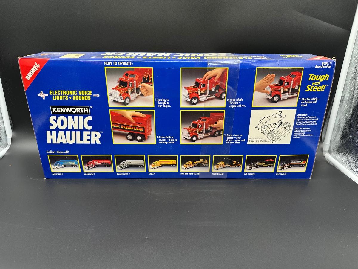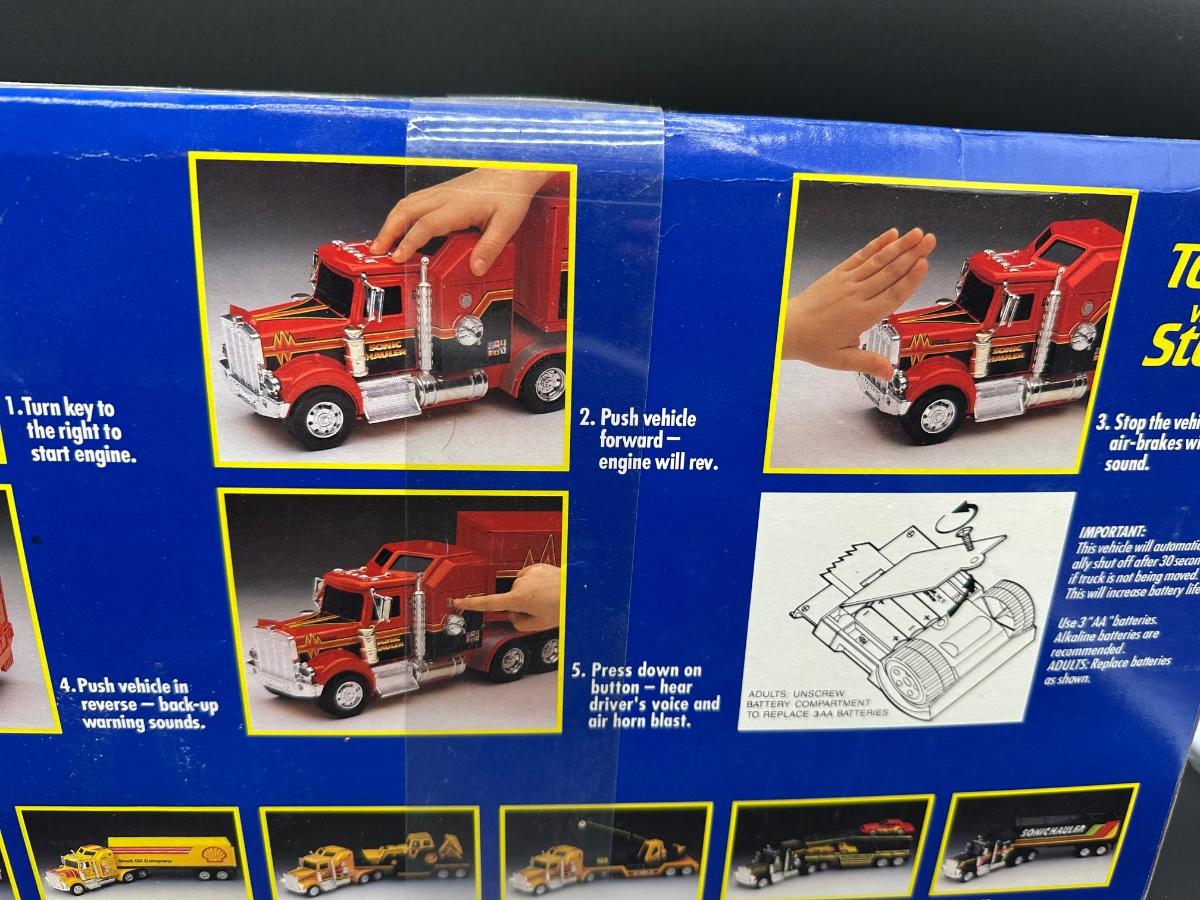 Large Buddy L Kenworth “Sonic Hauler” semi truck with Shell Oil Company graphics. This is the electronic version featuring lights, sounds, and engine effects, housed in the original retail box.