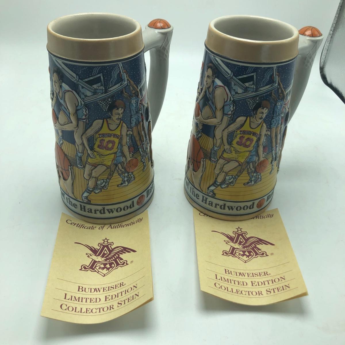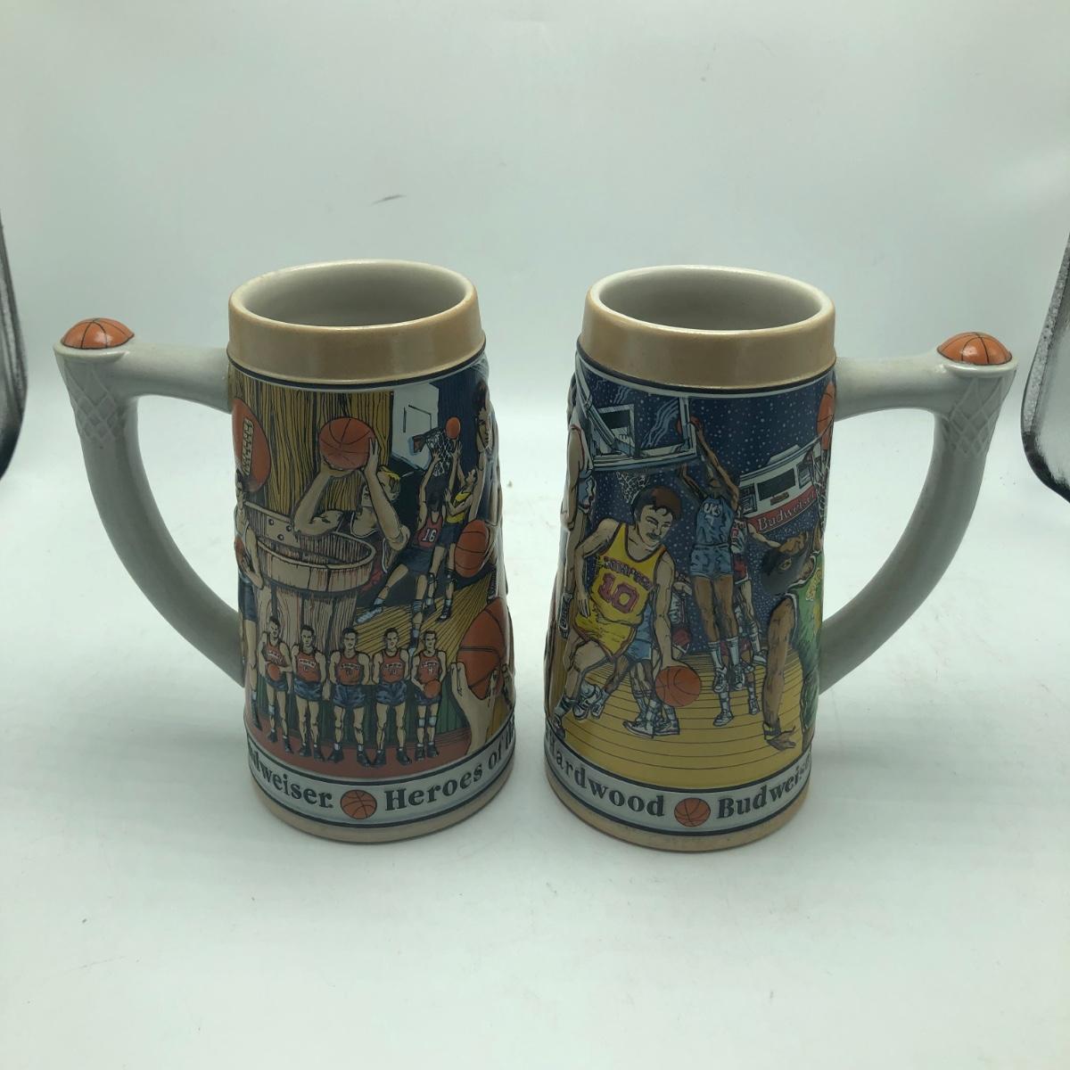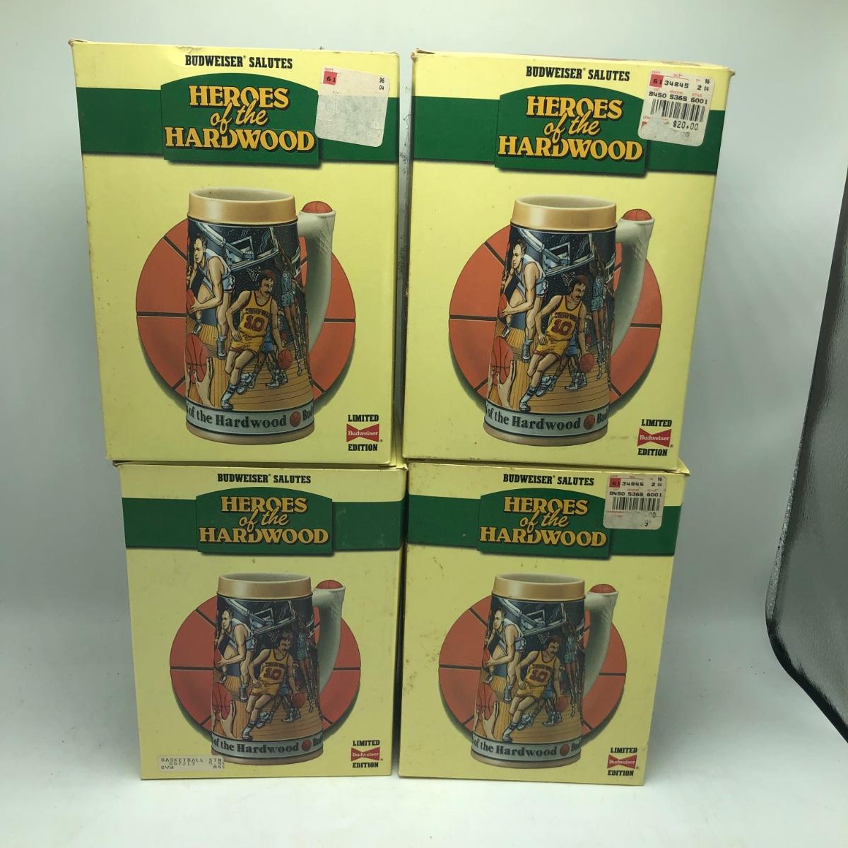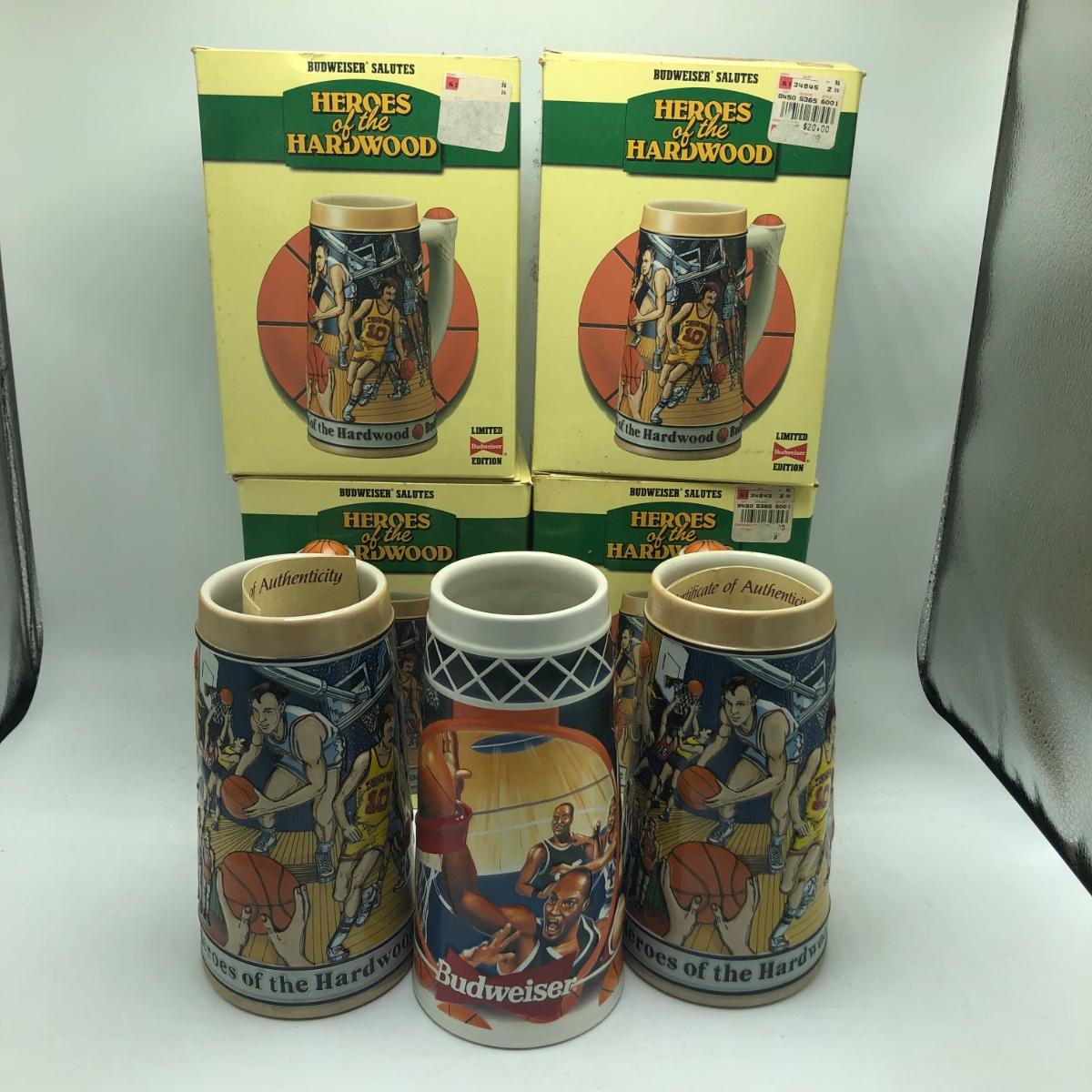 Lot contains seven Budweiser basketball steins including six matching Hero’s of the Hardwoods mugs with COAs with four in original box. Mugs measure 4” x 6” x 7.5”