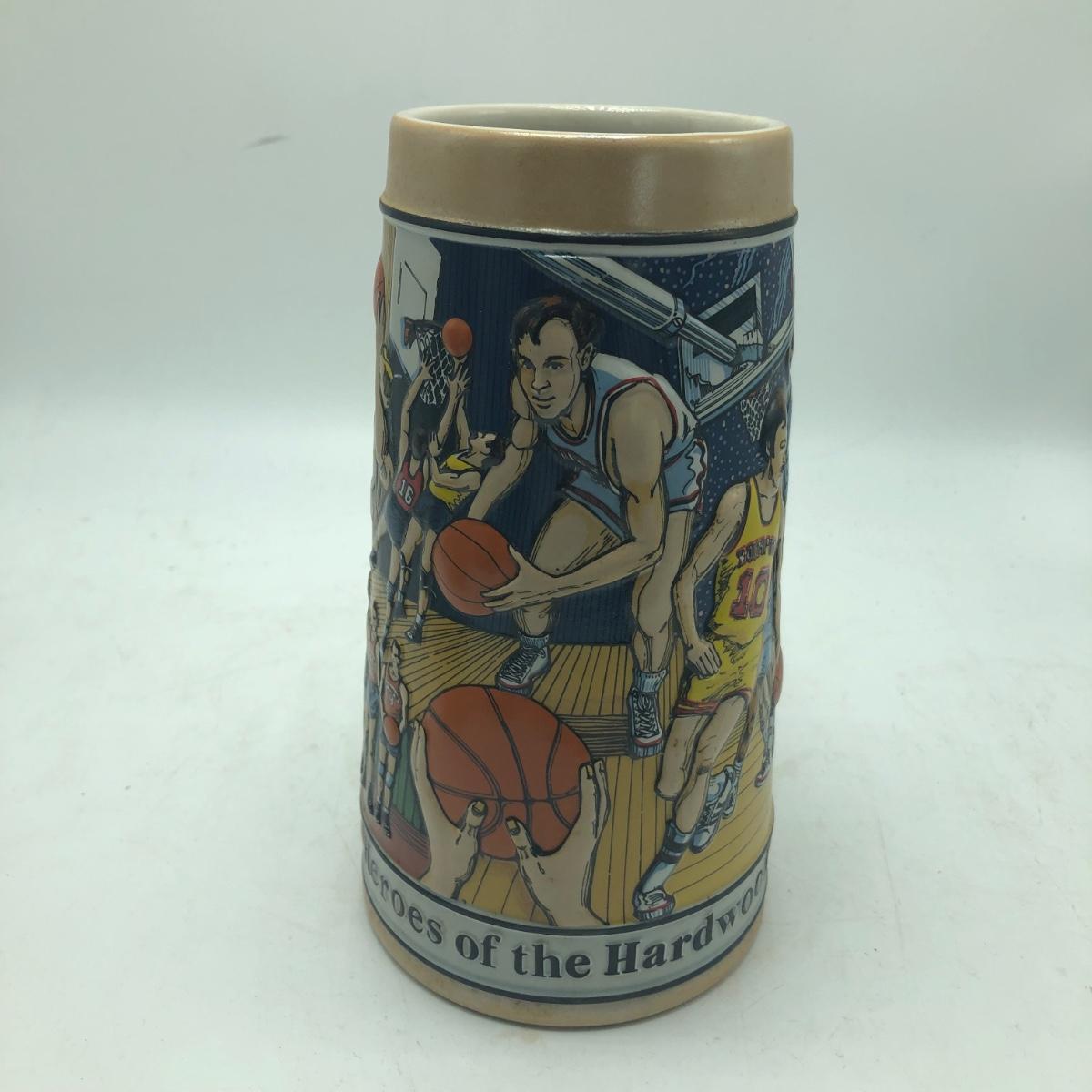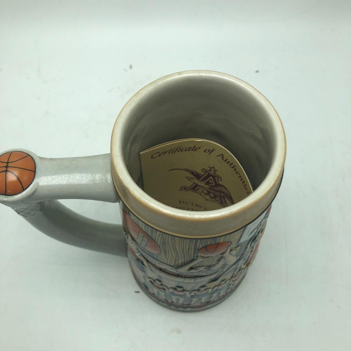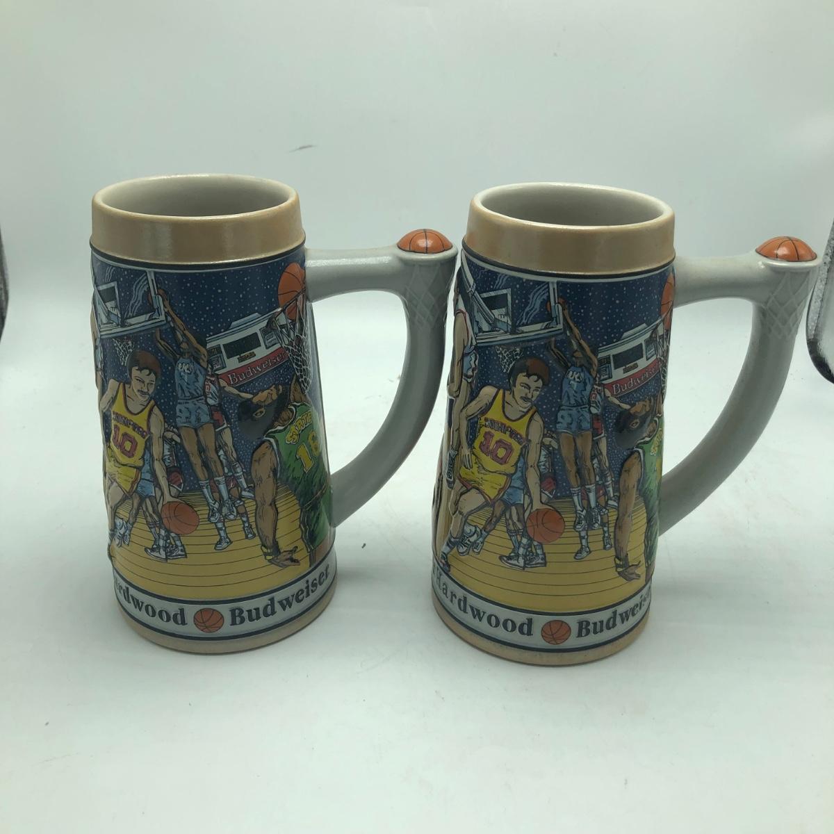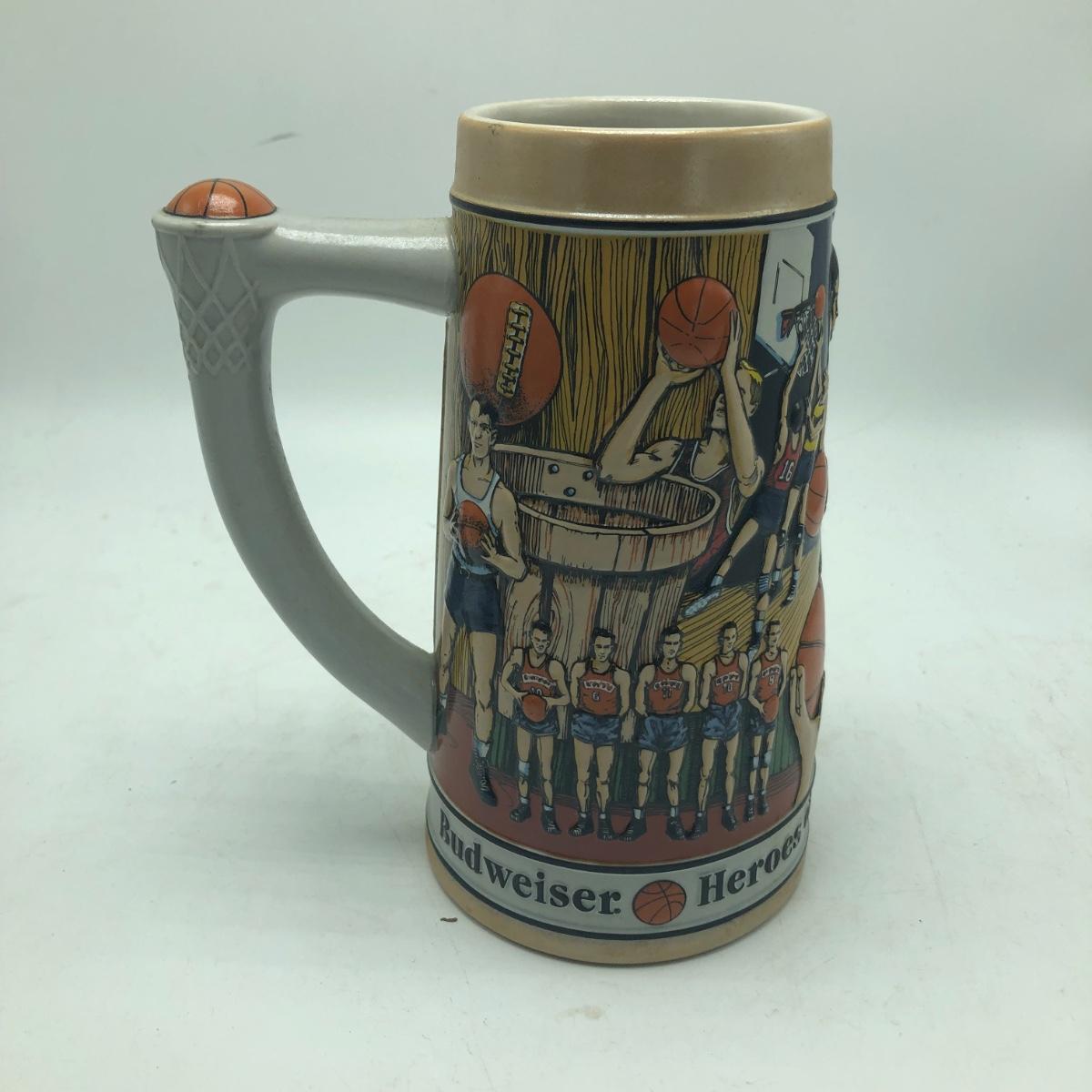 Lot contains seven Budweiser basketball steins including six matching Hero’s of the Hardwoods mugs with COAs with four in original box. Mugs measure 4” x 6” x 7.5”