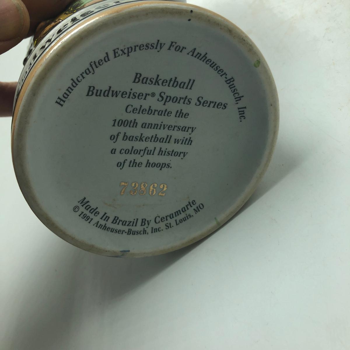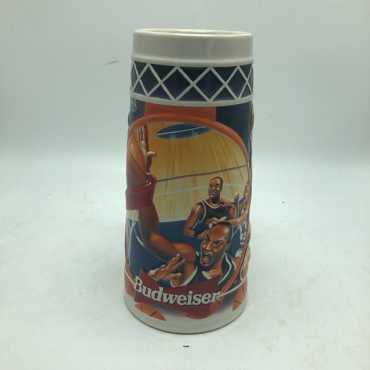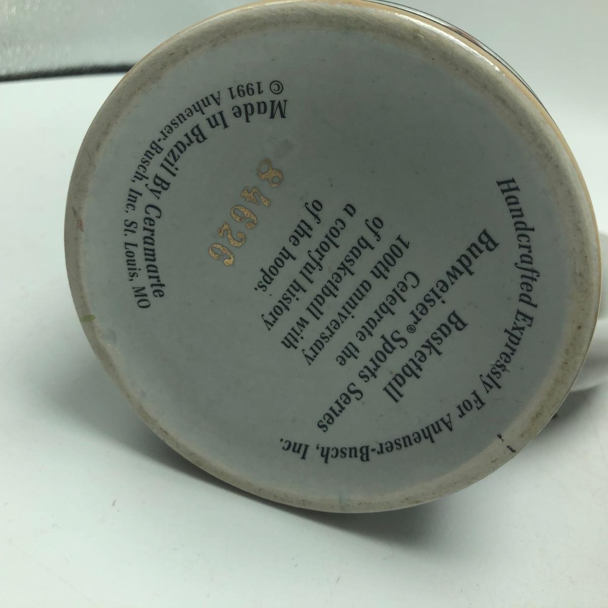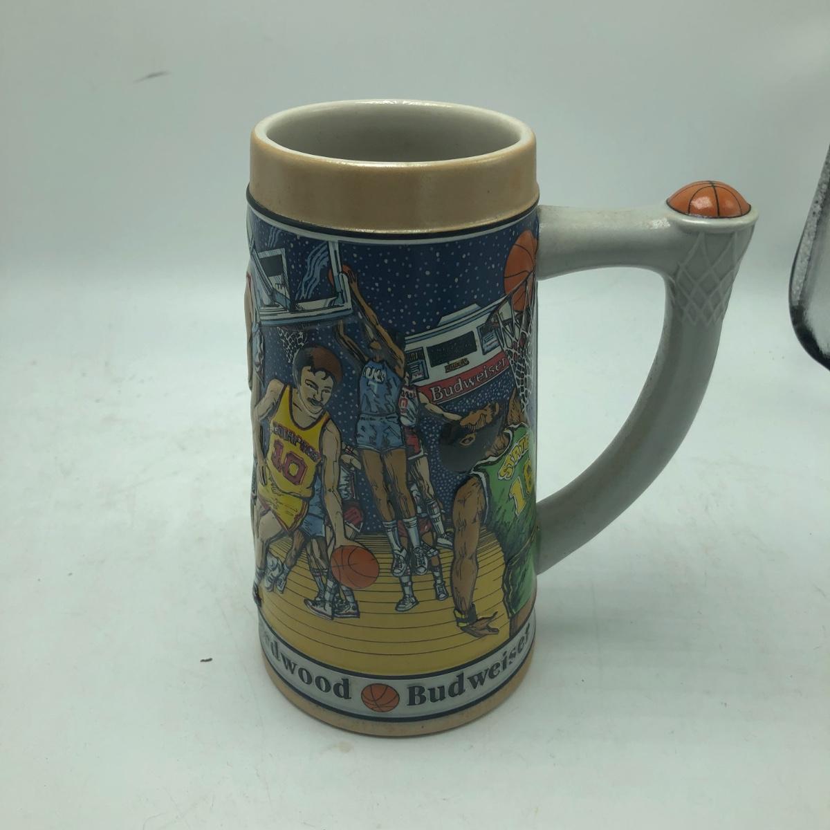Lot contains seven Budweiser basketball steins including six matching Hero’s of the Hardwoods mugs with COAs with four in original box. Mugs measure 4” x 6” x 7.5”