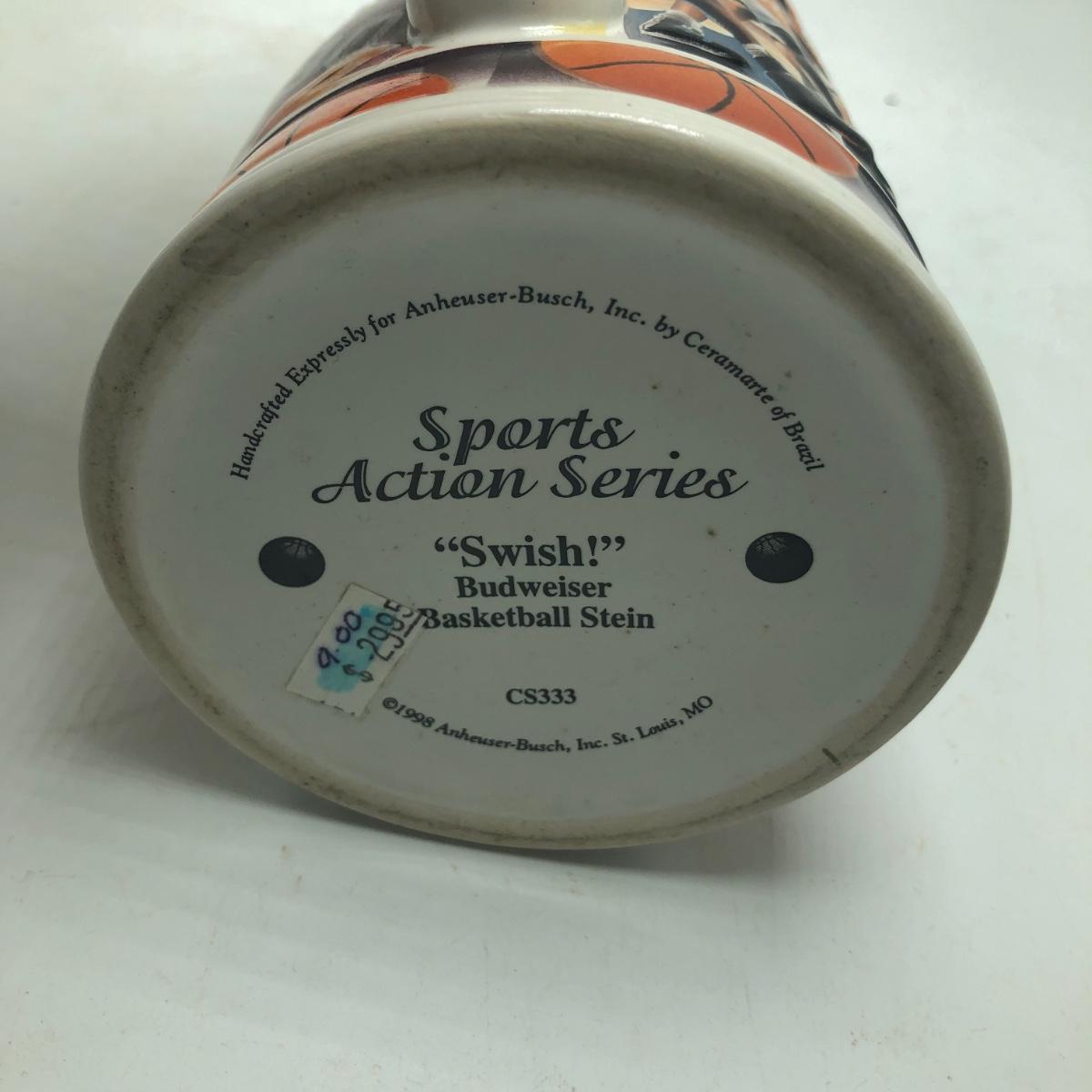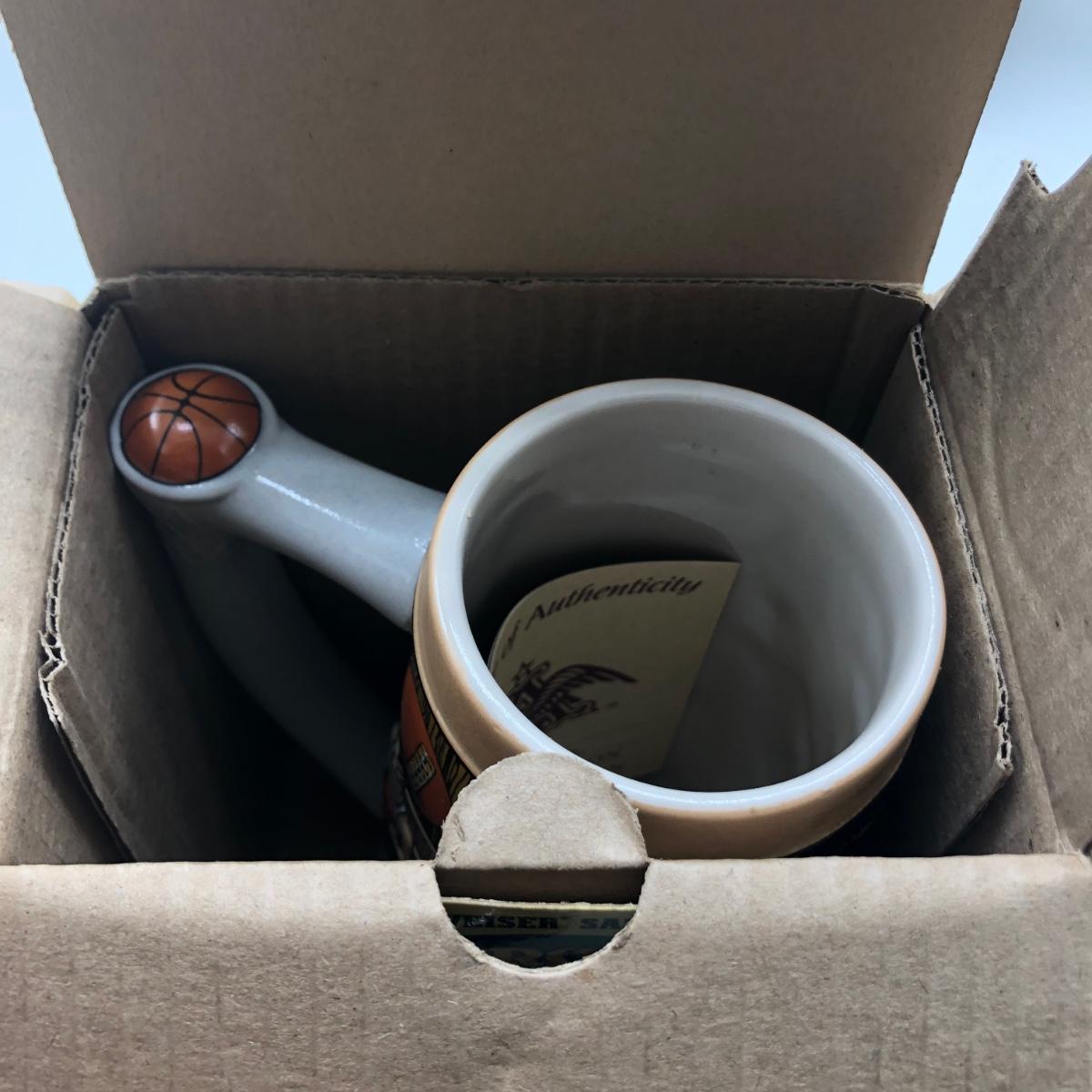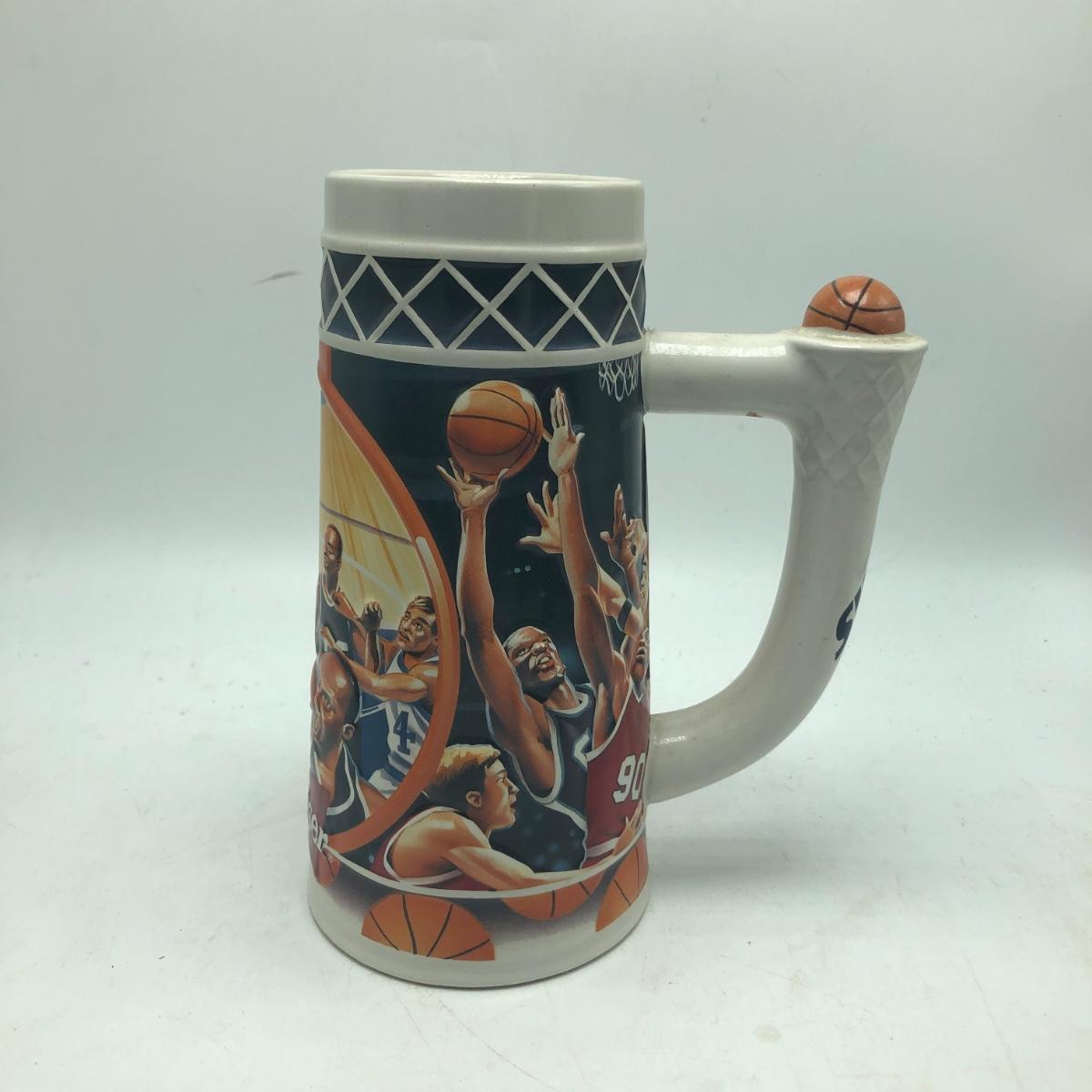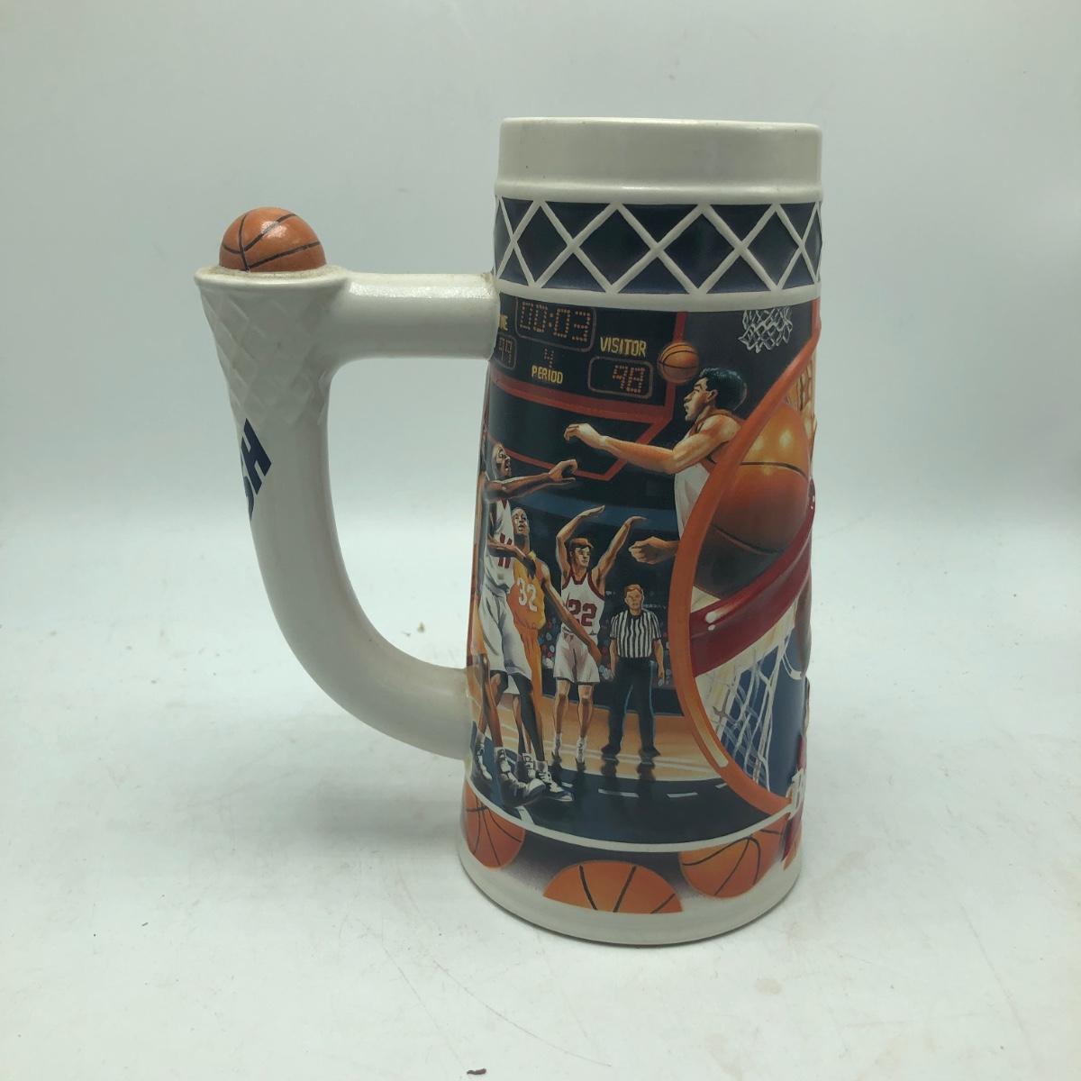 Lot contains seven Budweiser basketball steins including six matching Hero’s of the Hardwoods mugs with COAs with four in original box. Mugs measure 4” x 6” x 7.5”