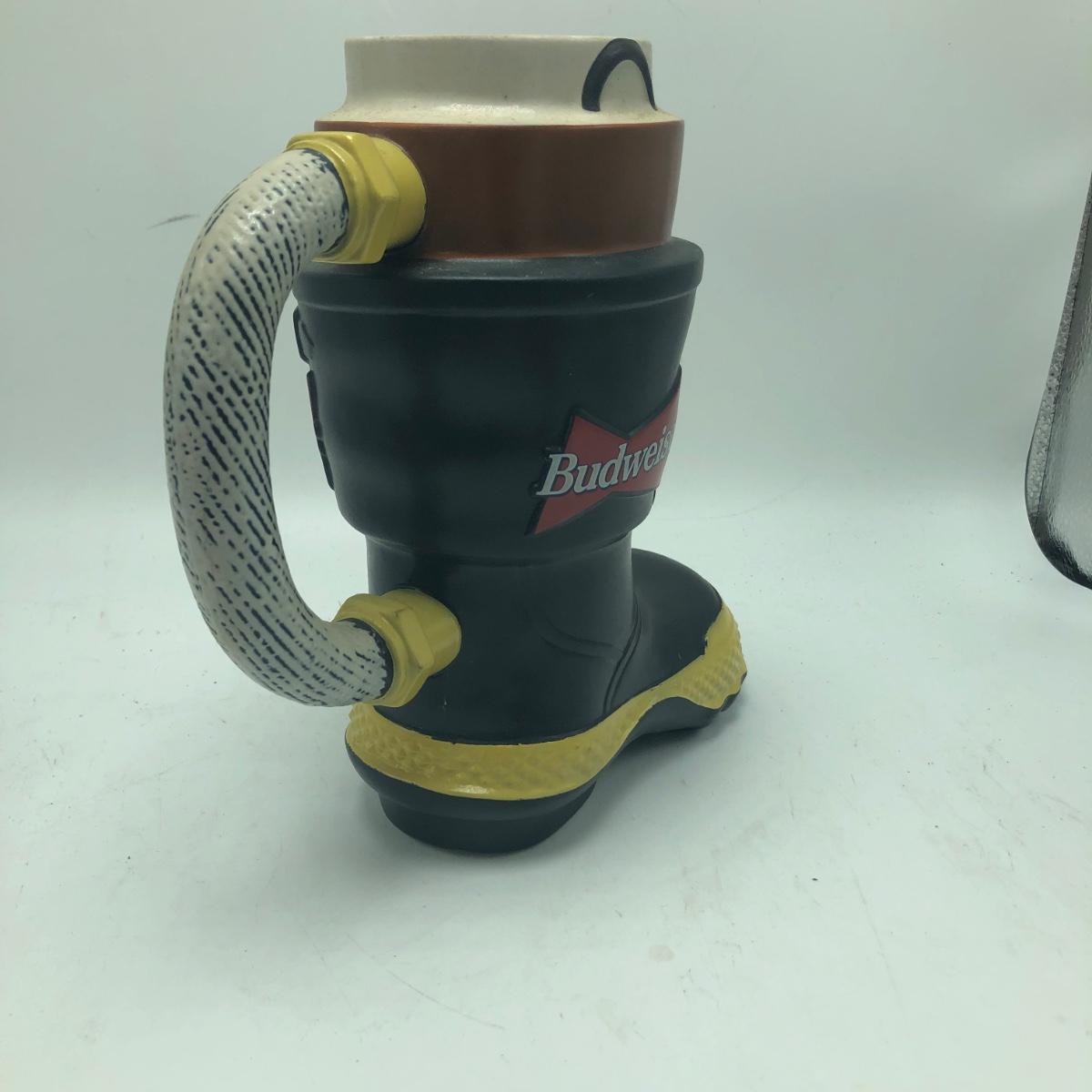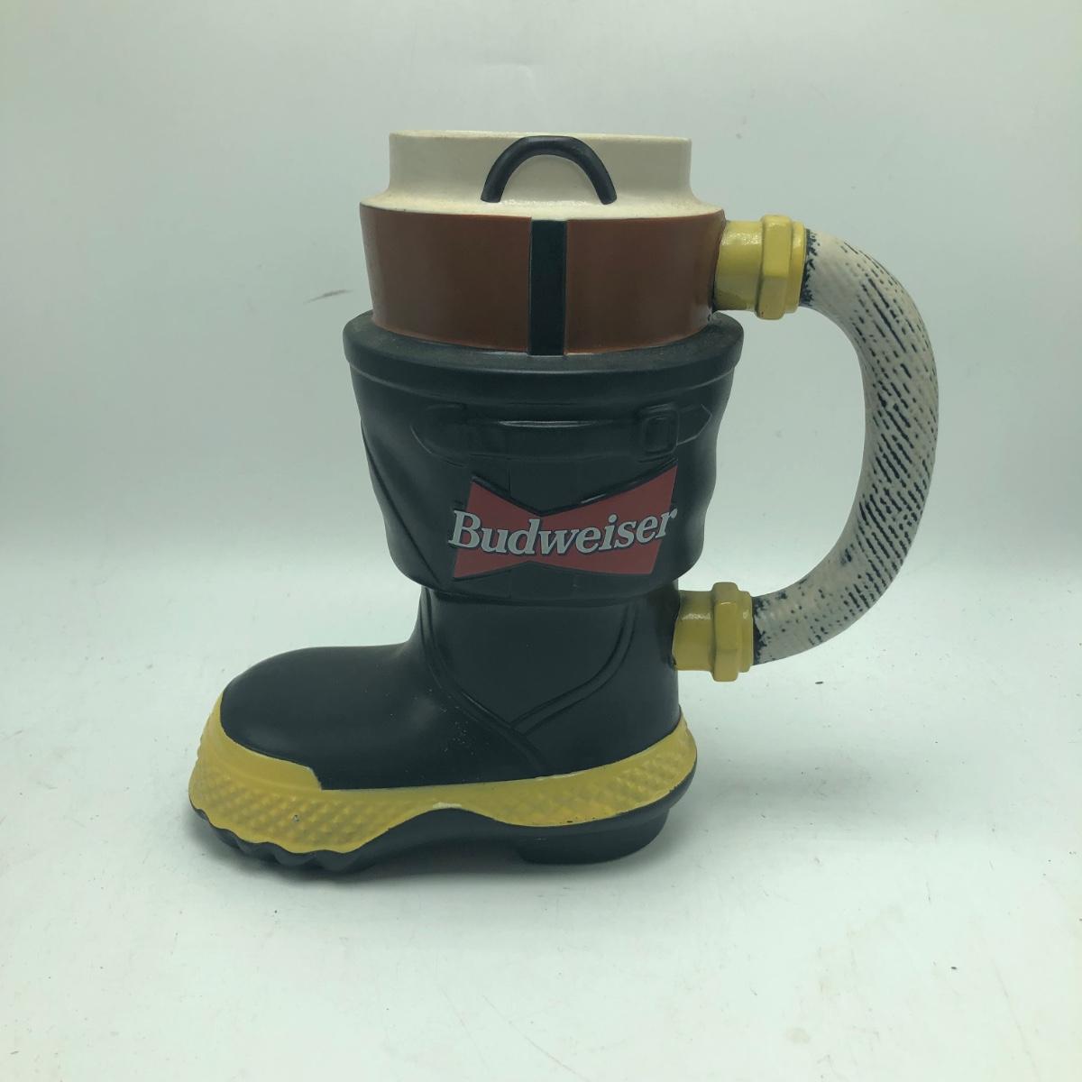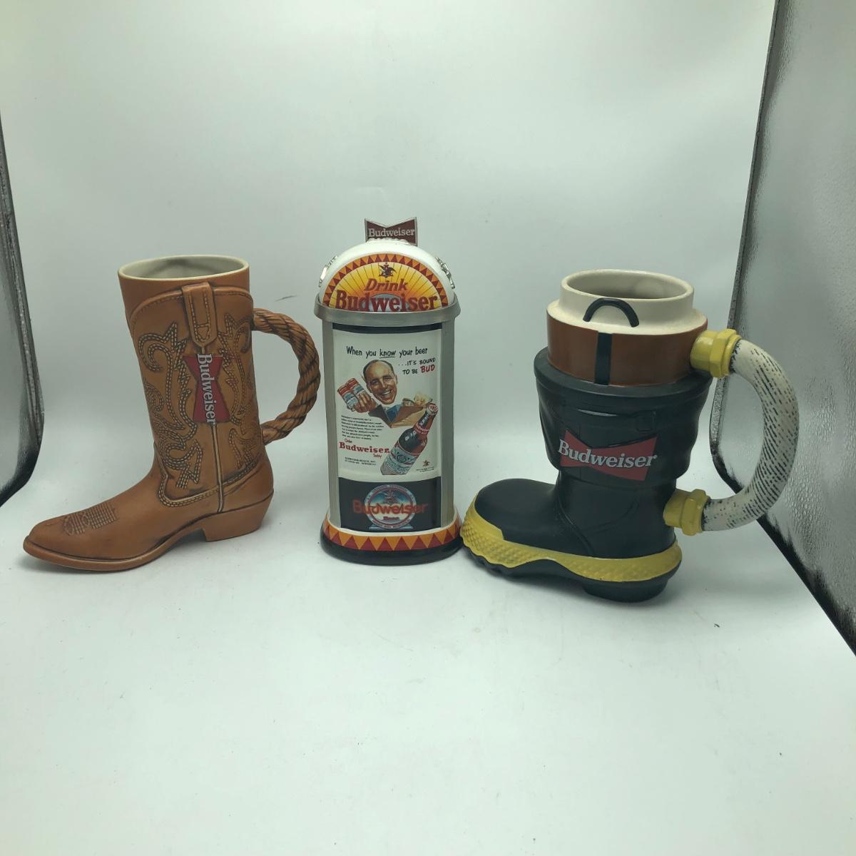 Lot includes Budweiser Cowboy boot stein, Firefighter stein. And a Budweiser Today stein. Largest stein measures 4.5” x 6” x 9”.