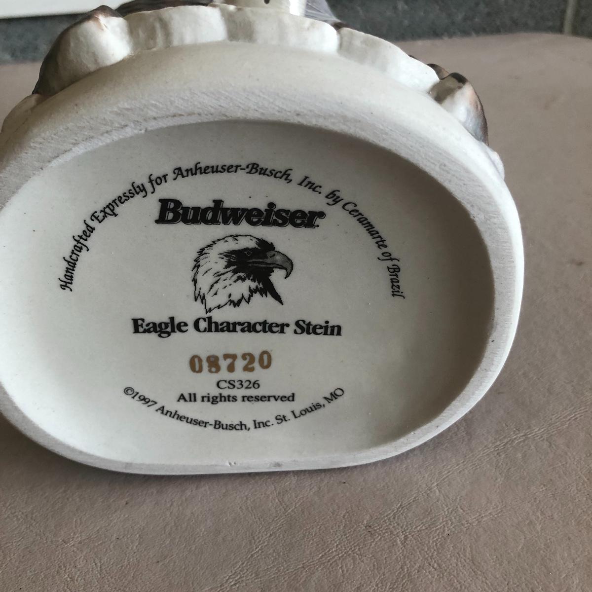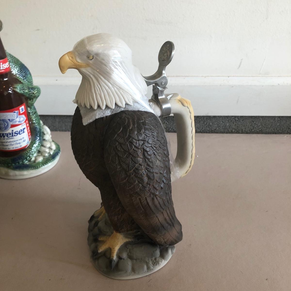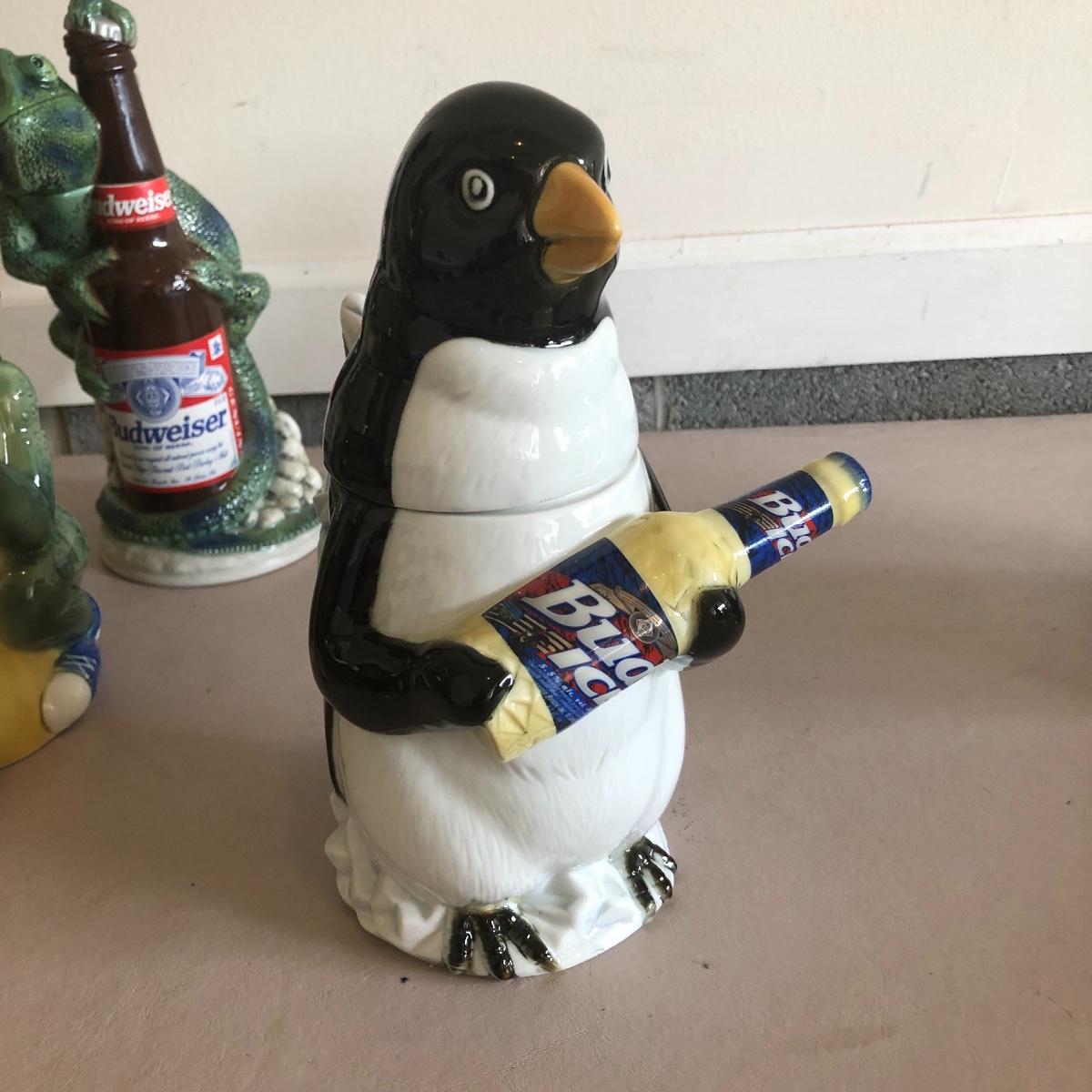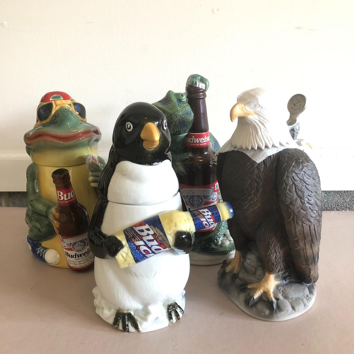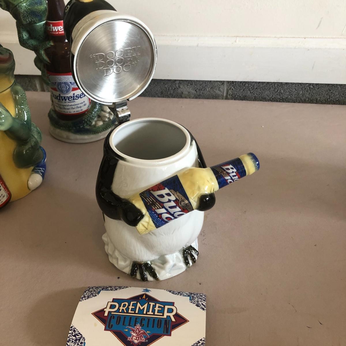 4 ceramic Budweiser Character Steins. The eagle and penguin Steins come with their boxes. Eagle measures 5” x 10”.