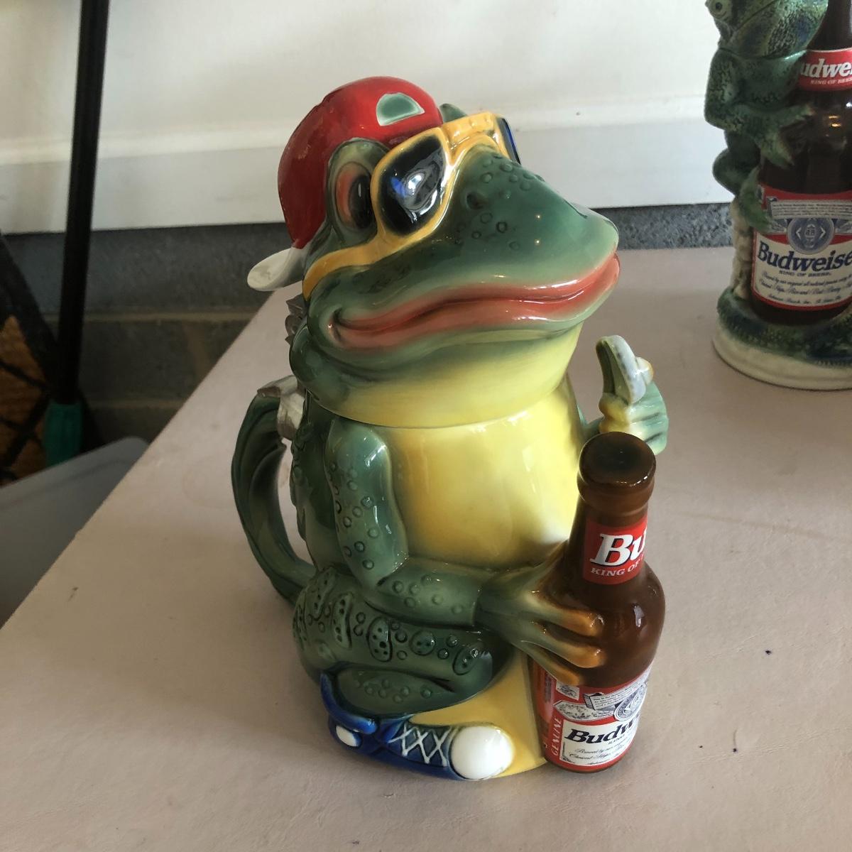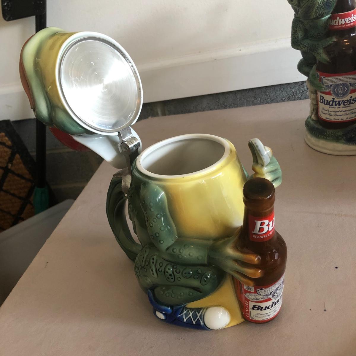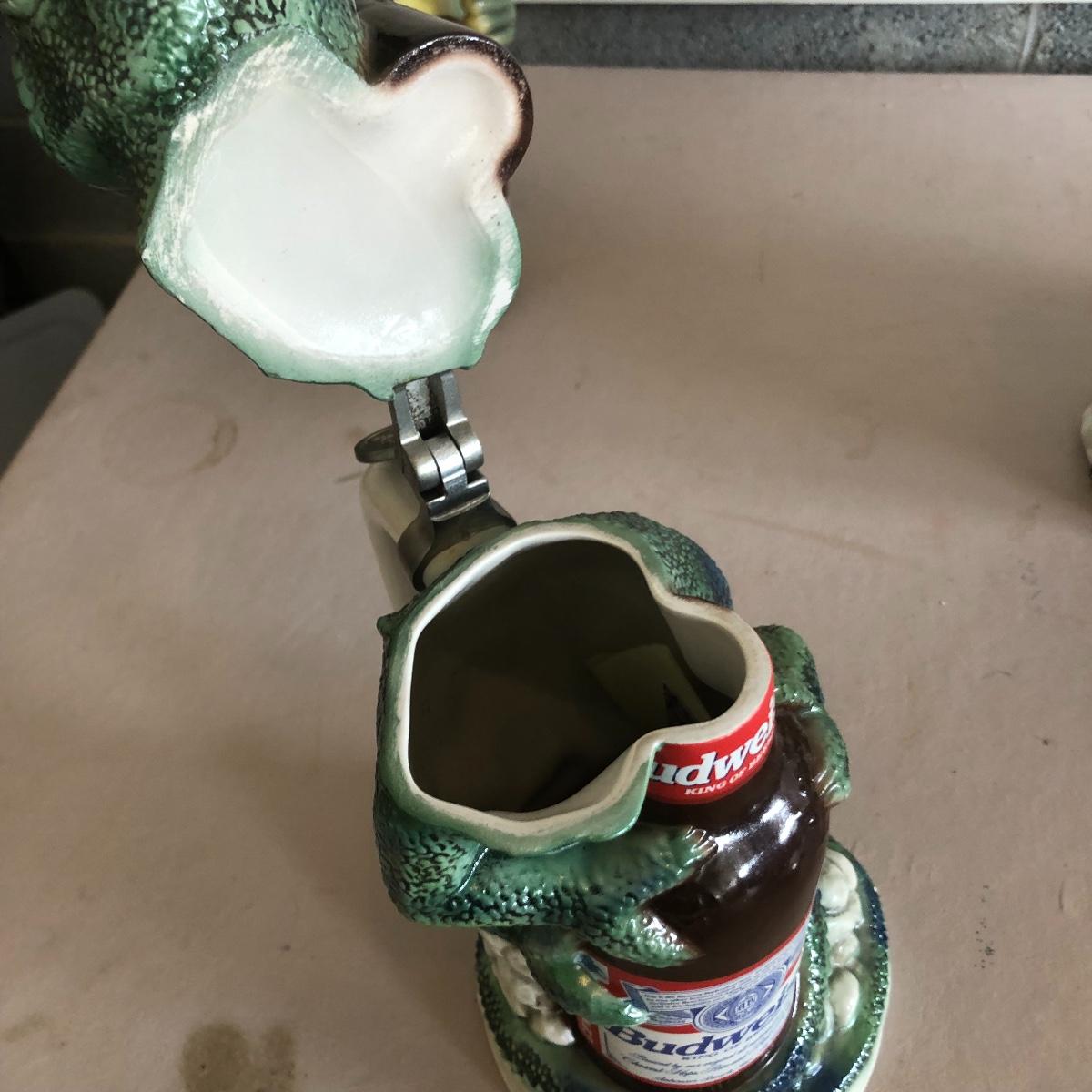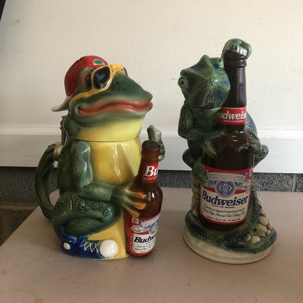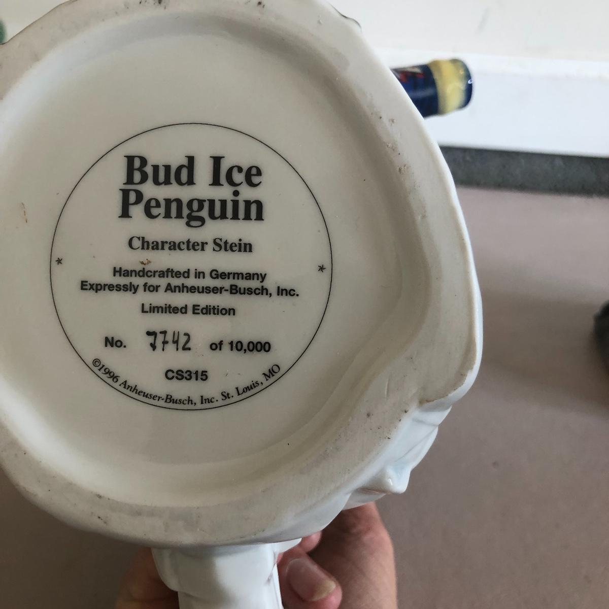 4 ceramic Budweiser Character Steins. The eagle and penguin Steins come with their boxes. Eagle measures 5” x 10”.